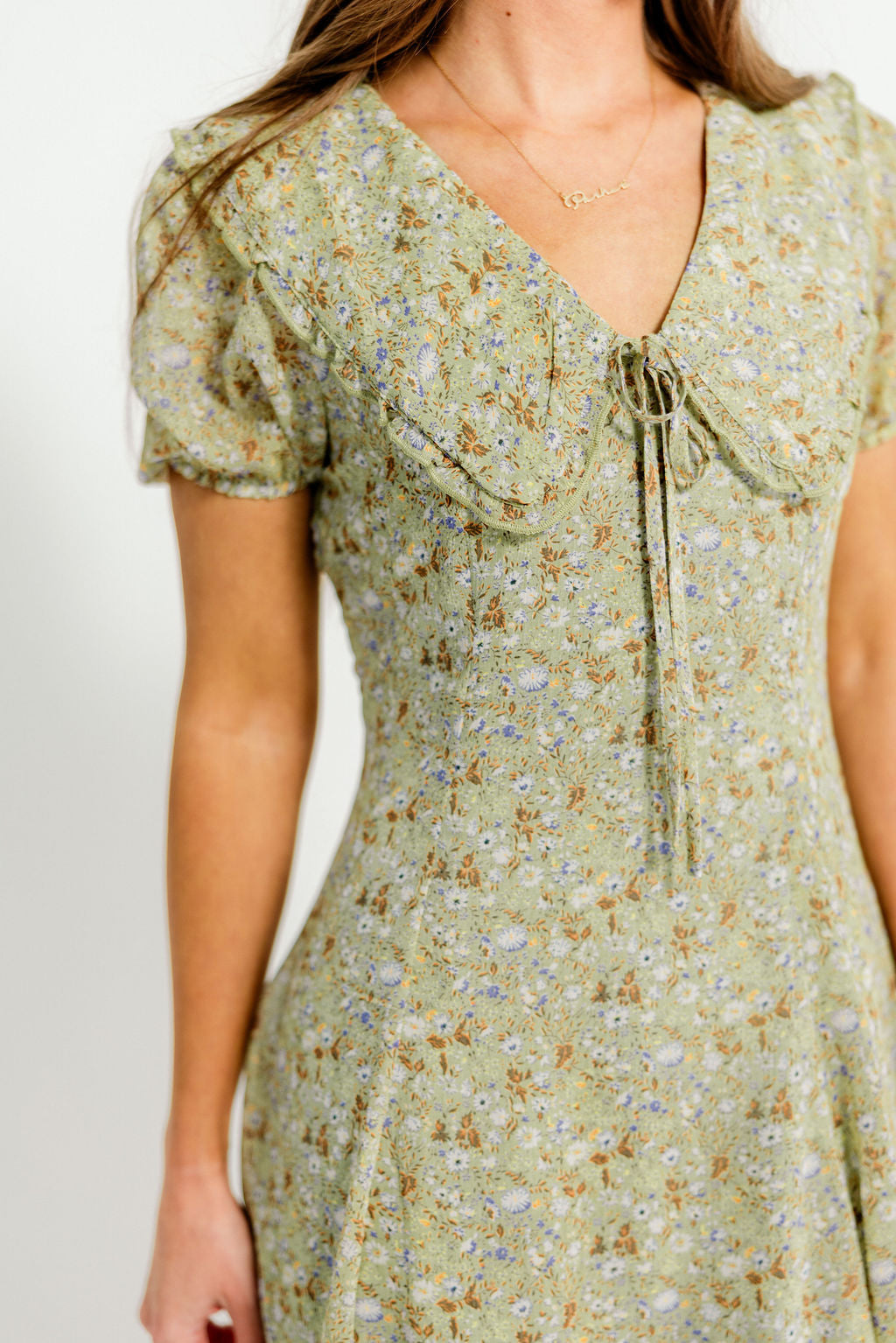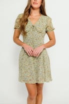 GARMENT DETAILS: Elegant fit-and-flare mini dress with statement collar, short puffed sleeves, and a dainty front tie detail. Fully lined.