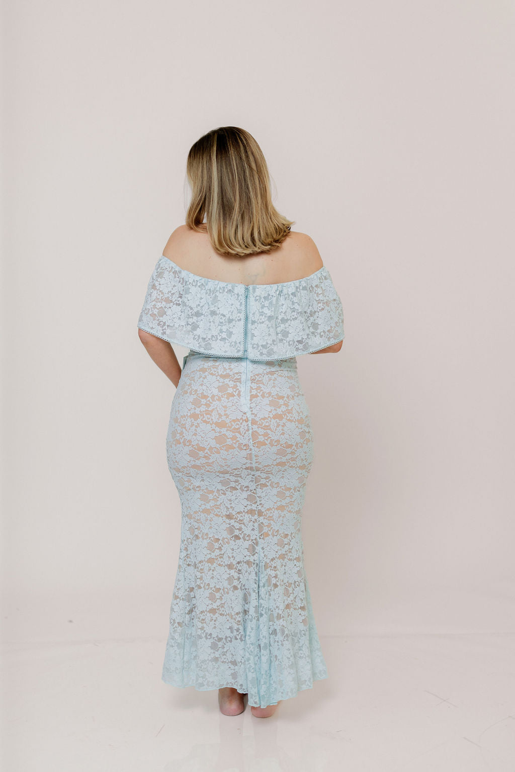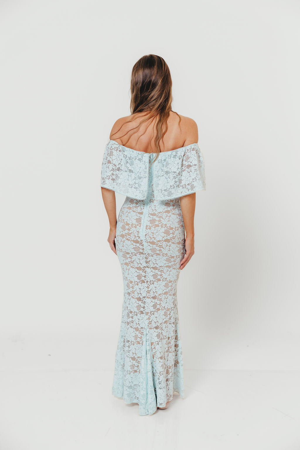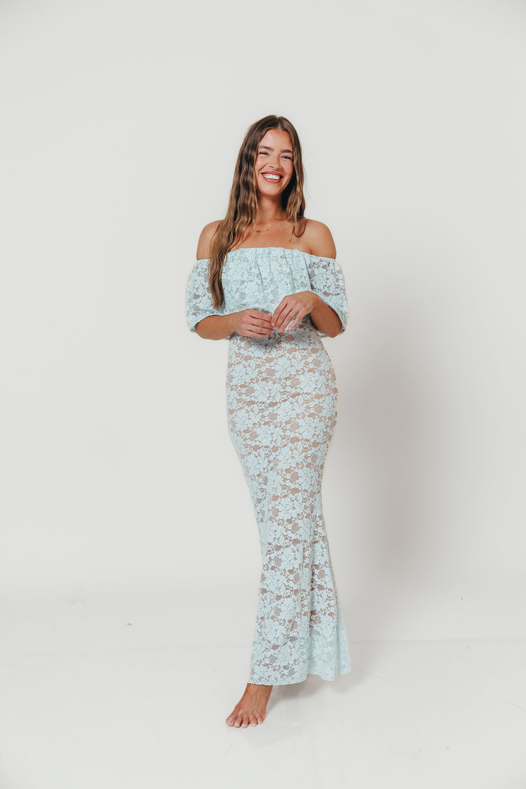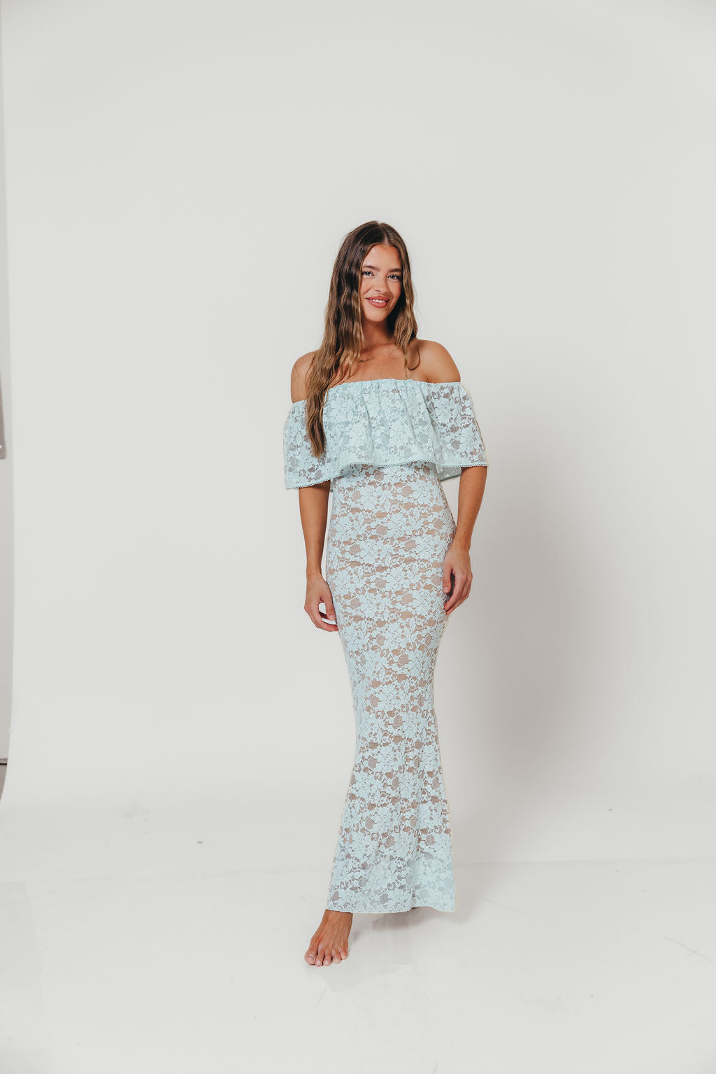 GARMENT DETAILS: Romantic lace-construction maxi dress with a dainty eyelet-trimmed off-the-shoulder neckline and a stretchy, fitted silhouette with a flared skirt. Fully lined.