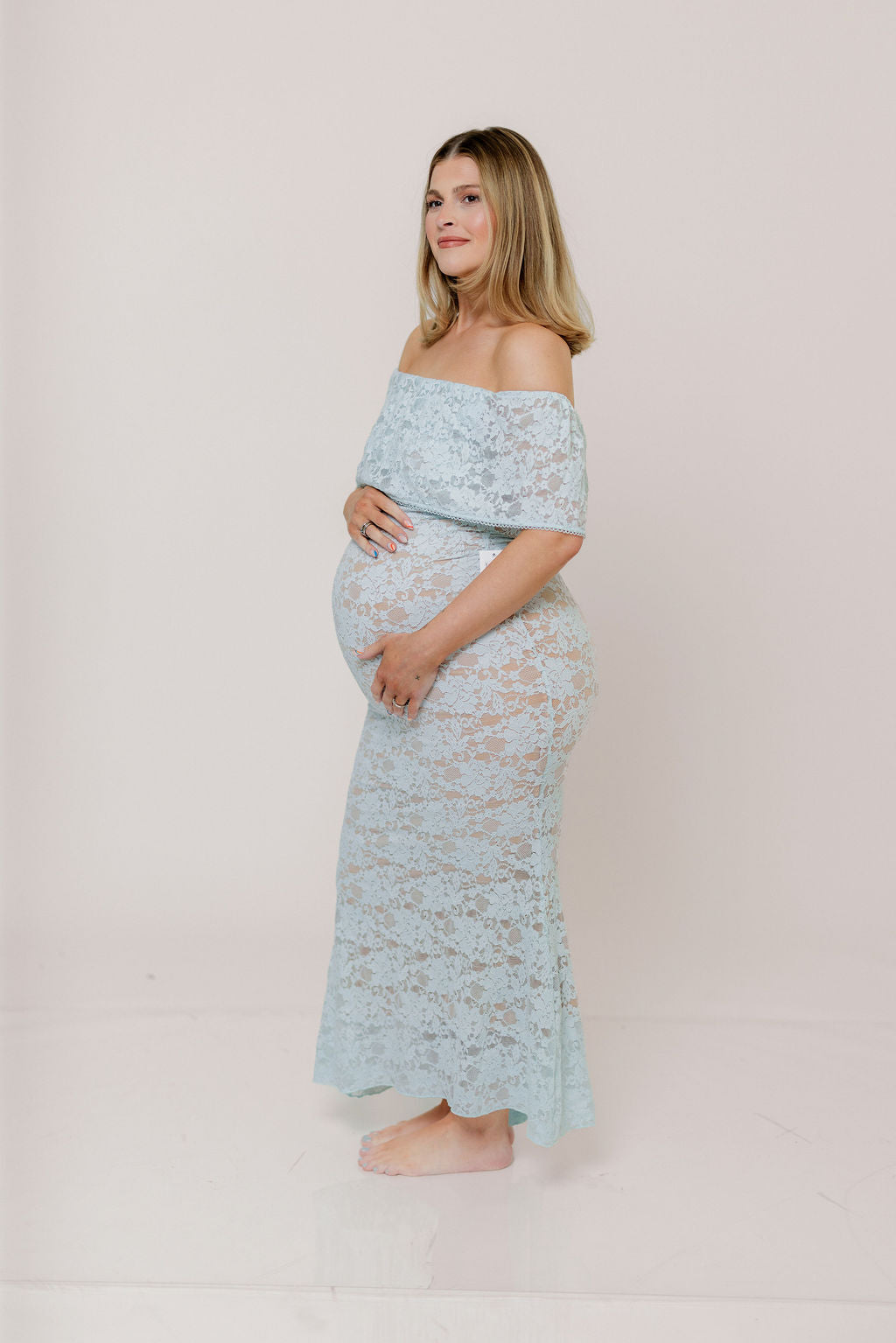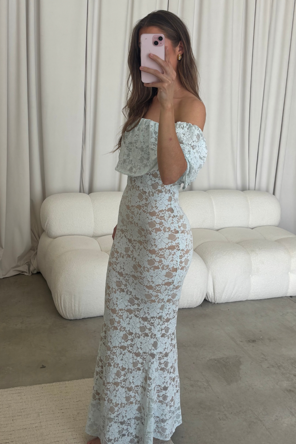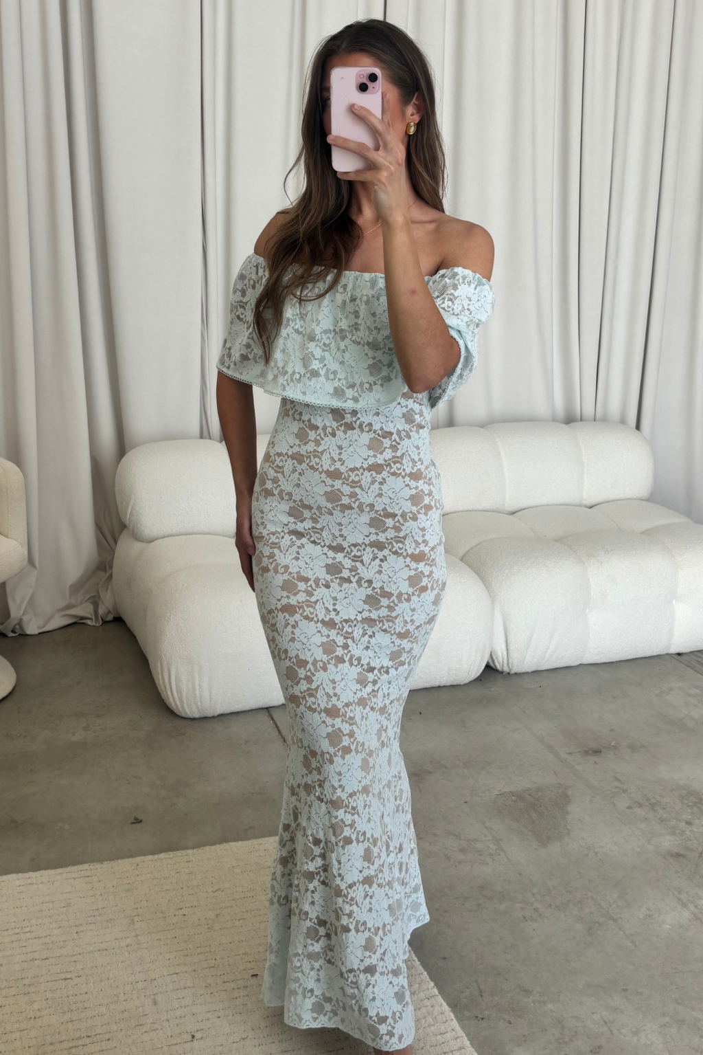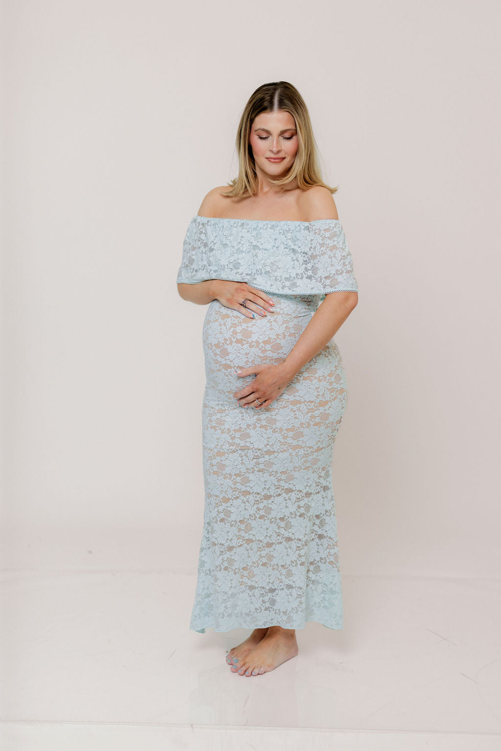 GARMENT DETAILS: Romantic lace-construction maxi dress with a dainty eyelet-trimmed off-the-shoulder neckline and a stretchy, fitted silhouette with a flared skirt. Fully lined.