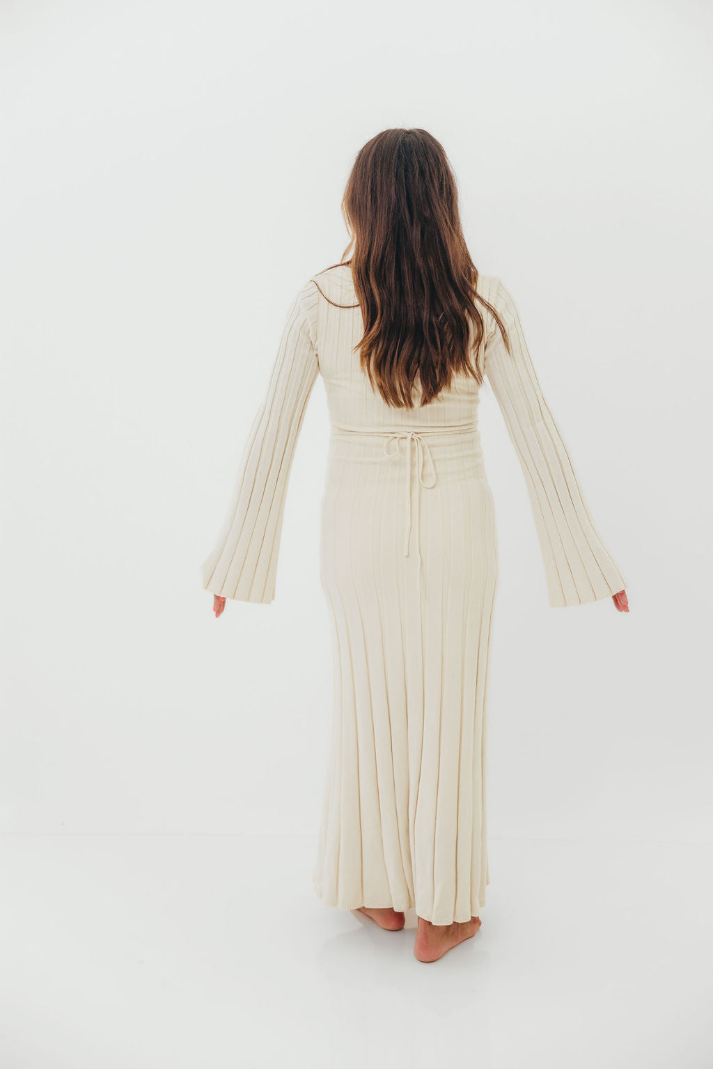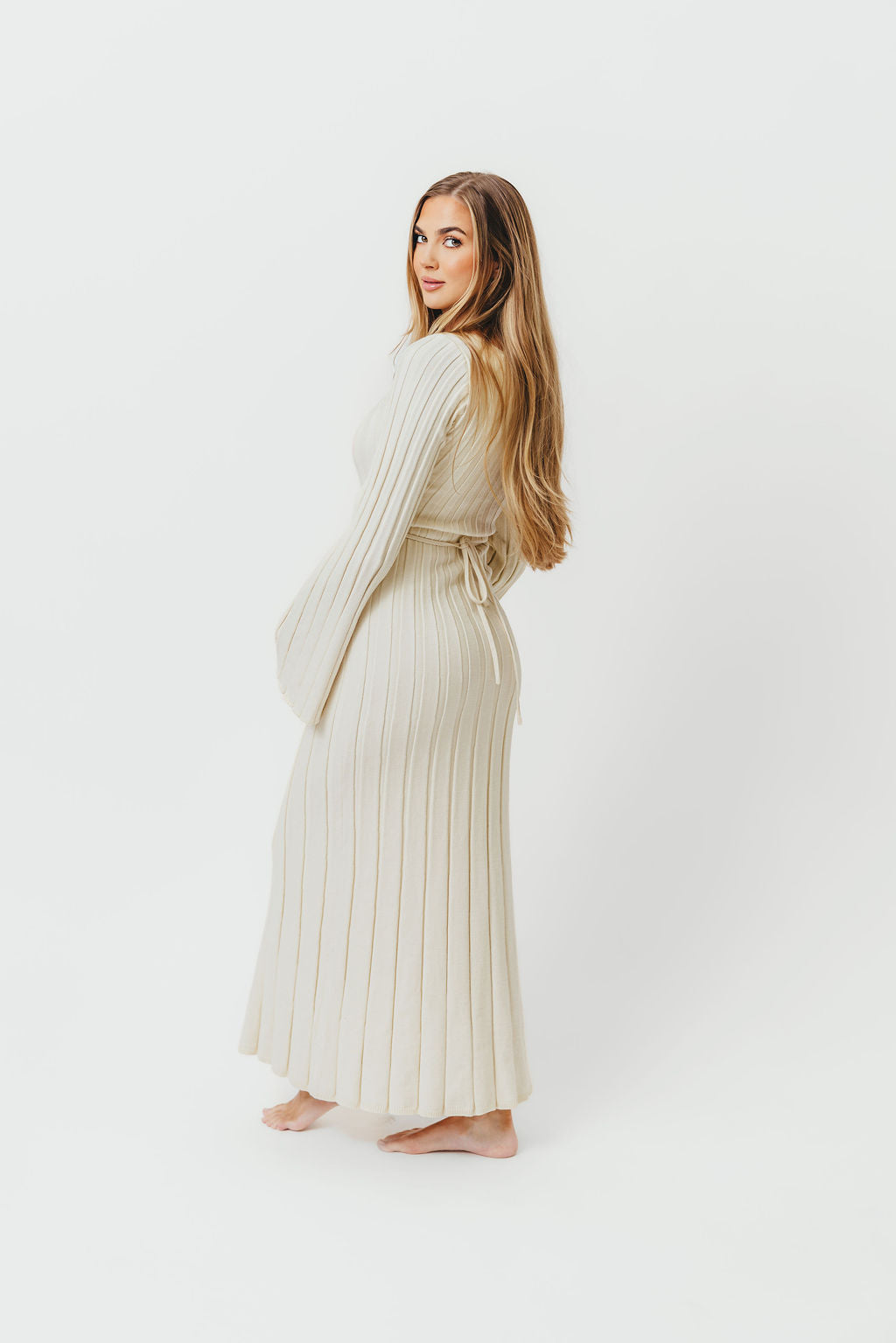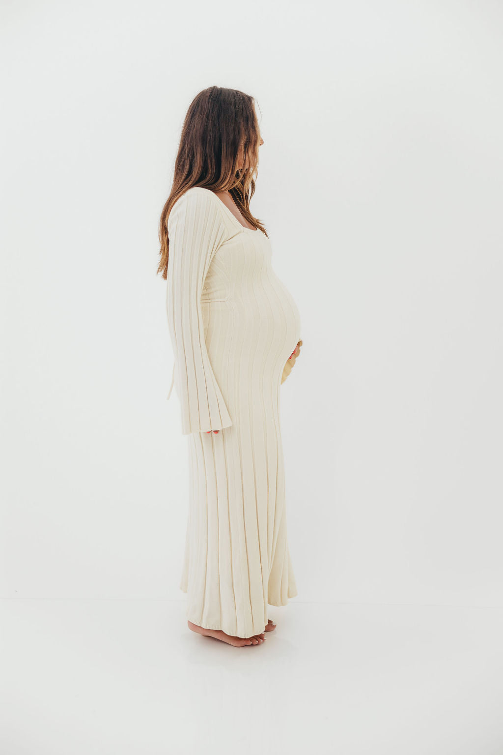 GARMENT DETAILS: Glamorous ribbed knit maxi dress with flattering square neckline, long flared sleeves, and a feminine fit-and-flare silhouette. Buttercream and Cream colorways are fully lined.