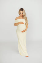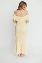 GARMENT DETAILS: Sleek and fitted maxi dress in a luxuriously soft premium knit. Features a folded off-the-shoulder neckline with short sleeves and a fit-and-flare design that is fitted through the hips and thighs and flares at the knee. Fully lined for maximum coverage and comfort.