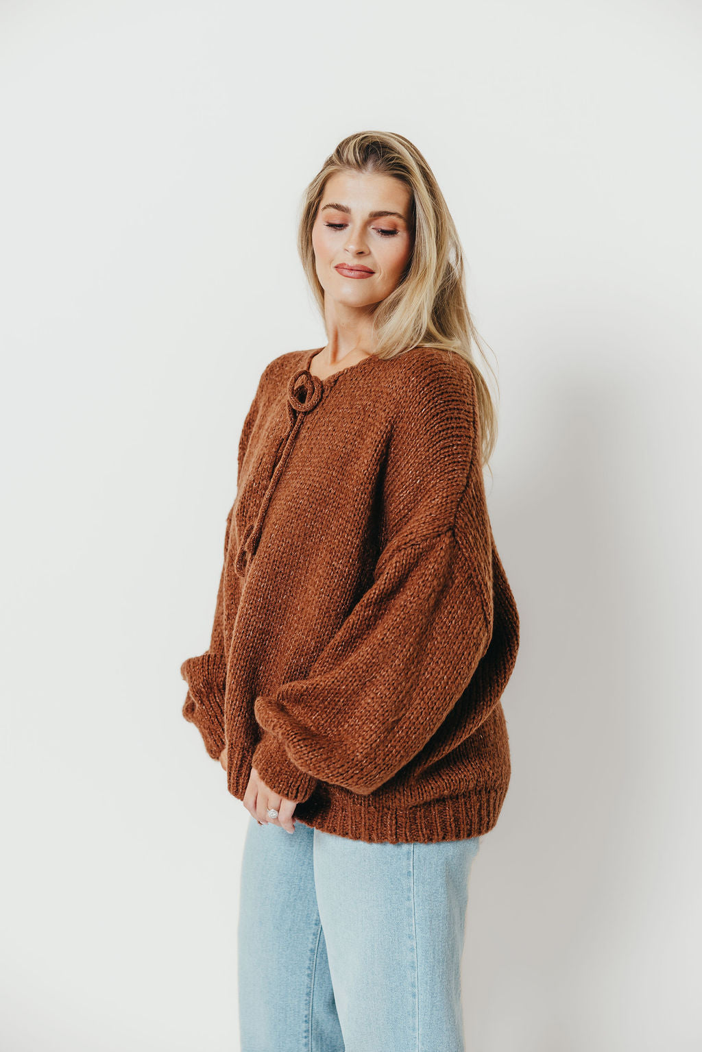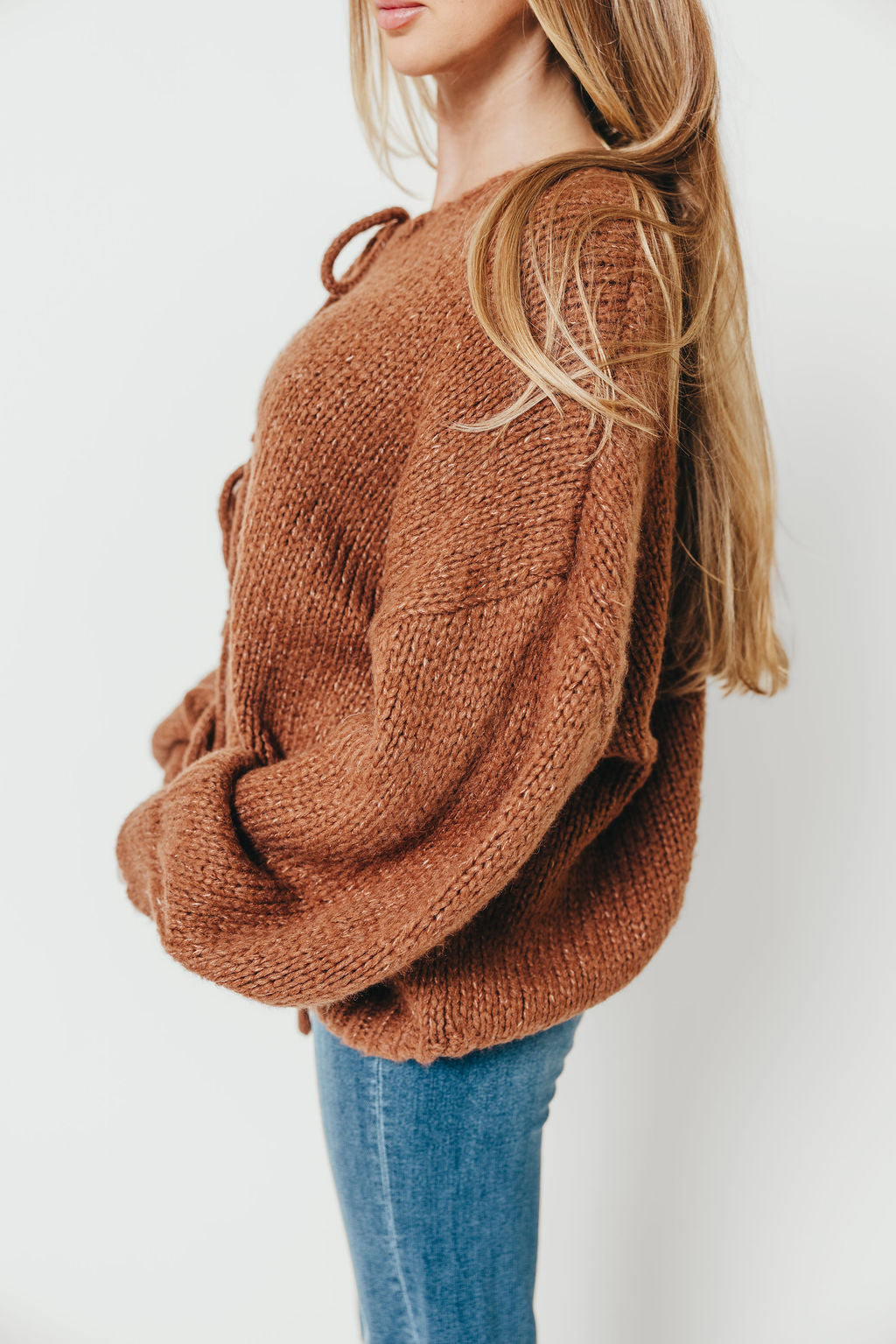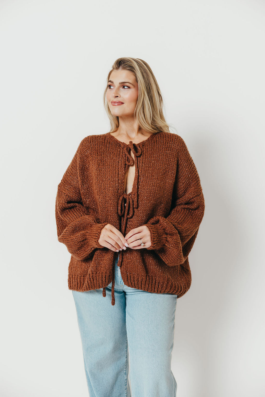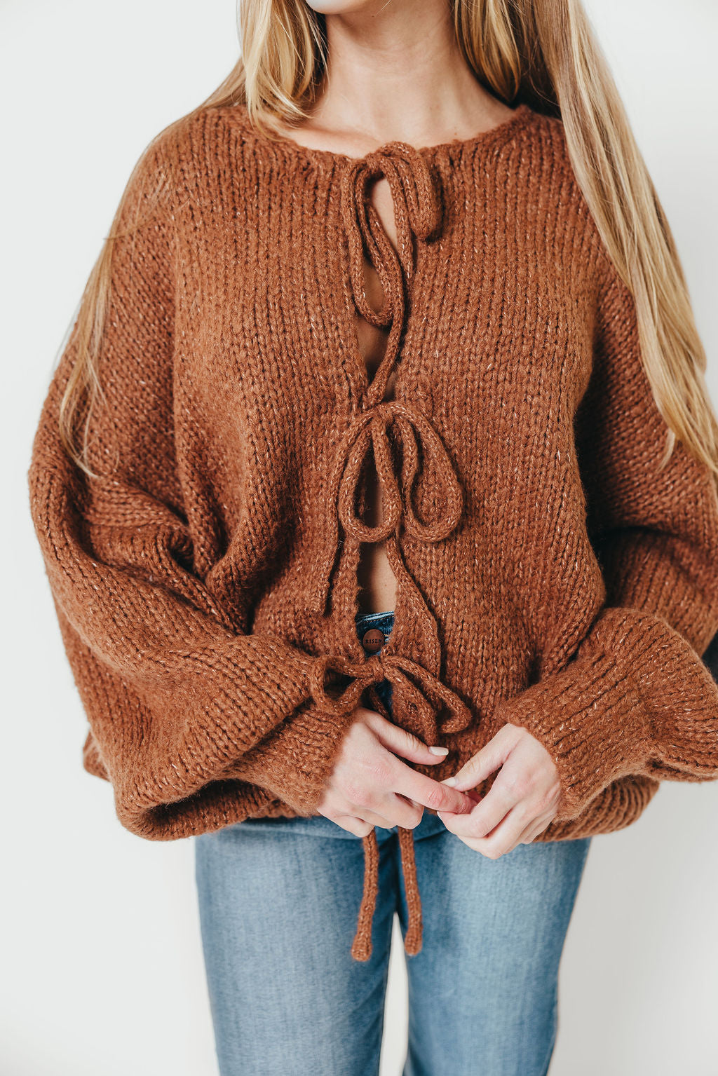 GARMENT DETAILS: Cozy wool-blend knit cardigan with rounded neckline, dropped shoulders, and front bow tie closure.