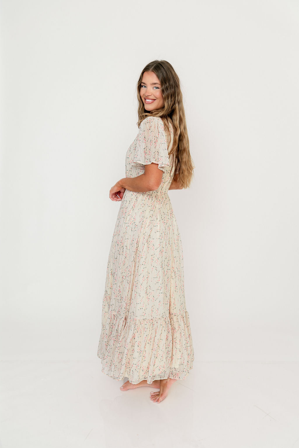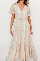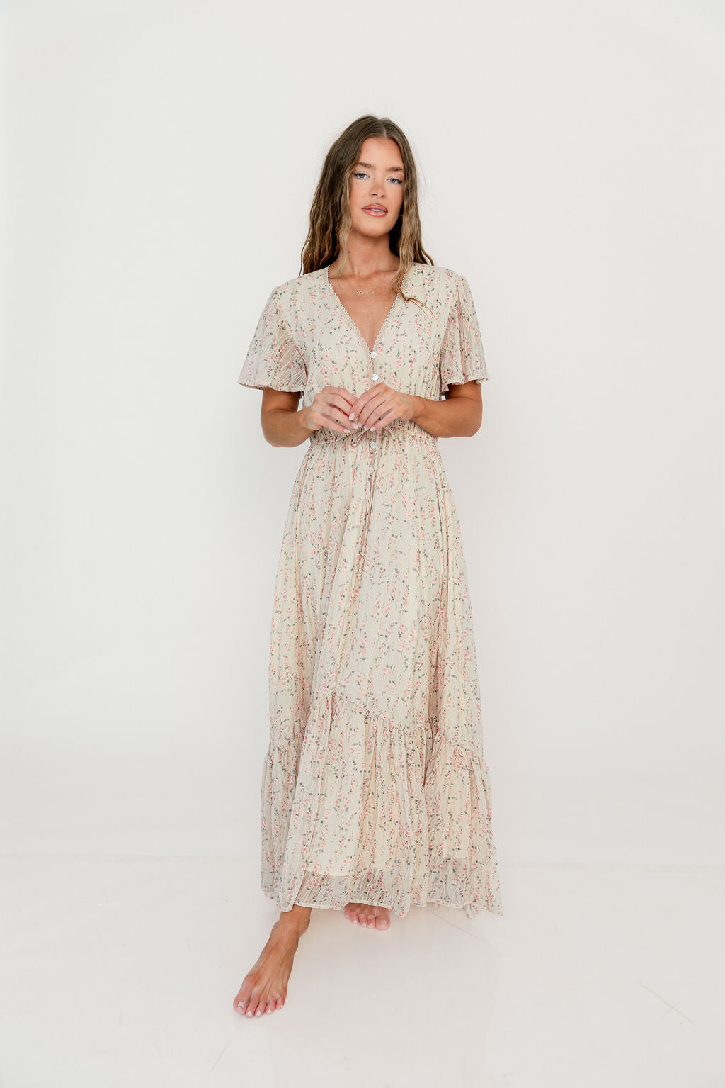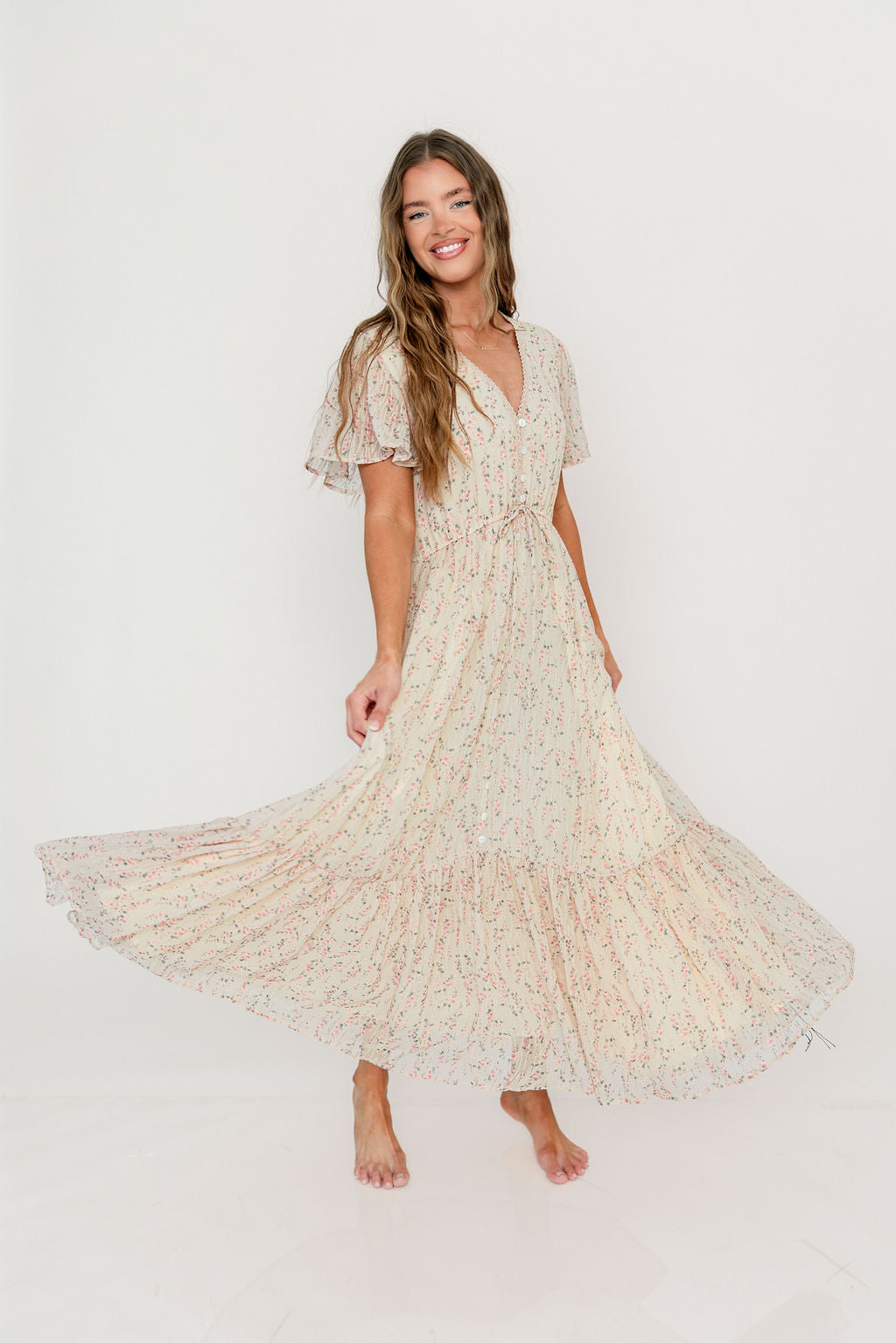 GARMENT DETAILS: Lightweight maxi dress in a charming ditsy floral print. Features a modest V-neckline, functional front button placket, and sheer flutter sleeves. Finished with a cinched waist and tie detail, with an extra-wide, flowy skirt with ruffled hem. Lined.