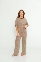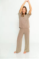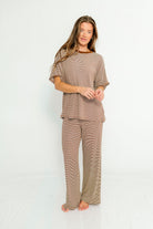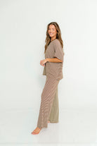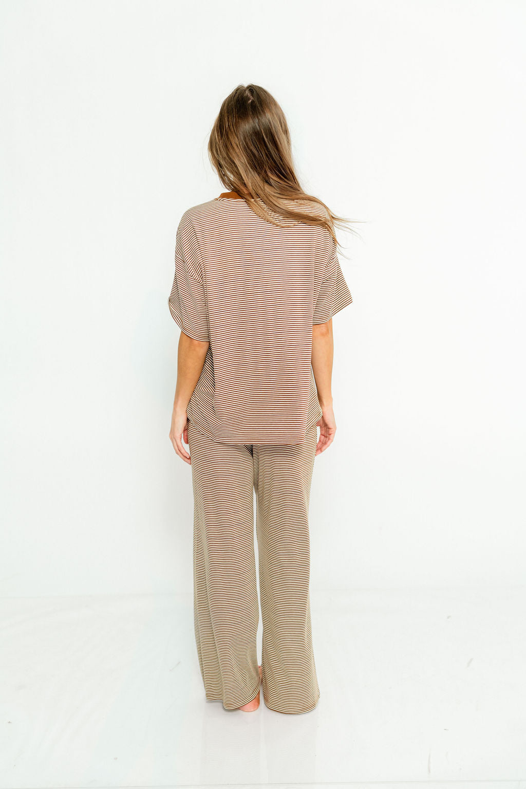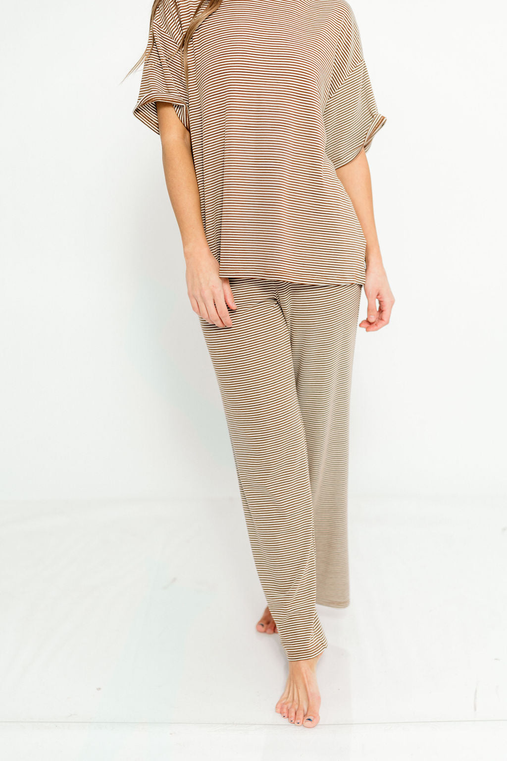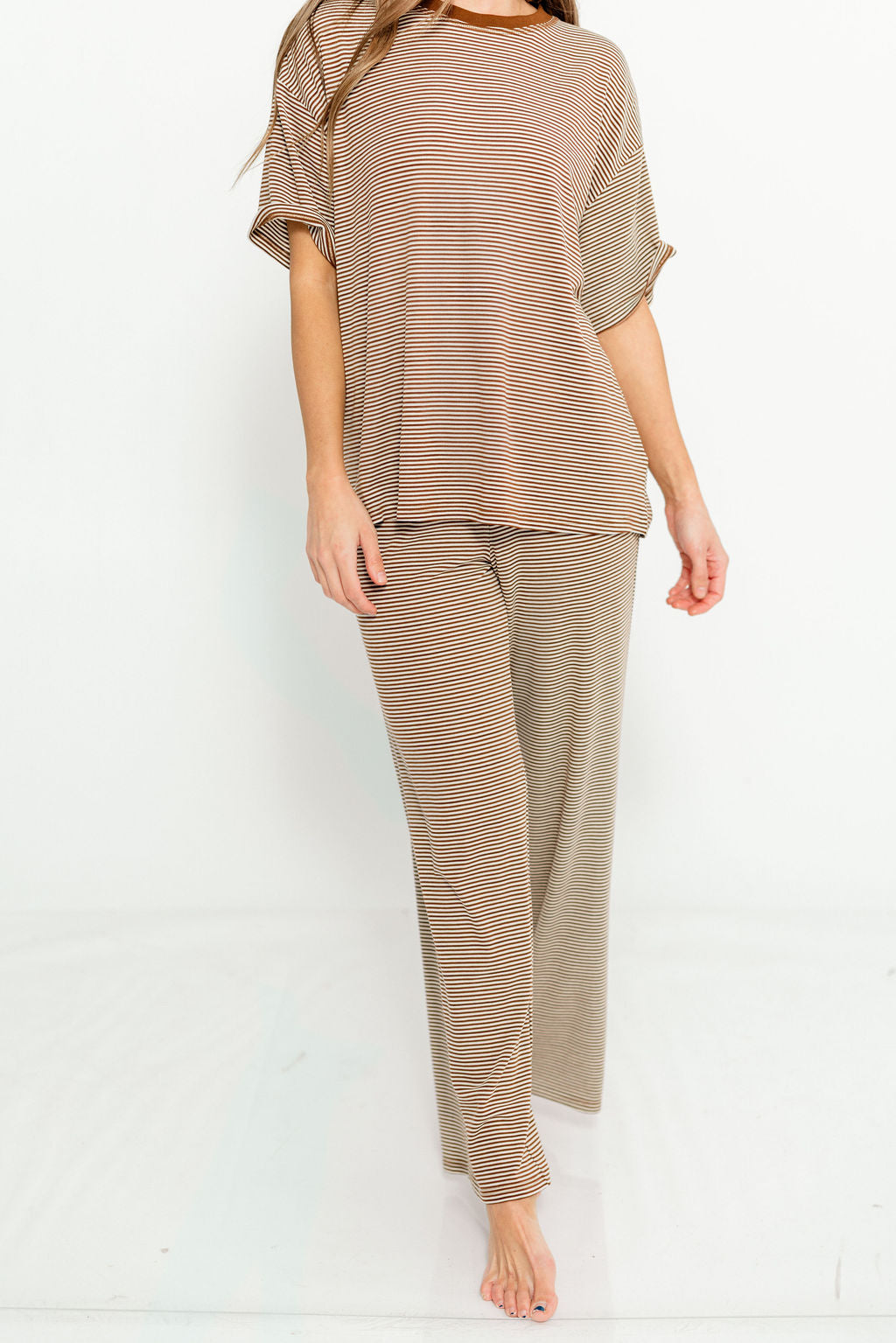 GARMENT DETAILS: Cozy wool-blend top and pants set. Top features a rounded neckline and relaxed fit, with contrast color neckline, dropped shoulders, and rolled edge short sleeves. Matching pants feature elasticated waistband and full length with relaxed silhouette.