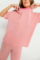 GARMENT DETAILS: Cozy wool-blend top and pants set. Top features a rounded neckline and relaxed fit, with contrast color neckline, dropped shoulders, and rolled edge short sleeves. Matching pants feature elasticated waistband and full length with relaxed silhouette.