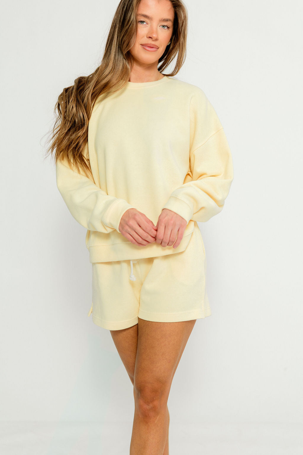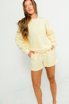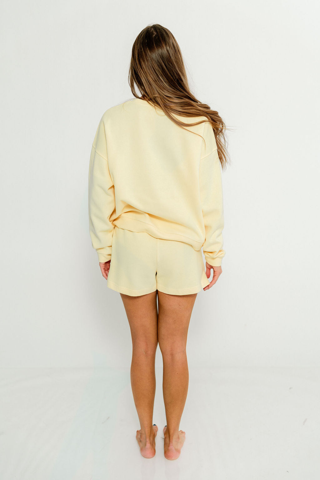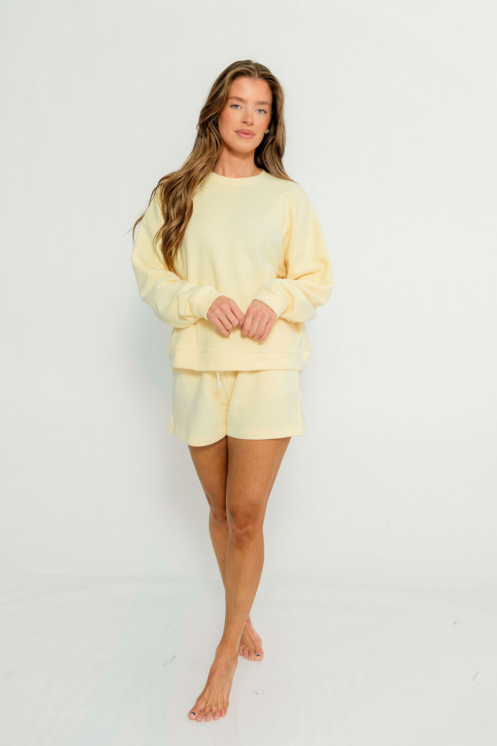 GARMENT DETAILS: Buttery soft cotton-blend top and shorts set. Sweatshirt features crewneck, relaxed fit, and cuffed long sleeves. Shorts feature an elastic waistband with drawstring and side vents.