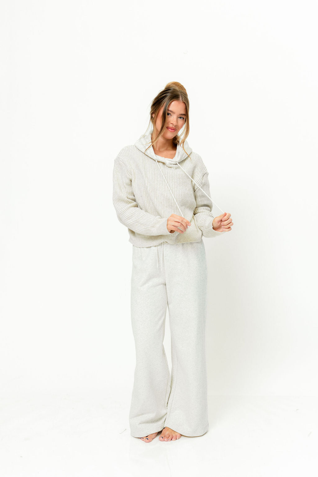 GARMENT DETAILS: Mixed knit hoodie and pants set. Top features an attached hood and drawstring detail; pants feature a slouchy, relaxed fit with pull-on elastic waistband.