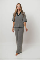 GARMENT DETAILS: Soft sweater knit top and pants set. Top features relaxed short sleeves, collared V-neckline, and contrast color trim. Full-length pants feature elasticated waistband and wide-leg silhouette.