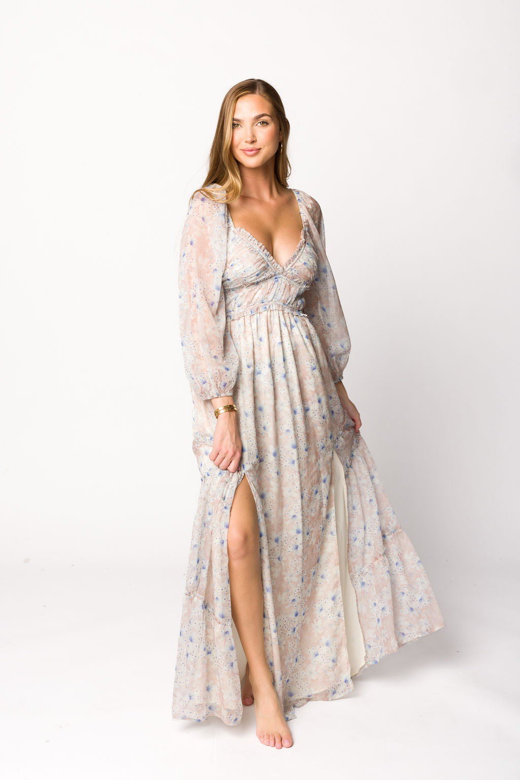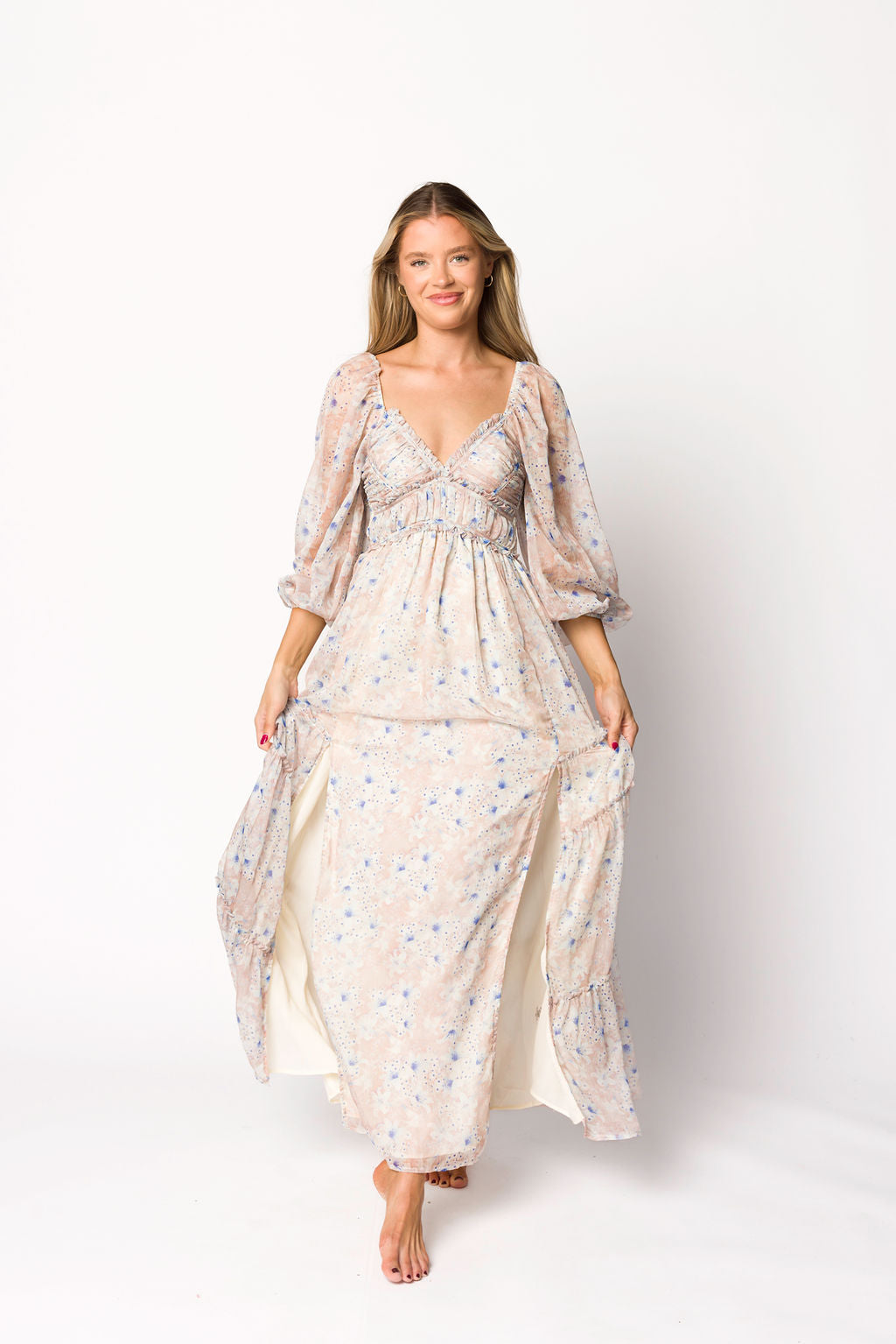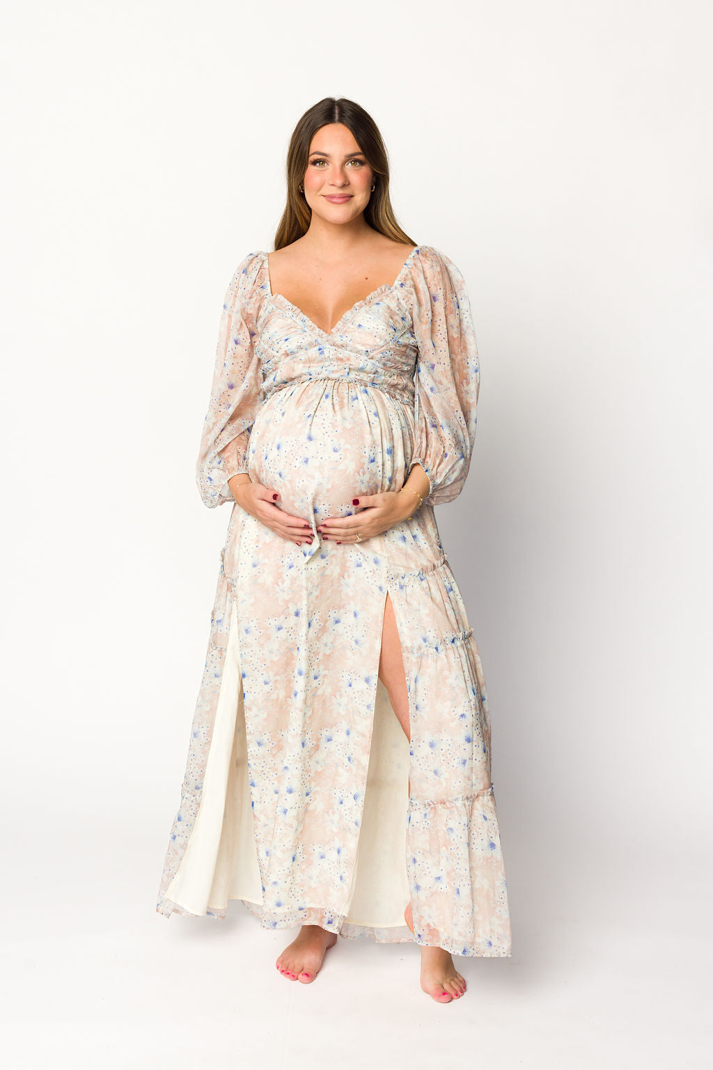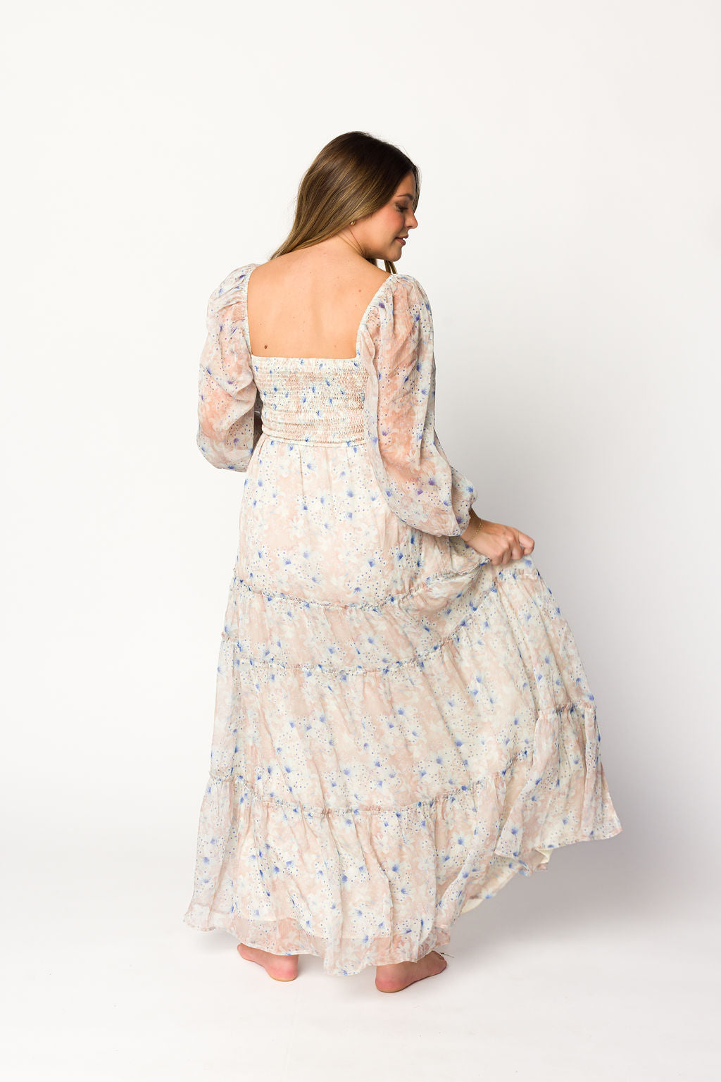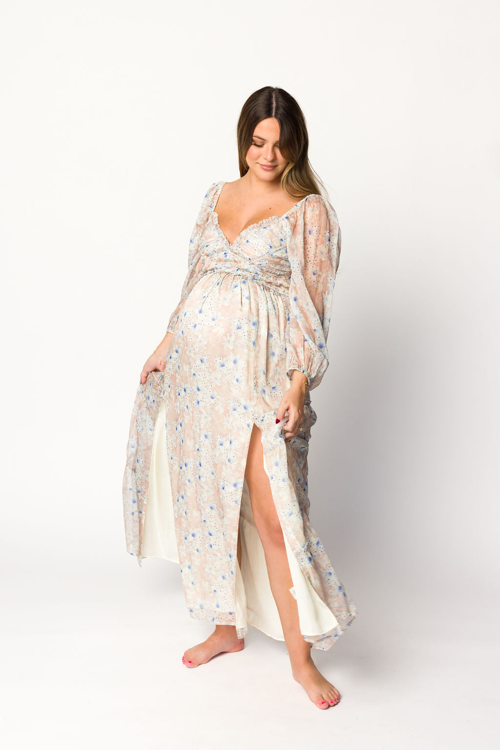 Daphne Long Sleeve Maxi Dress in Beige/Blue Floral - Bump Friendly & Inclusive Sizing (XS-3XL)