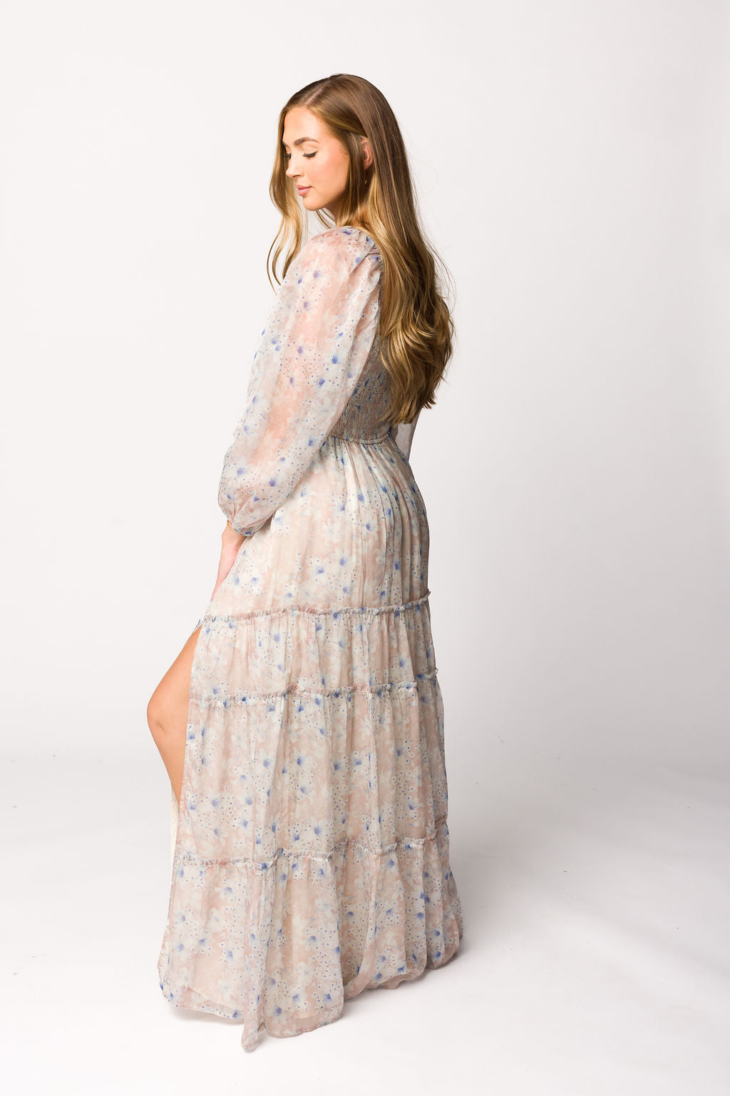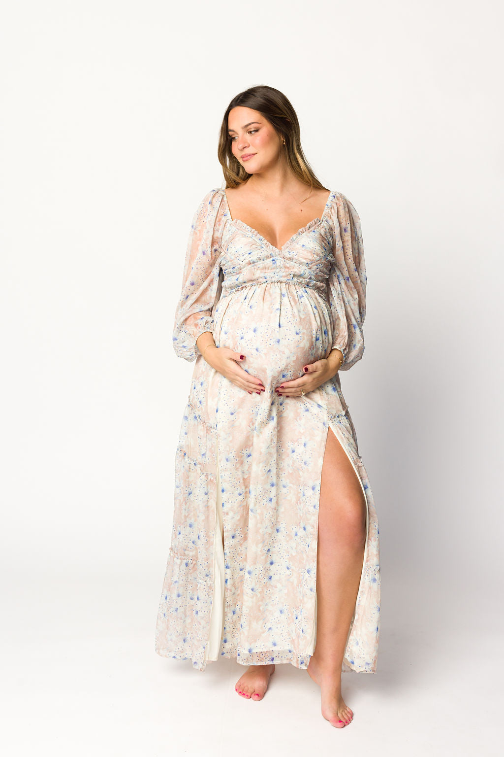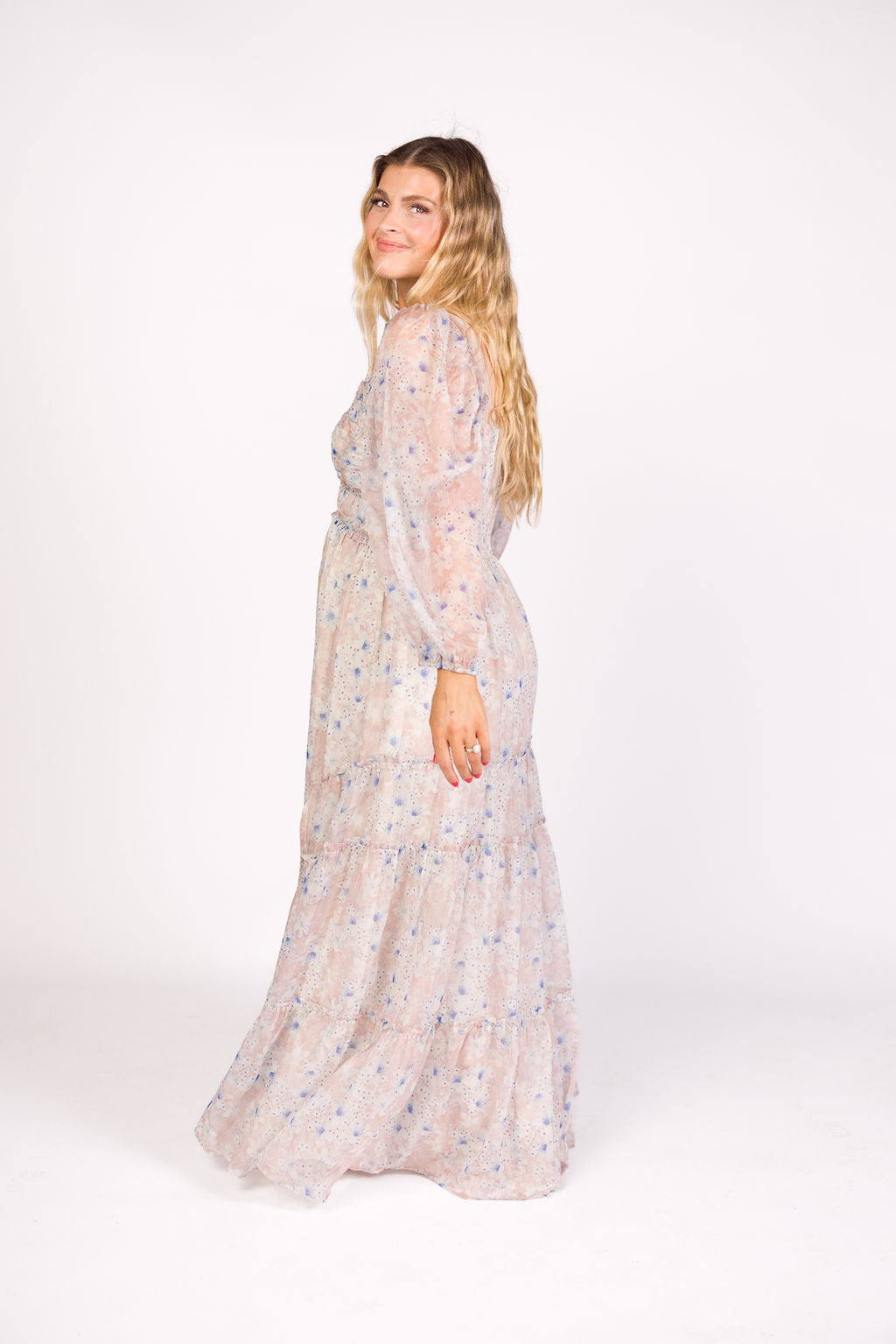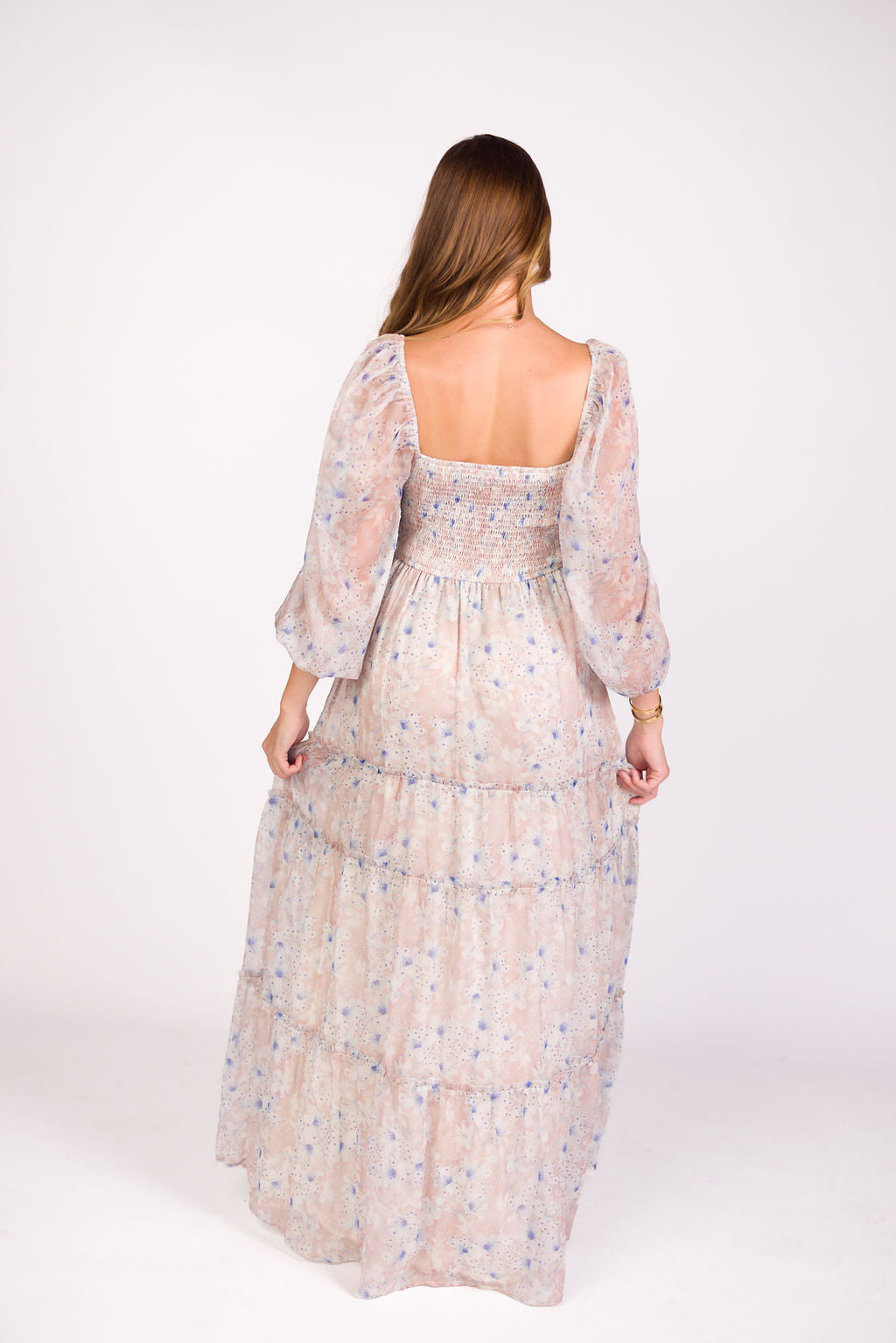Daphne Long Sleeve Maxi Dress in Beige/Blue Floral - Bump Friendly & Inclusive Sizing (XS-3XL)