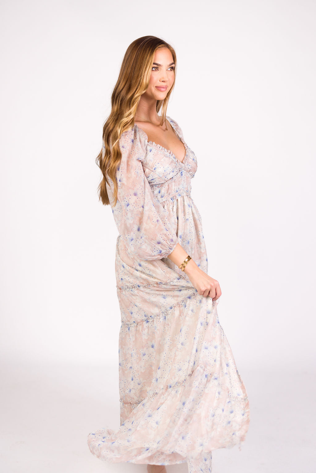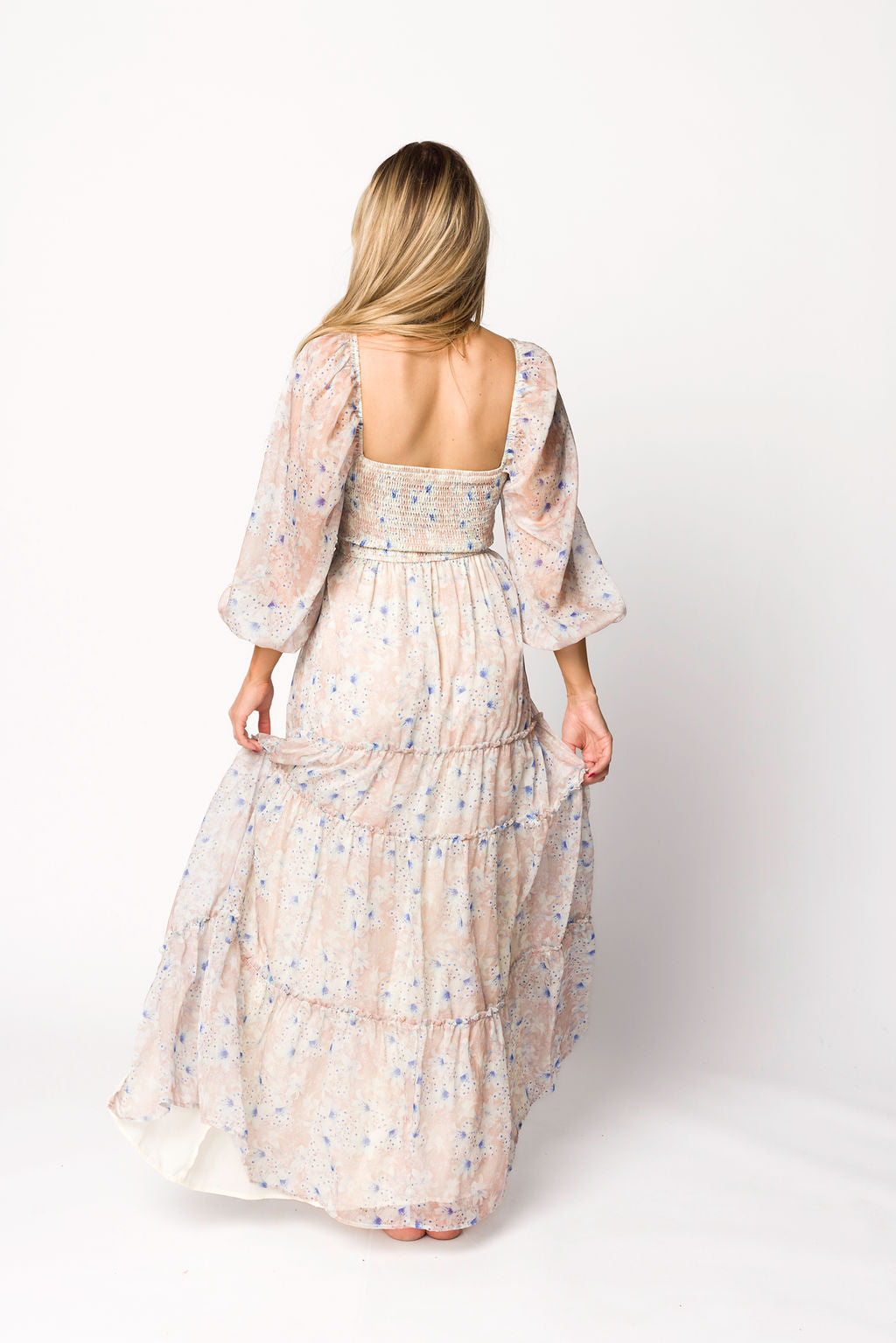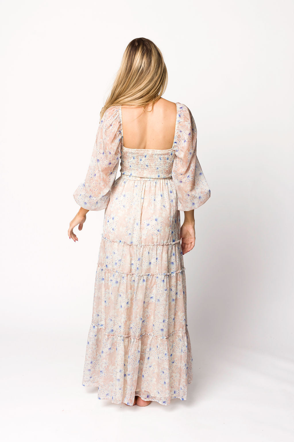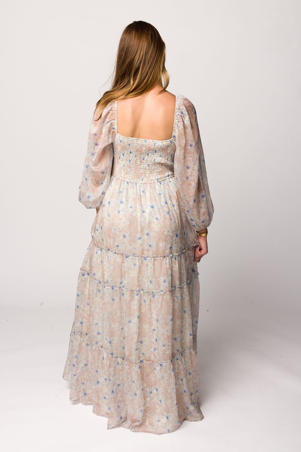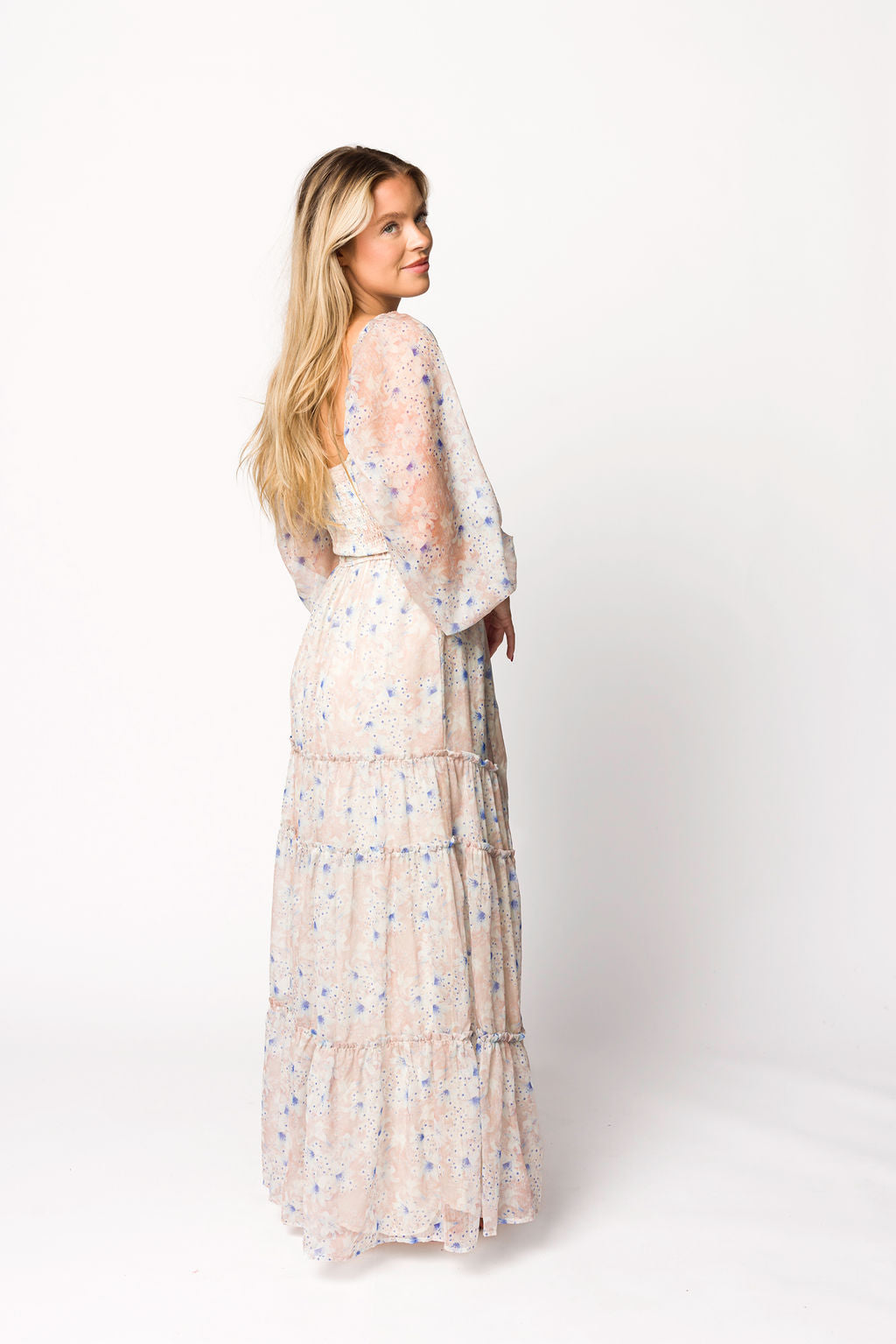 Daphne Long Sleeve Maxi Dress in Beige/Blue Floral - Bump Friendly & Inclusive Sizing (XS-3XL)