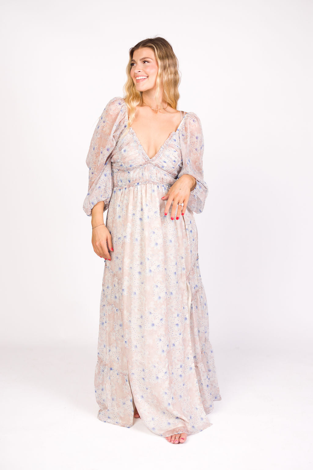 GARMENT DETAILS: Full-skirted maxi dress in delicate floral print with embroidered eyelet details and a low V-neckline with an inverted empire waist. Features sheer balloon sleeves, pleated bodice and waist, with a stretchy, smocked back panel. Finished with two thigh-high front slits.