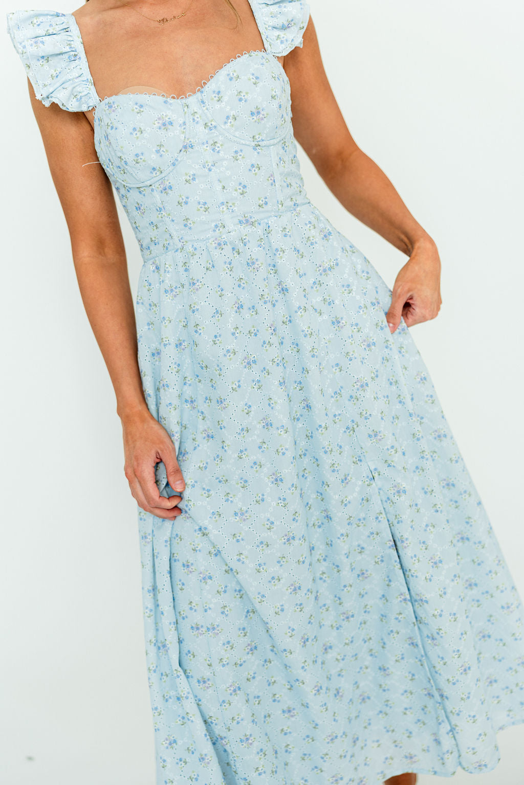 GARMENT DETAILS: Charming chiffon midi dress in a lighthearted floral print, with sweetheart neckline, bustier-style bodice, and ruffled shoulder straps. Features an adjustable lace-up back and full lining.