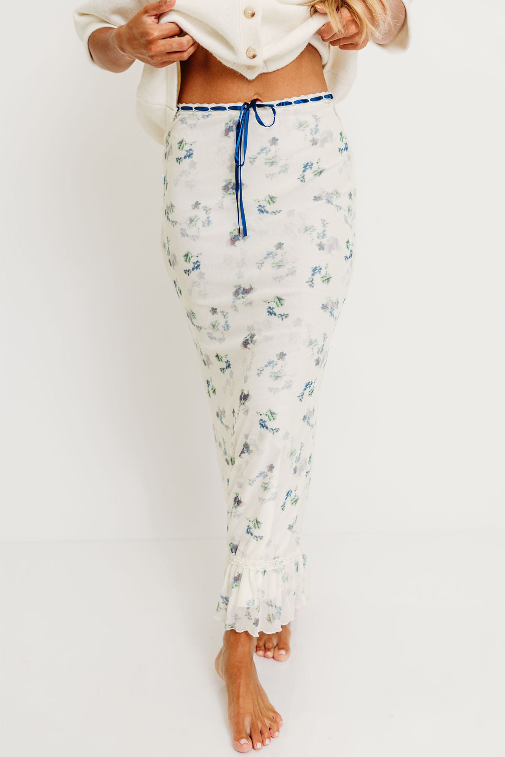 GARMENT DETAILS: Lightweight mesh midi skirt in a delicate floral print. Features a slimming A-line silhouette, ruffled hem, and contrast color trim and waist tie. Lined.