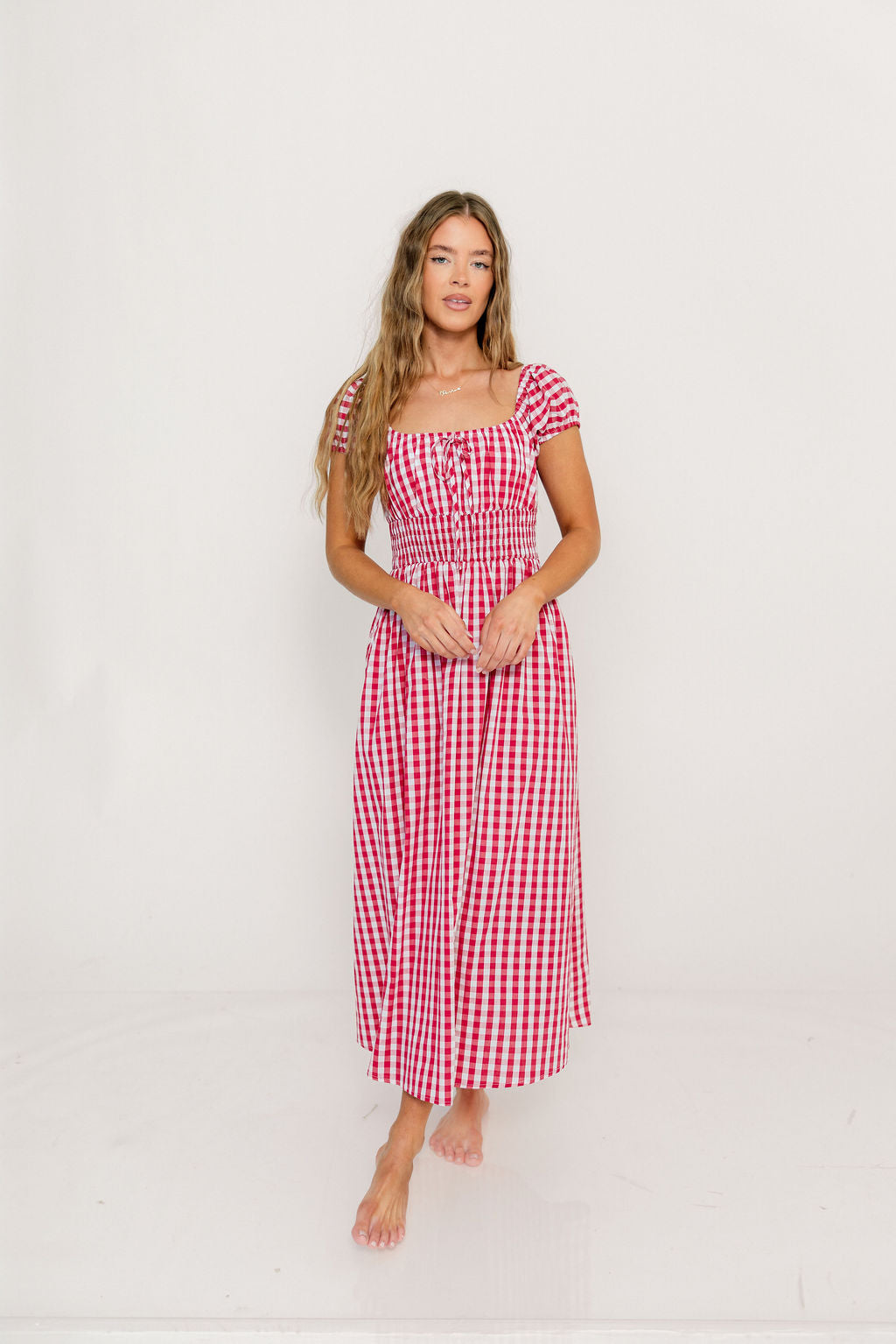 Mariana Gingham Puff Sleeve Midi Dress in Red