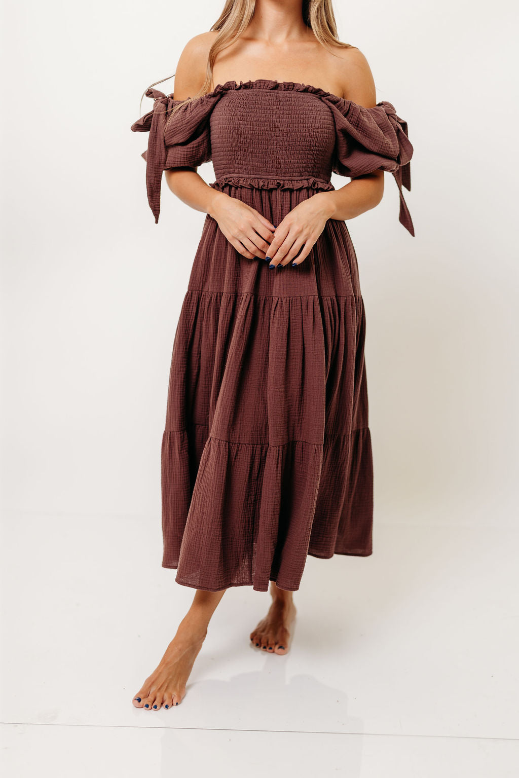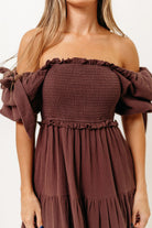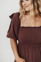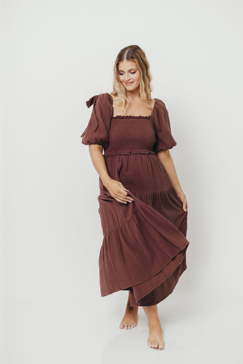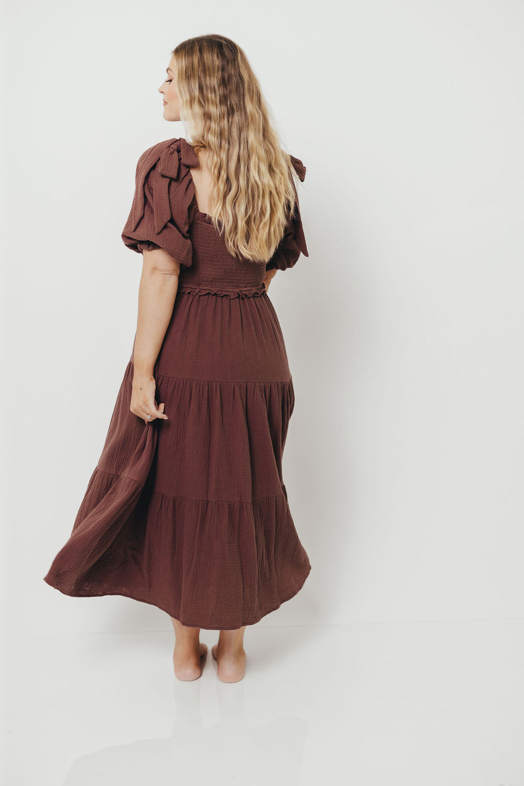 GARMENT DETAILS: Elegant midi dress with a square neckline, statement puffed sleeves, and bow accents on the shoulders. Features a fully smocked bodice, with a multi-tiered skirt.