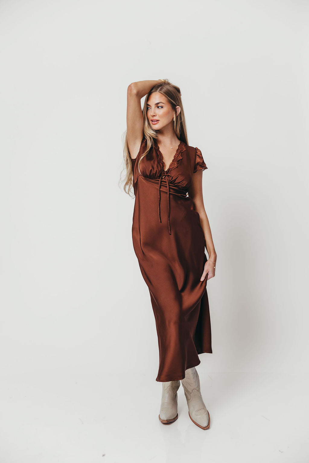 The elegant Vivienne Dress will turn heads at any event! This silky satin midi features delicate lace trim and a deep V-neck, highlighting your curves and making the Vivienne an easy choice for dressing up this season.