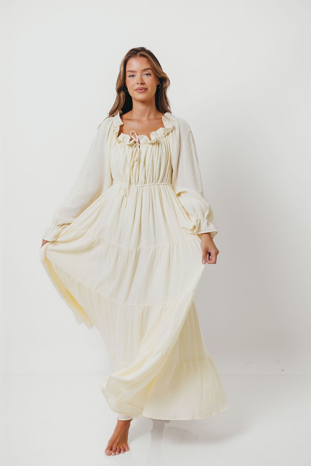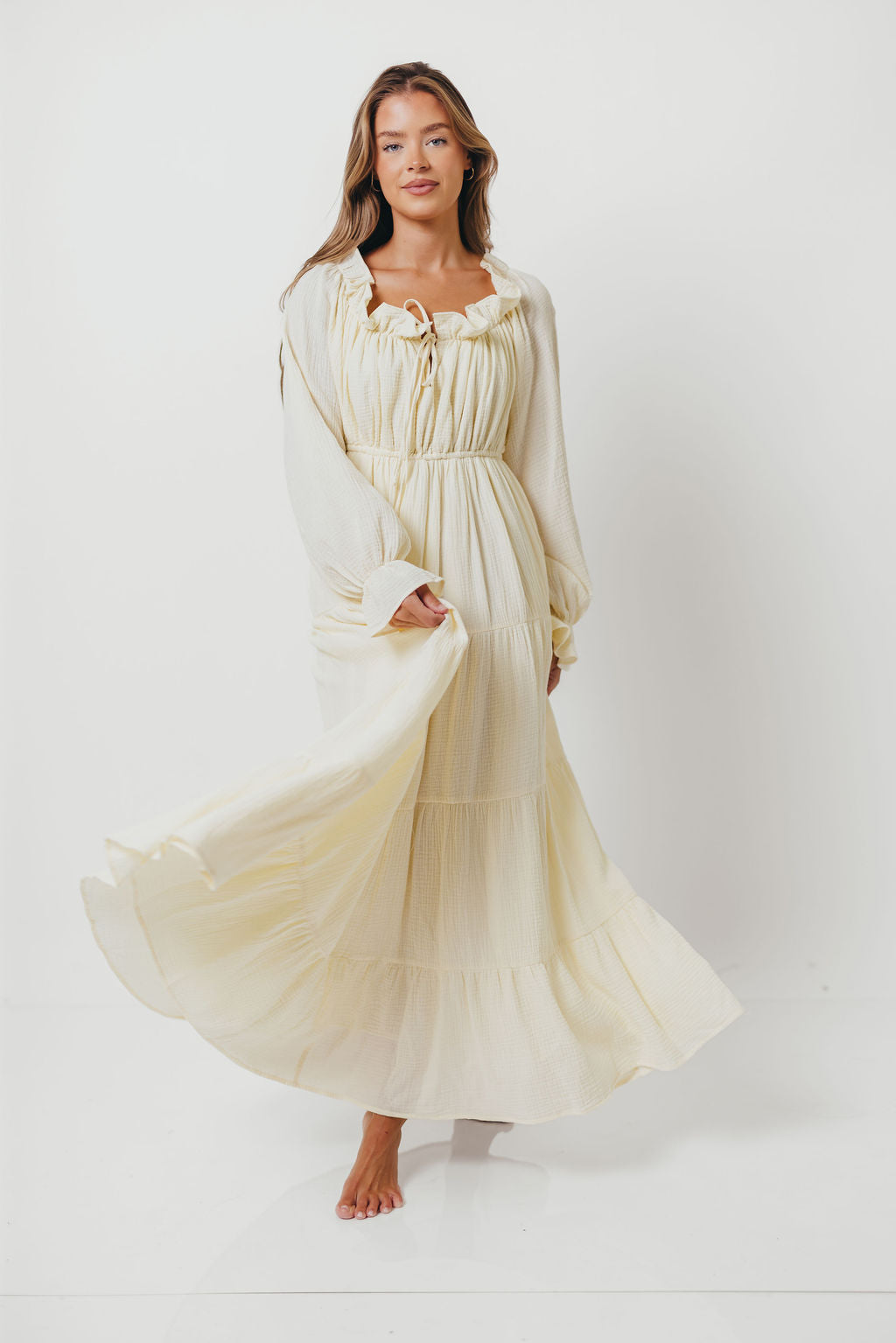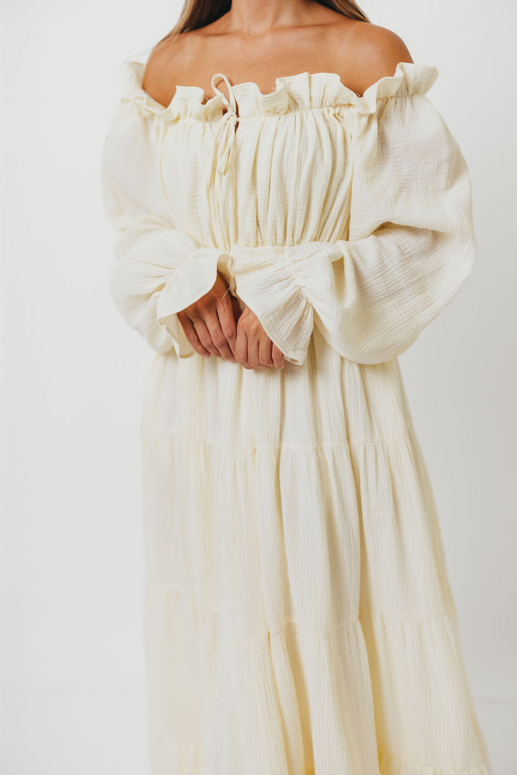 GARMENT DETAILS: Lightweight, 100% cotton gauze maxi dress with empire-waisted silhouette, elasticated neckline that can be worn on or off the shoulders, and long puffed sleeves with ruffled cuffs. Features ruffled accents, a self-tie bow detail, and extra-wide tiered skirt. Fully lined.