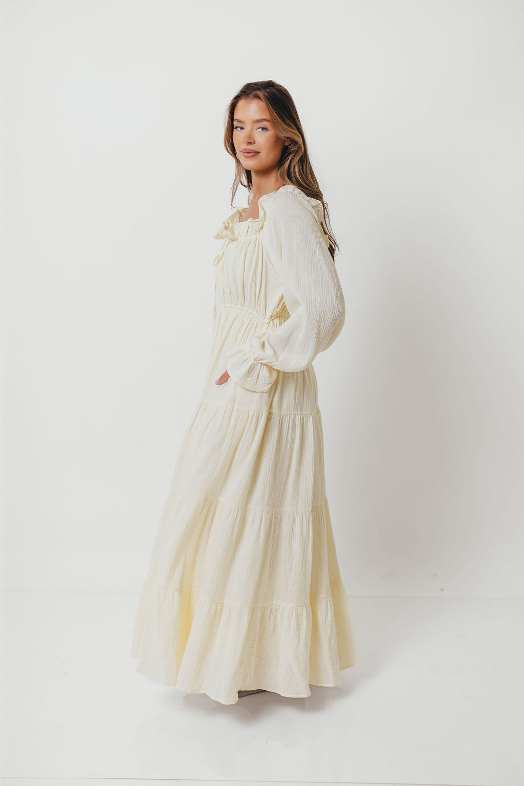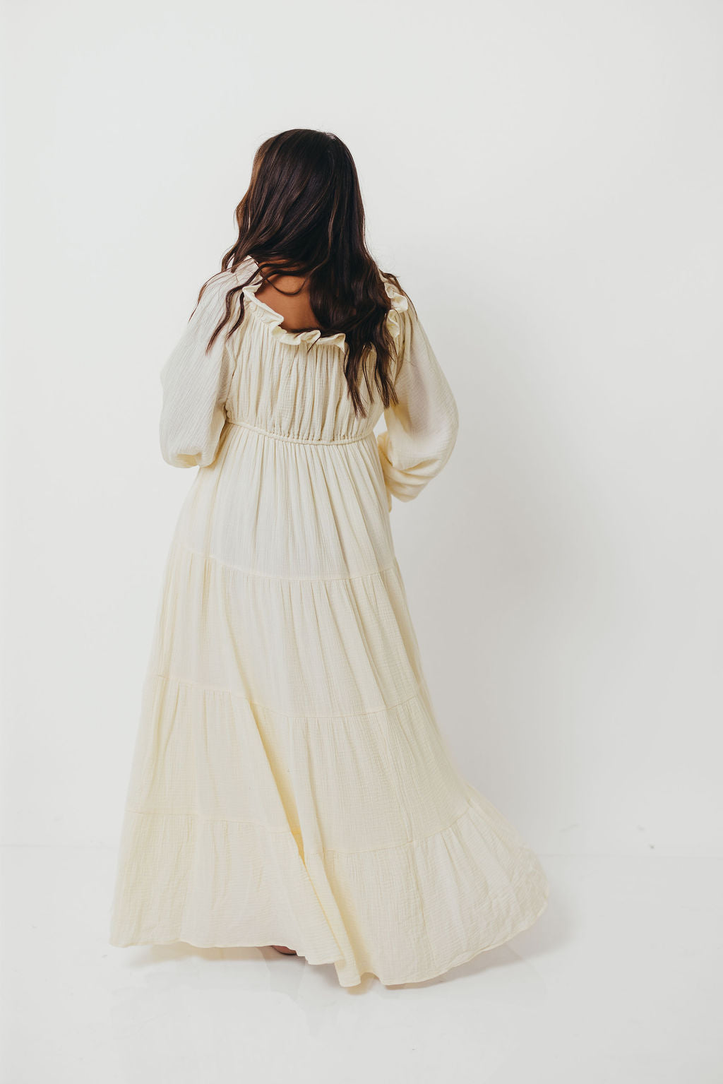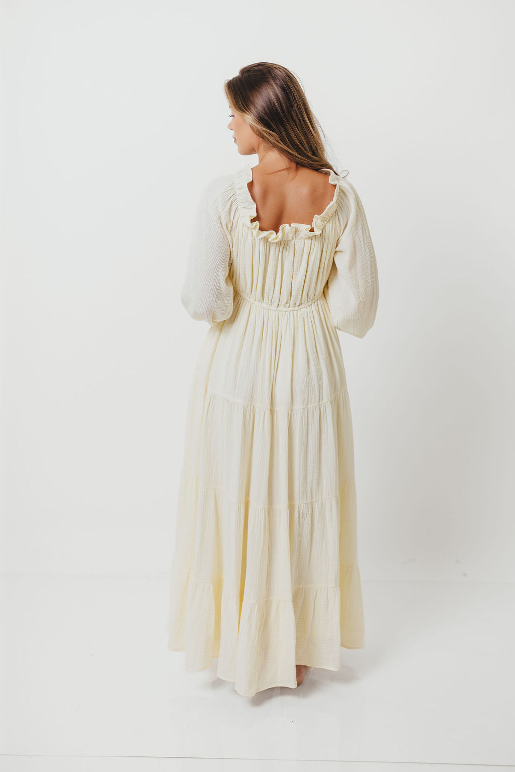 GARMENT DETAILS: Lightweight, 100% cotton gauze maxi dress with empire-waisted silhouette, elasticated neckline that can be worn on or off the shoulders, and long puffed sleeves with ruffled cuffs. Features ruffled accents, a self-tie bow detail, and extra-wide tiered skirt. Fully lined.