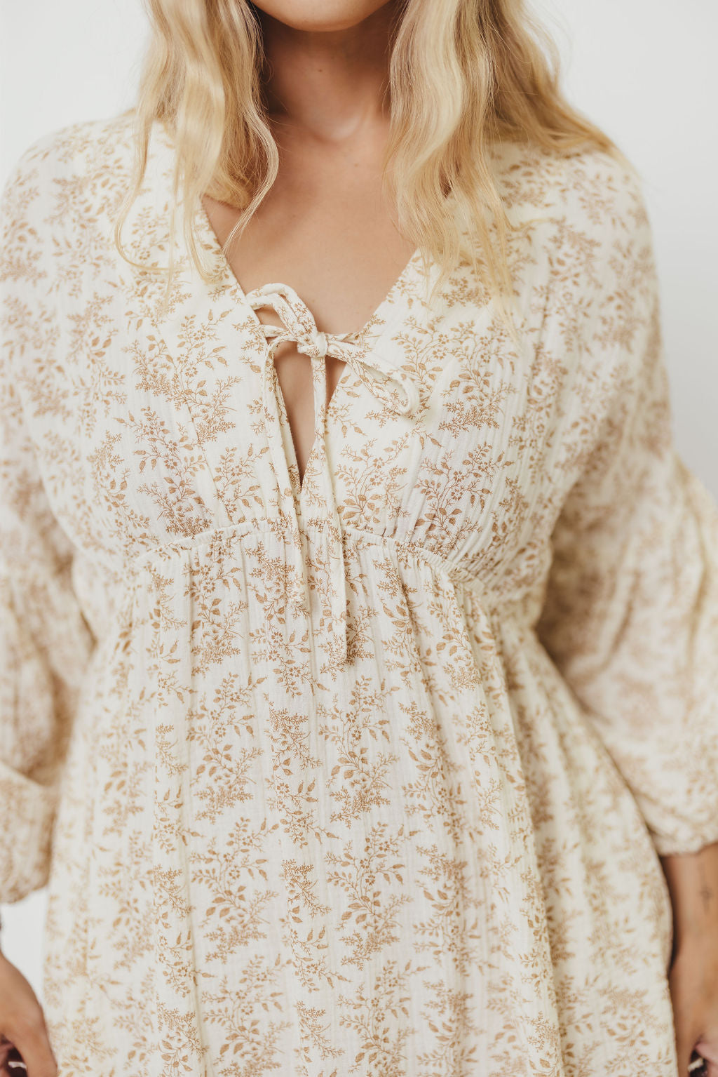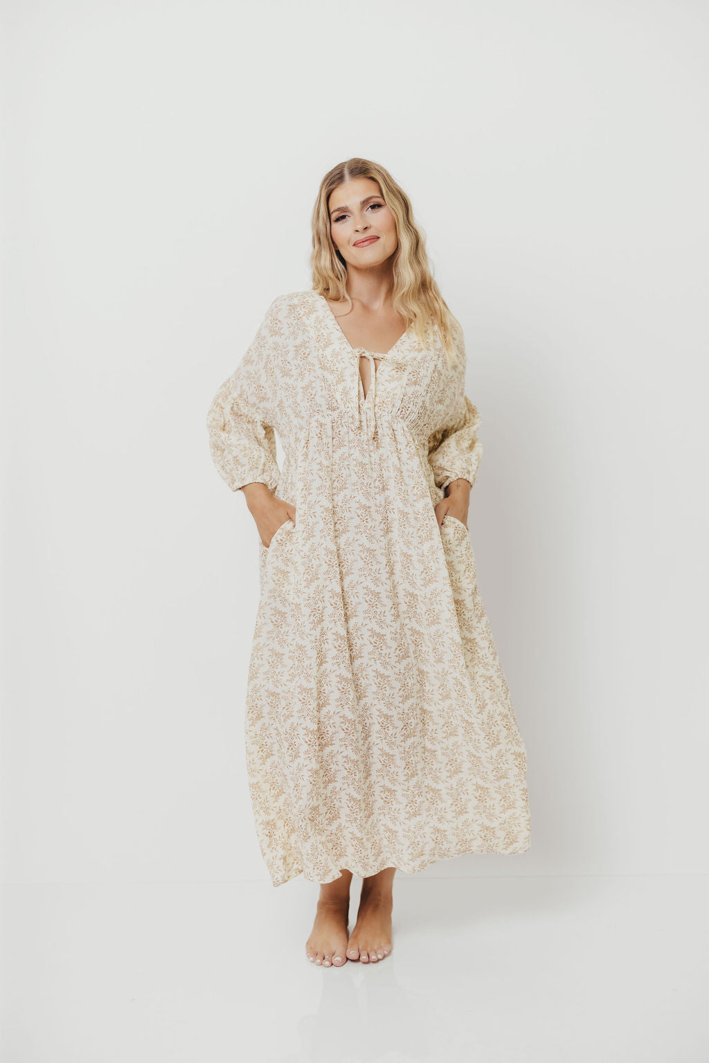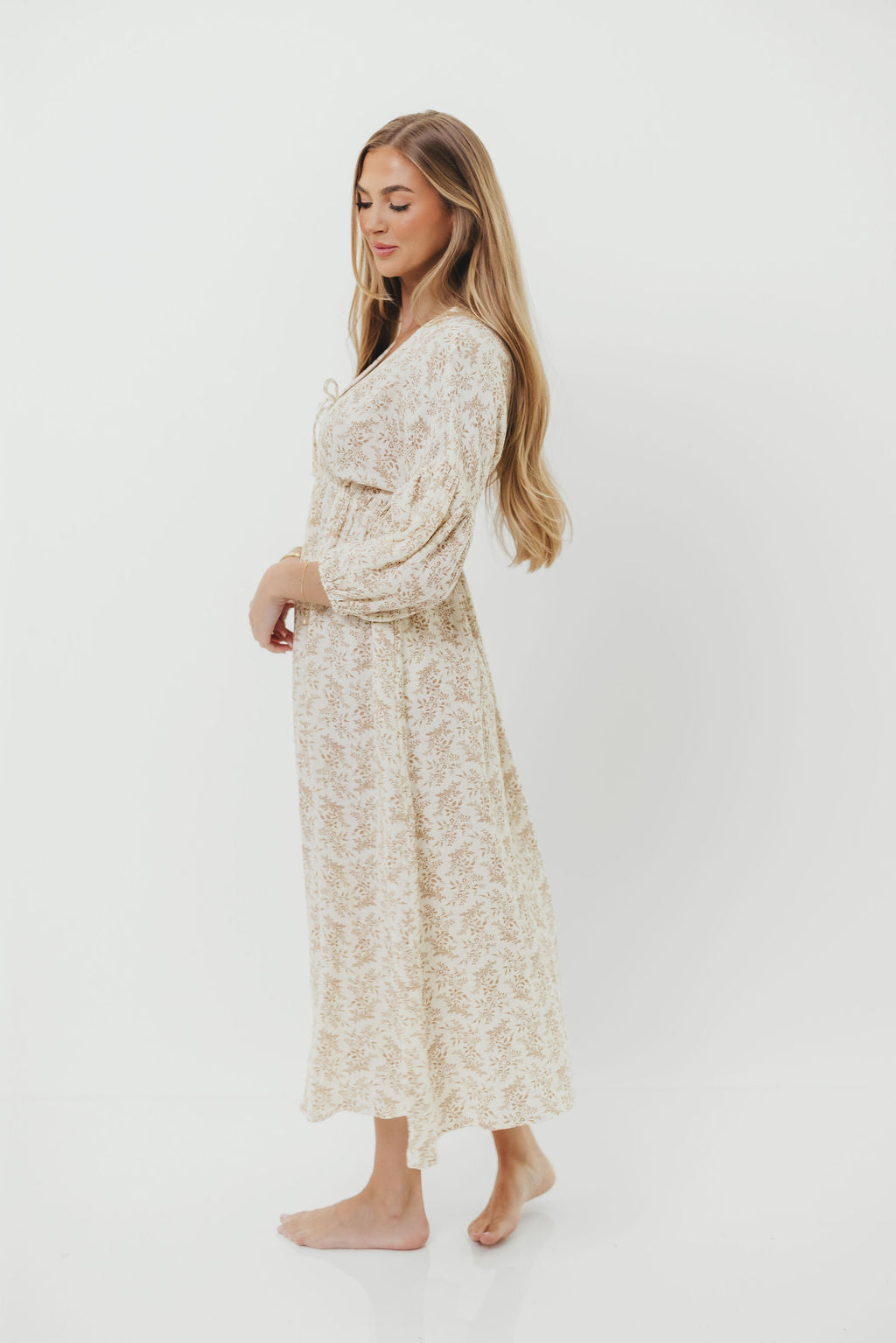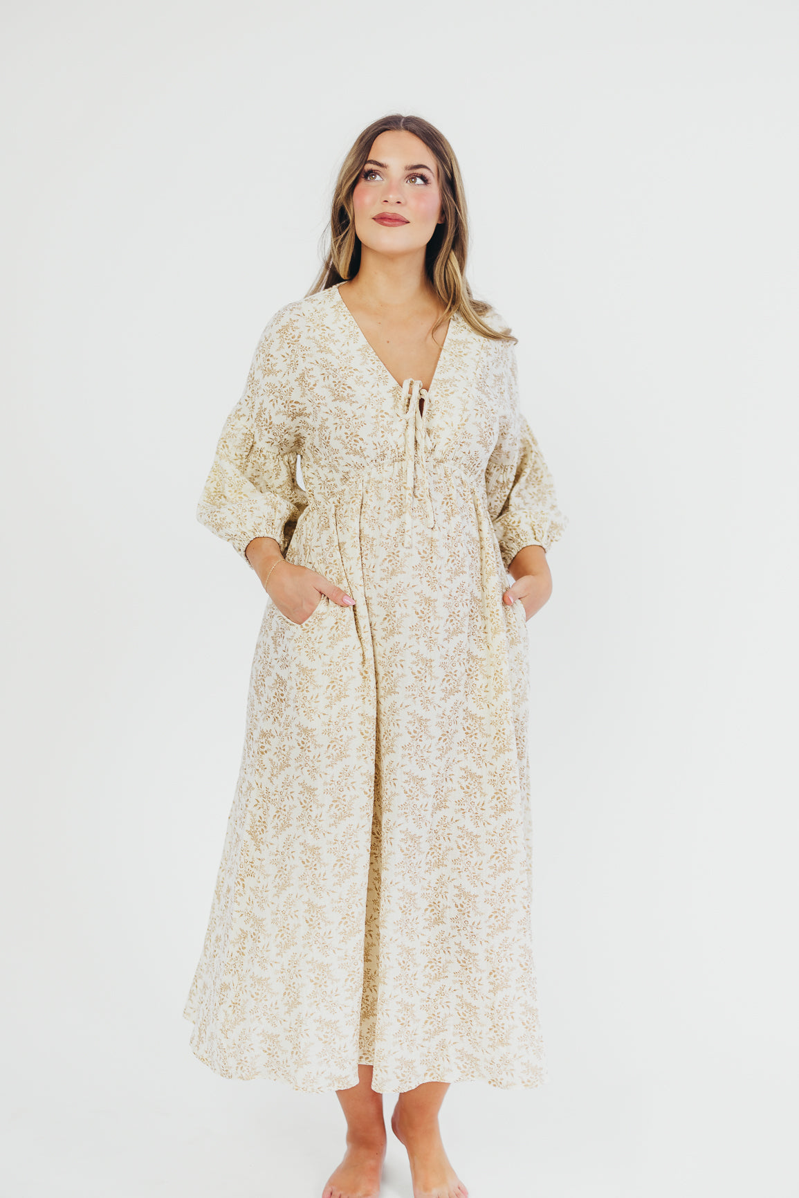Hunter 100% Cotton Gauze Midi Dress in Natural/Tan Floral - Bump Friendly