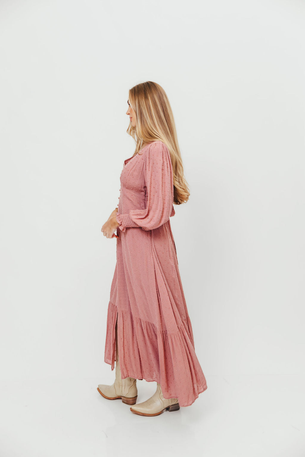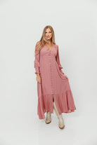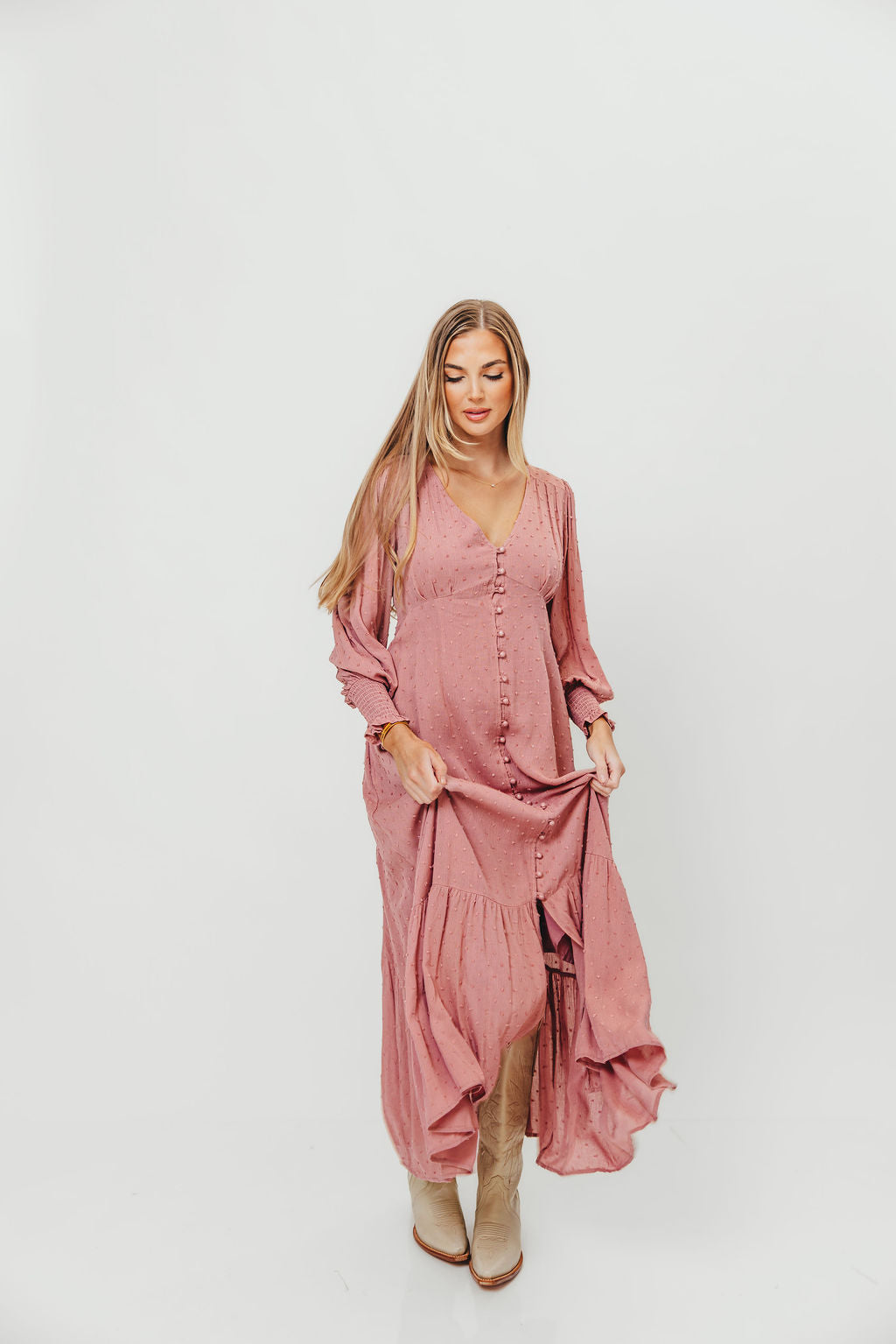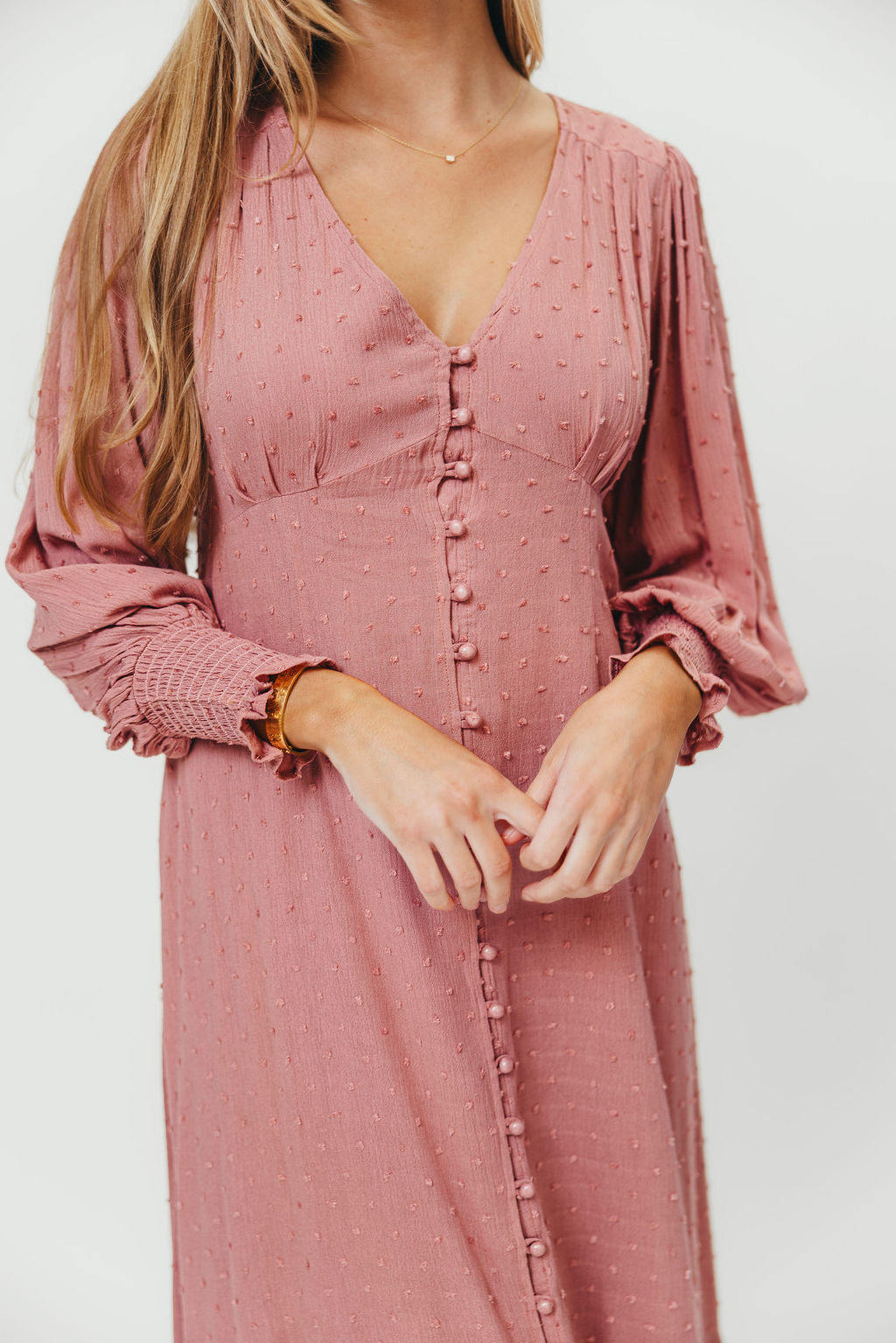 Kathani Swiss Dot Button Down Maxi Dress in Rose Tea
