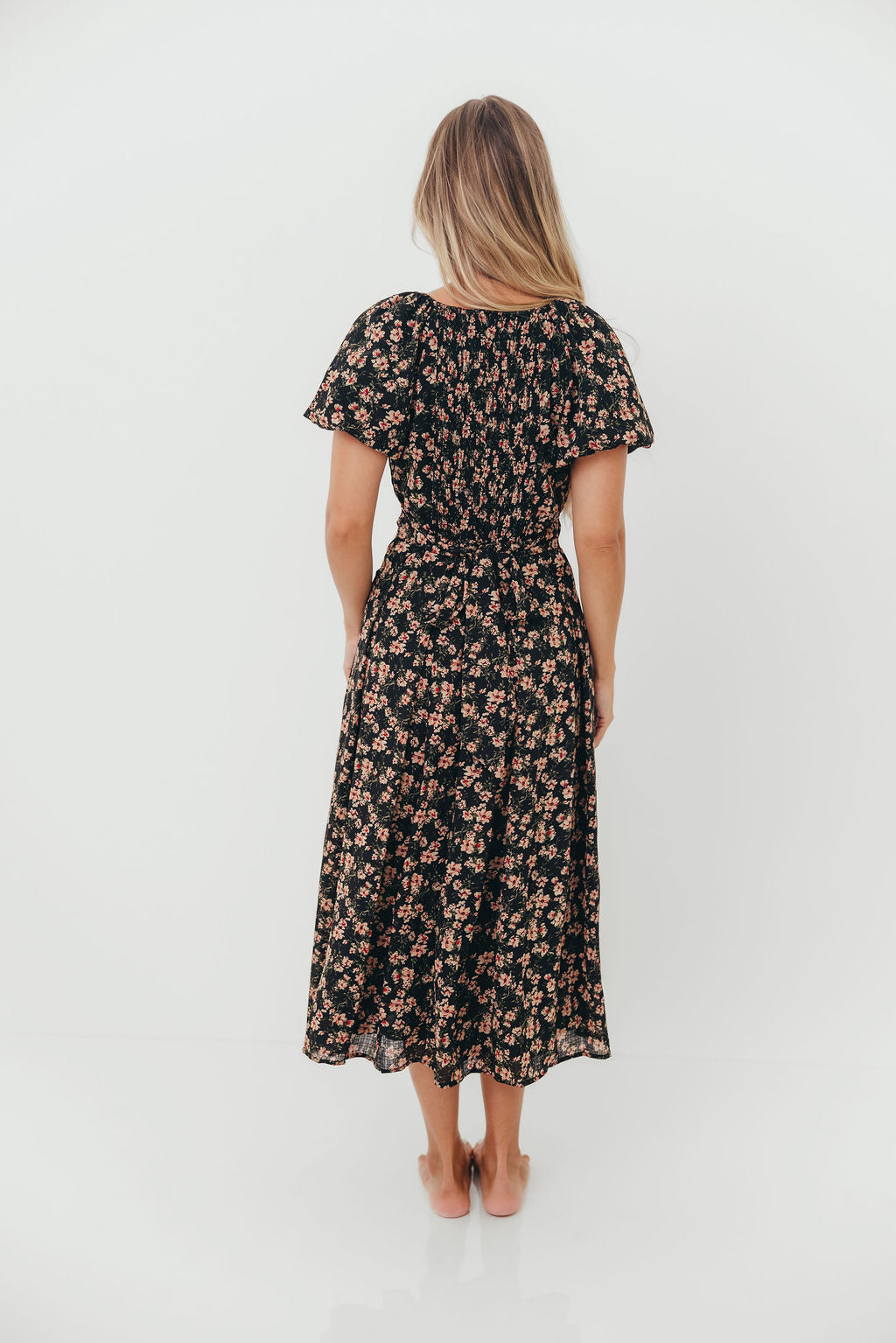 GARMENT DETAILS: Lightweight floral-print midi dress with faux-wrap bodice, deep V-neckline, and delicate short puffed sleeves. Features a full, pleated skirt with adjustable back tie sash and smocked back panel. Lined.