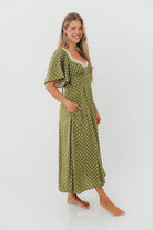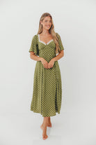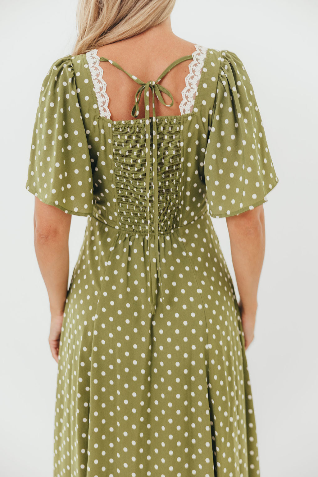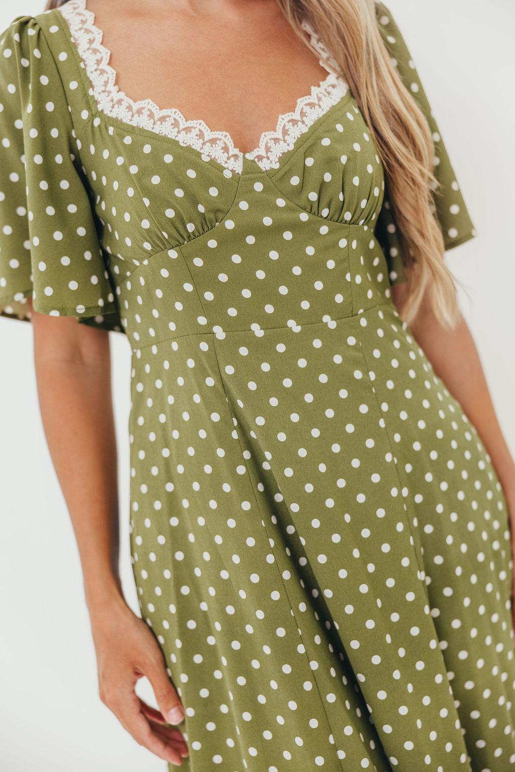 Mindy Flutter Sleeve Polka Dot Midi Dress in Olive