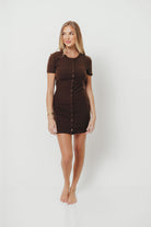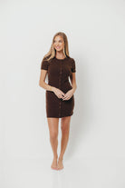 GARMENT DETAILS: Very fitted mini dress in a soft knit construction. Features a high rounded neckline, short sleeves, and full front button placket with functional, tonal buttons.