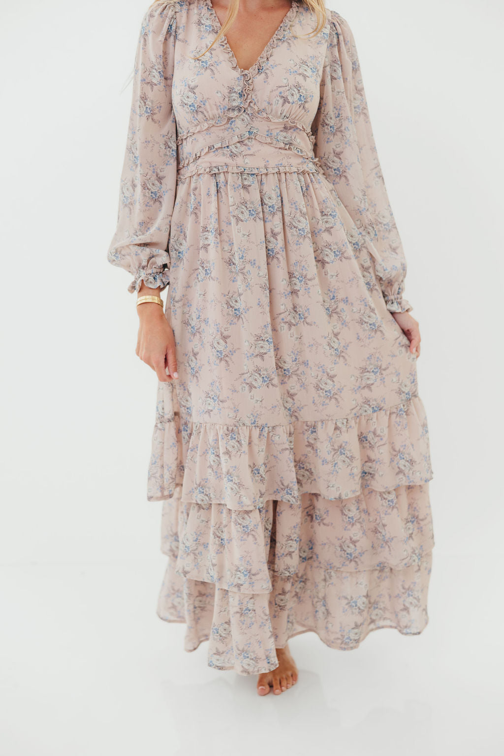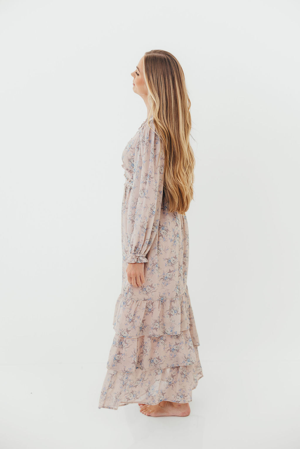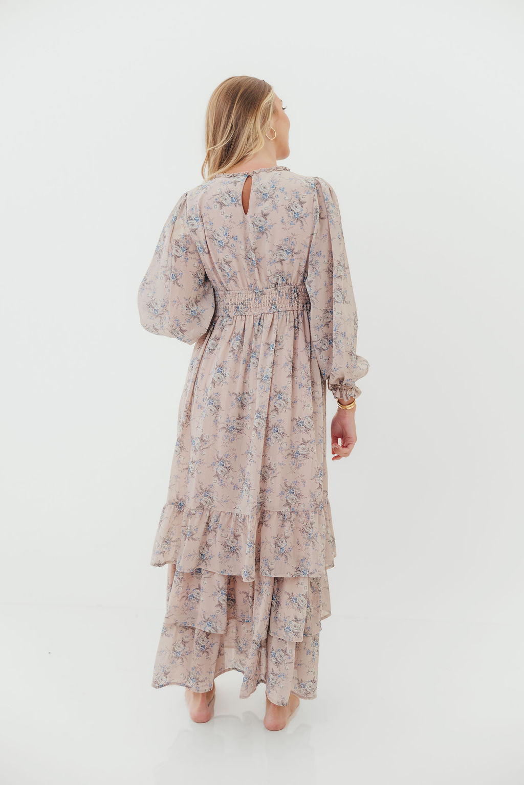 Shenae Ruffled Tiered Floral Maxi Dress in Dusty Pink