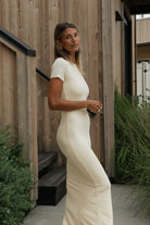 GARMENT DETAILS: Lightweight micro-ribbed knit maxi dress with rounded neckline, short sleeves, and flattering, feminine fit. Features raw edge hem at skirt and sleeves.
