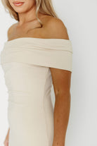 GARMENT DETAILS: Sleek and fitted maxi dress in a luxuriously soft premium knit. Features a folded off-the-shoulder neckline with short sleeves and a fit-and-flare design that is fitted through the hips and thighs and flares at the knee. Fully lined for maximum coverage and comfort.
