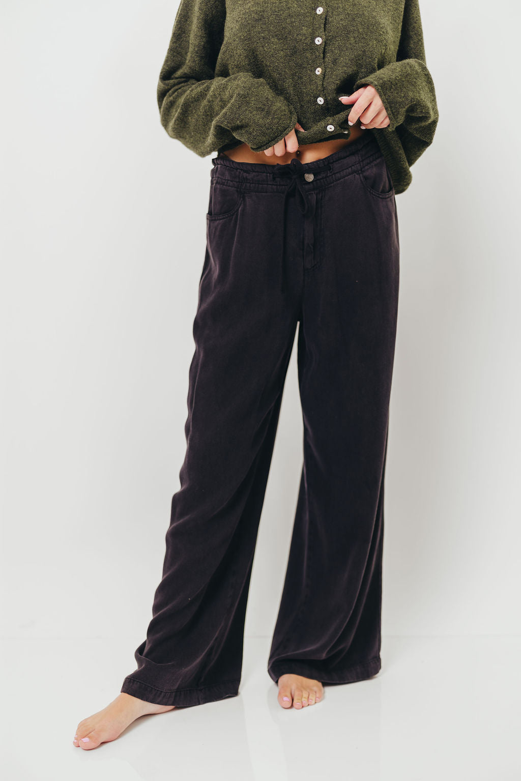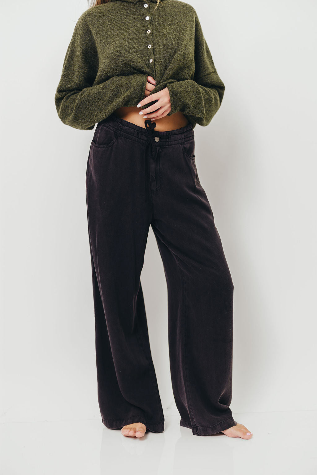 GARMENT DETAILS: Slouchy trousers in a soft Tencel Lyocell blend. Features a button/zipper closure with adjustable tie detail. Features a wide-leg silhouette, dual side pockets, and relaxed fit.