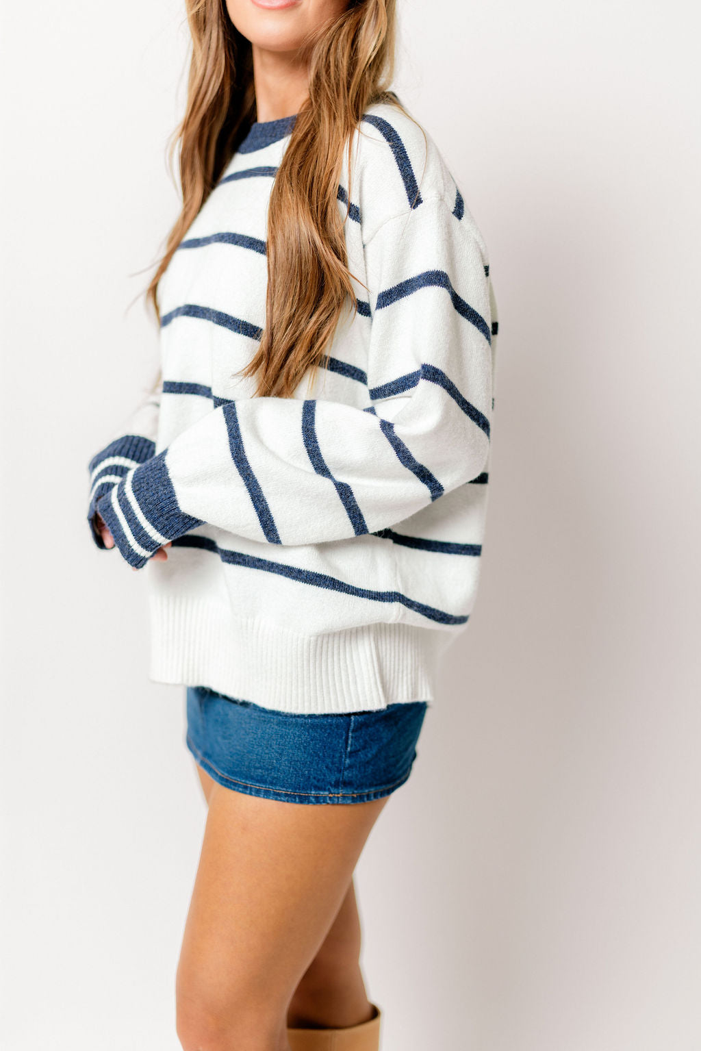 The Ezra Sweater combines an ultra-soft knit construction with classic stripes--it's everything you need for those wintery days ahead. With its slouchy fit and subtle old-money vibe, this top is an easy favorite (and makes a great gift!)