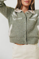 GARMENT DETAILS: Soft and feminine cardigan with long sleeves, collared neckline, and ribbed trim, with front button placket. Finished with dainty feather embroidery.