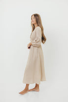 GARMENT DETAILS: Lightweight cotton gauze midi dress. Features V-neckline with self-tie detail, inverted empire waist, and full skirt with in-seam pockets. Finished with long balloon sleeves. This colorway is lined.