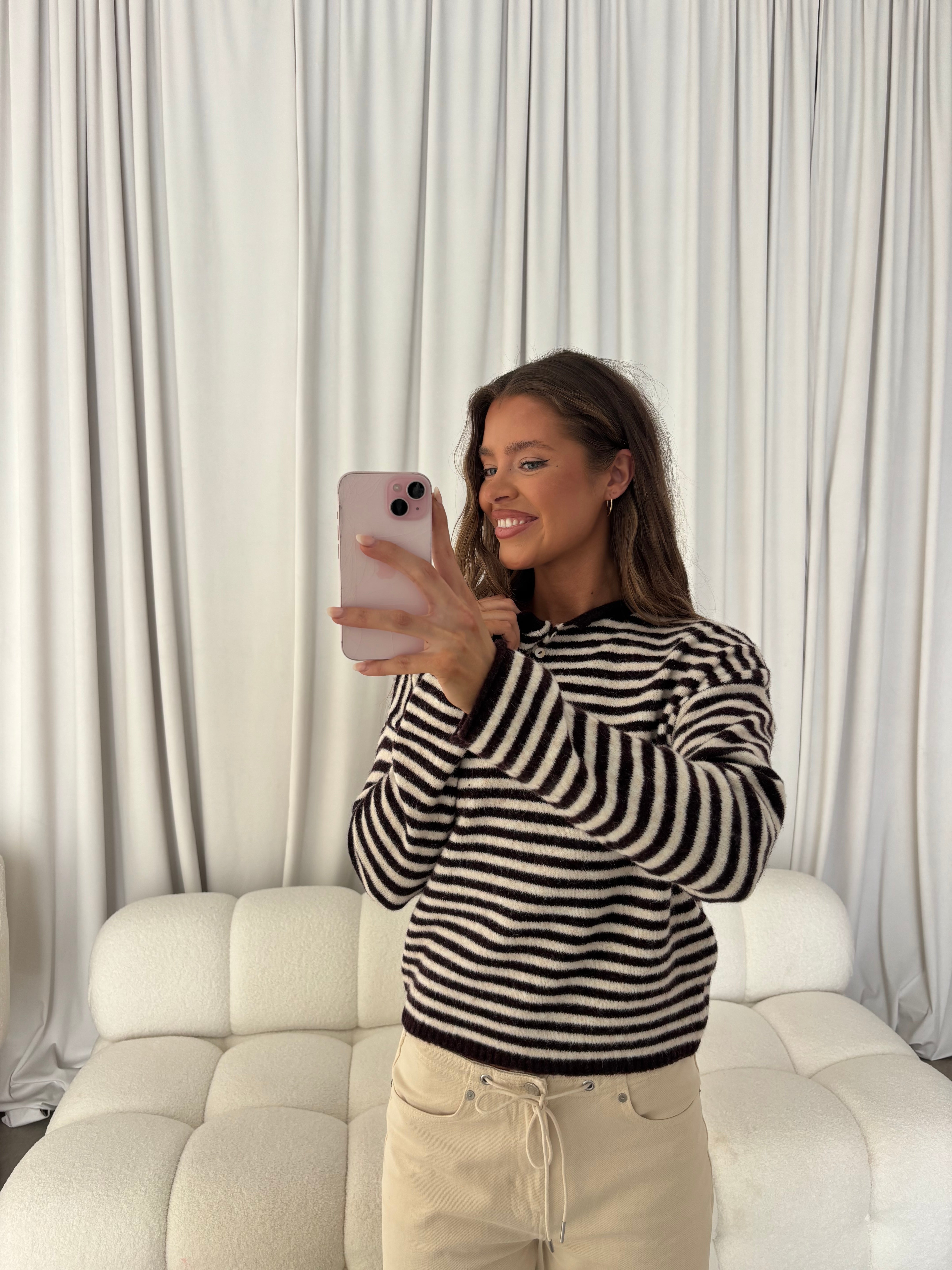 GARMENT DETAILS: Buttery soft knit sweater in a classic striped pattern with contrast color trim. Features a crewneck, dropped shoulders, and 1/4 front placket with functional buttons.