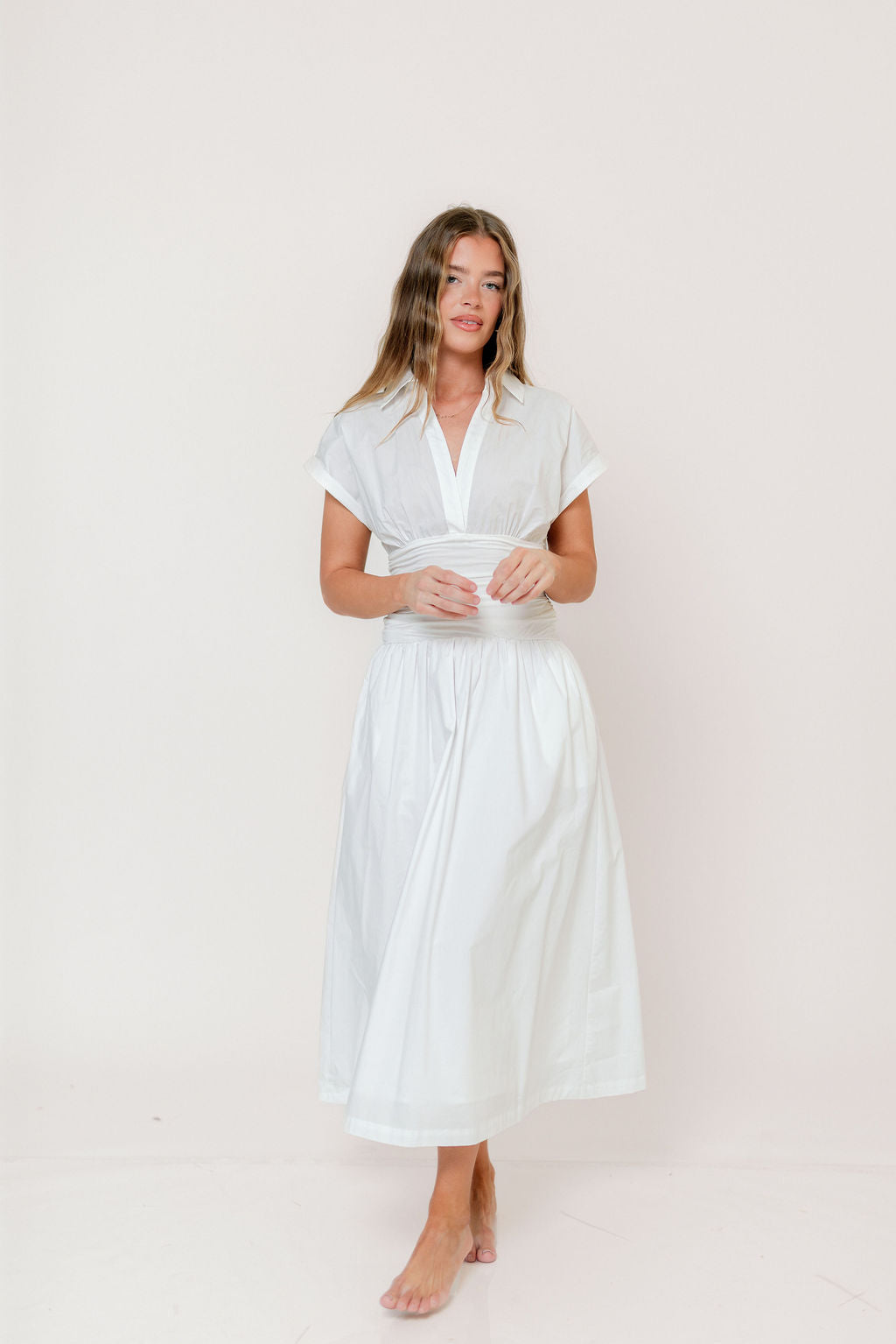 Cressida Ruched Waist Poplin Maxi Dress in White