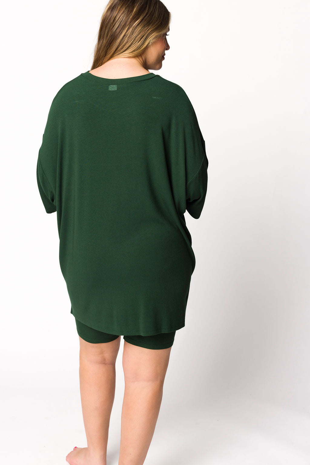 GARMENT DETAILS: Lounge set in a soft, ribbed material. Top features a crewneck, relaxed fit, and short sleeves, with asymmetrical hem. Shorts feature an elasticized, wide waistband in a biker-short length.