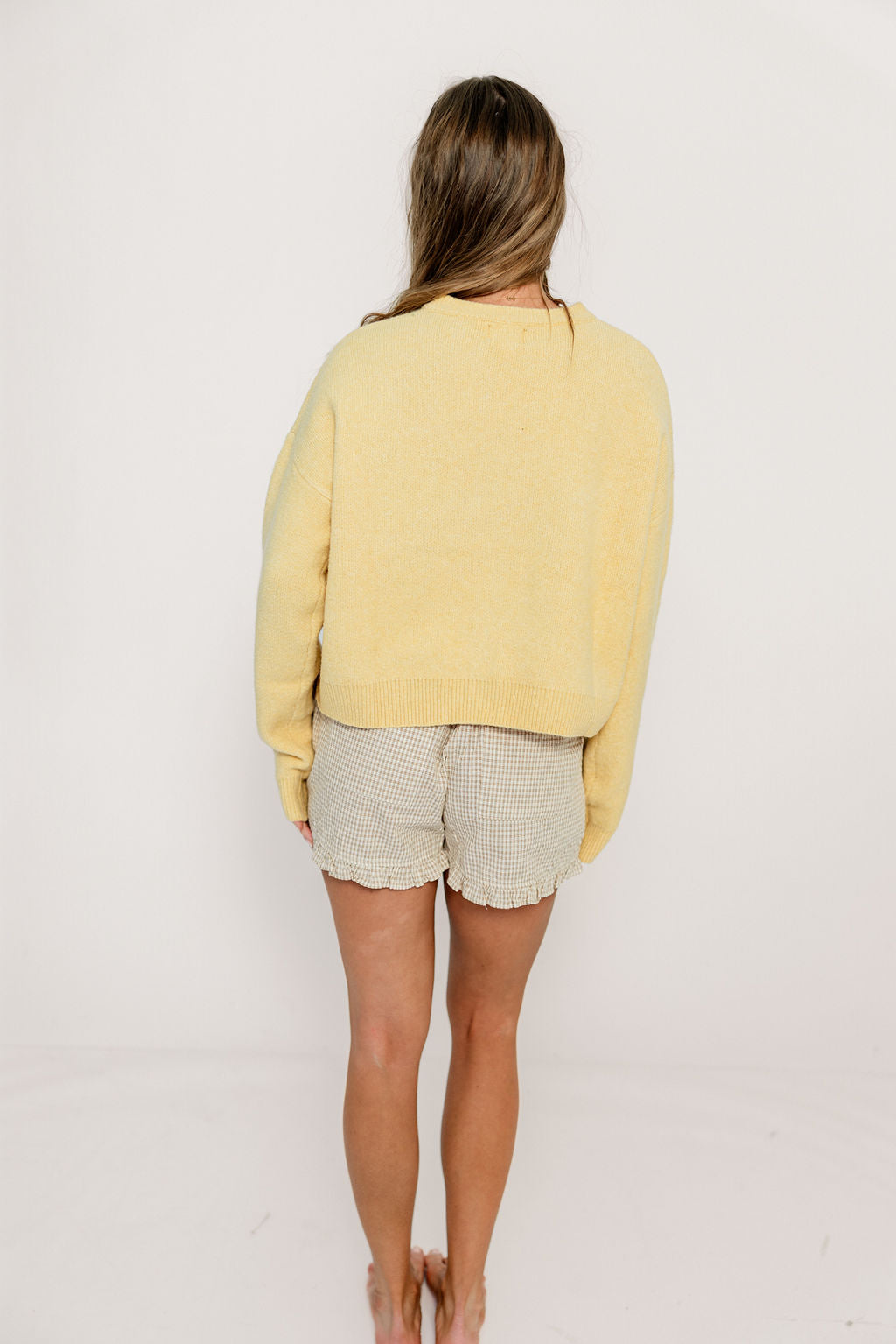 GARMENT DETAILS: Cozy knit cardigan, with rounded neckline, dropped shoulders, and long sleeves. Features front button placket and gentle crop.