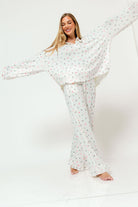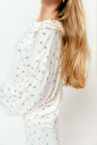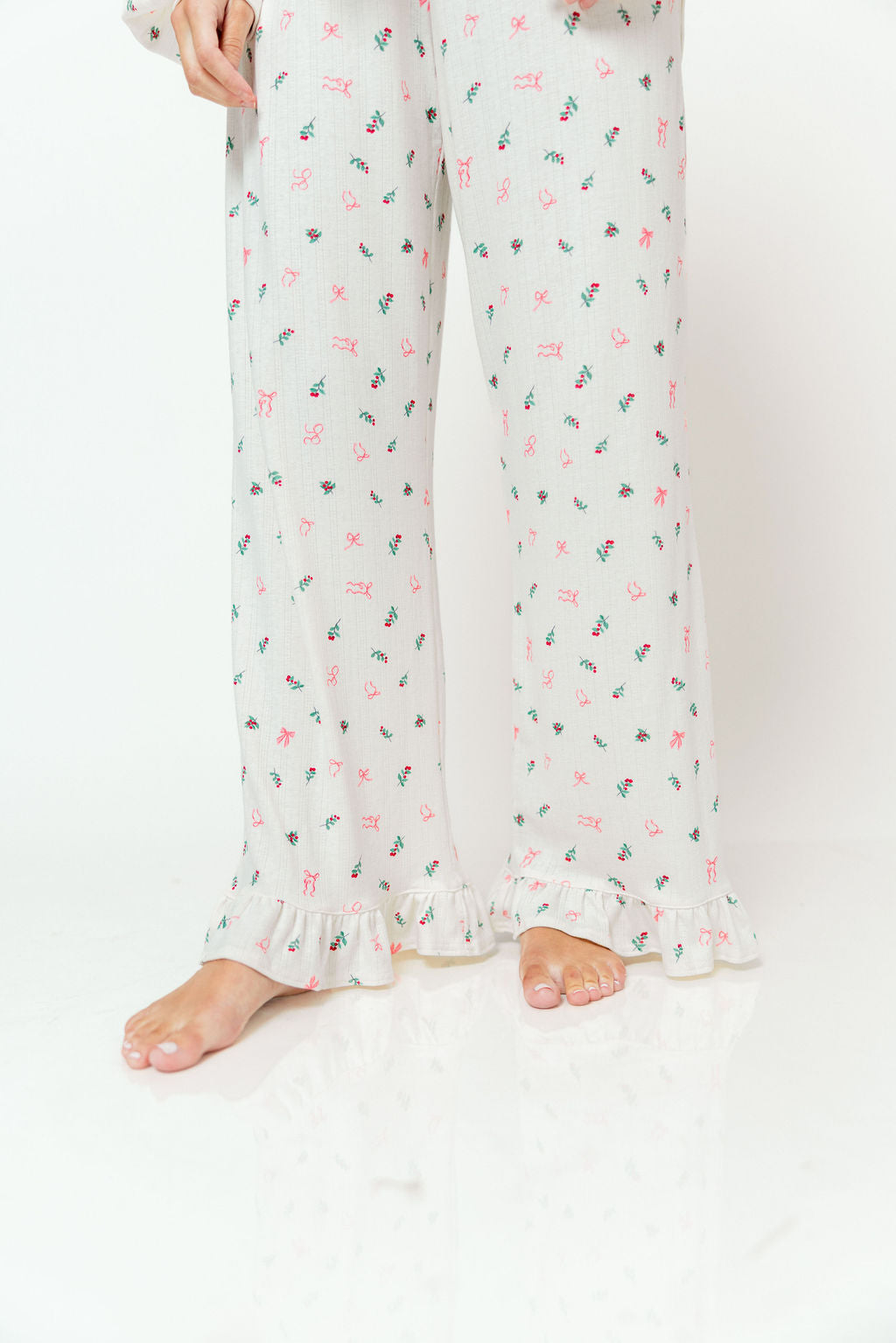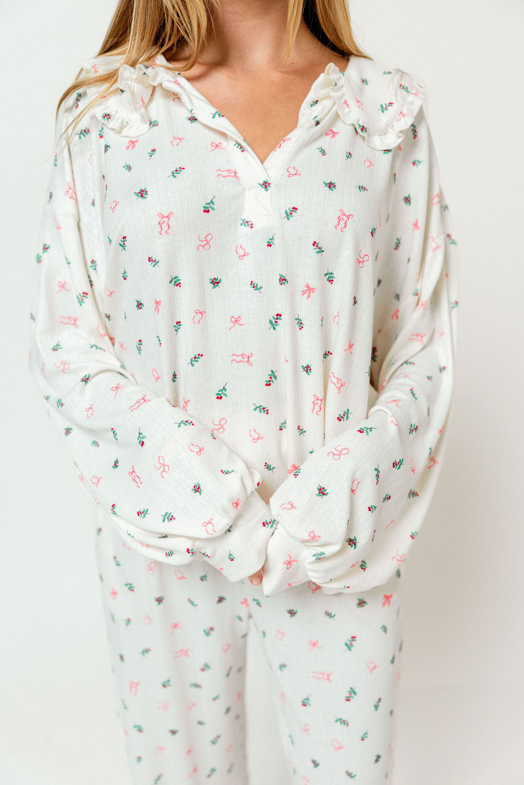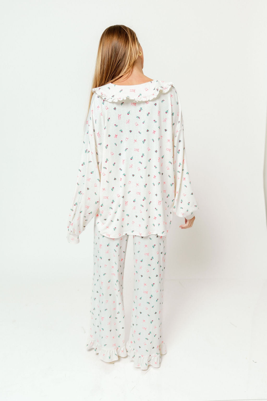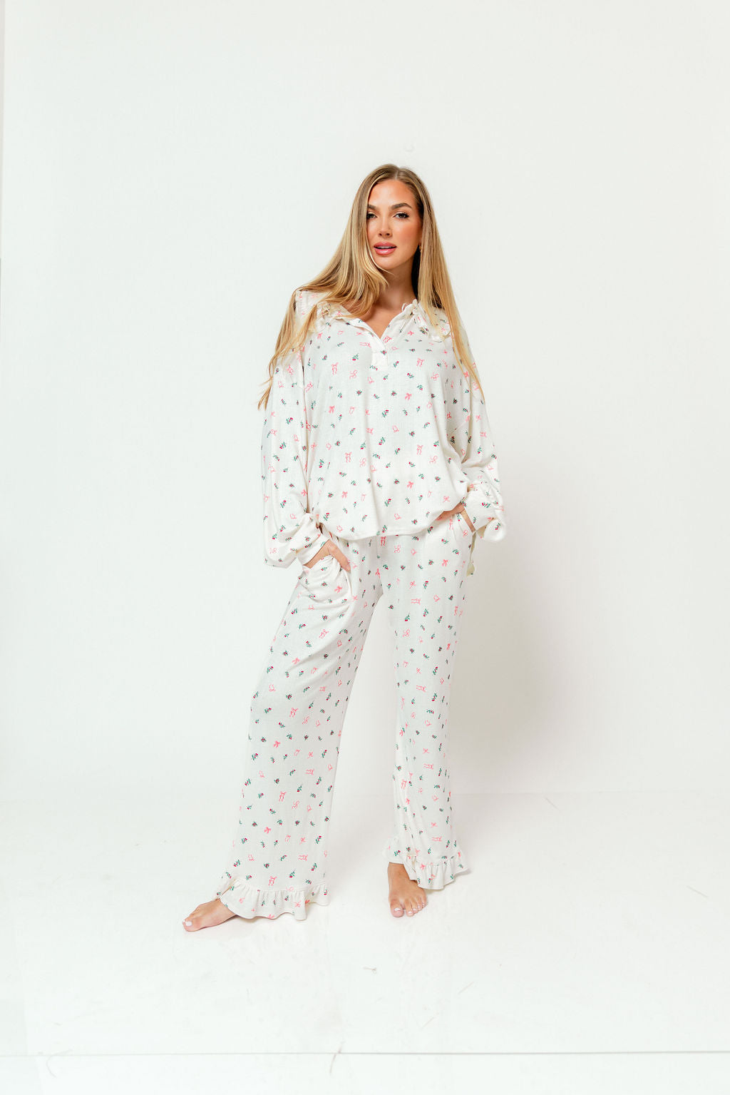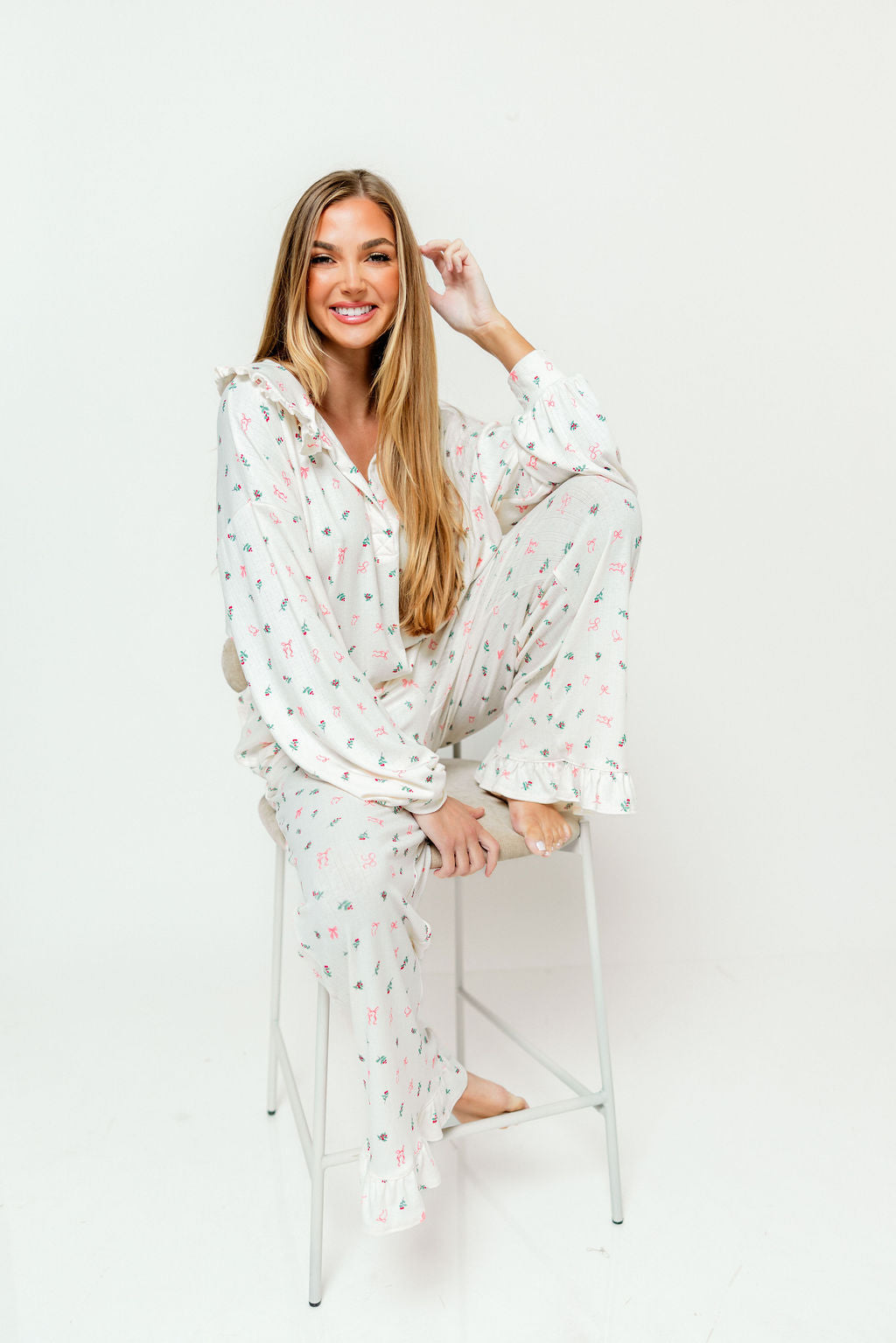 Get cozy and festive with the Carol Pointelle Pajama Set! With dainty ruffles and a charming print, these pajamas are ultra cozy and as cute to lounge in as they are comfortable!
