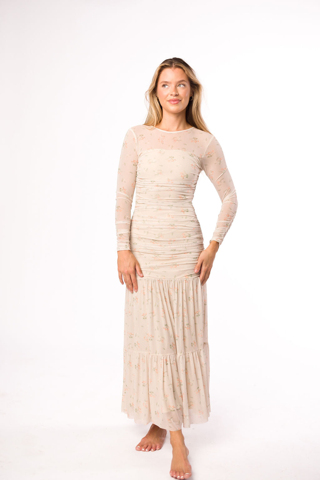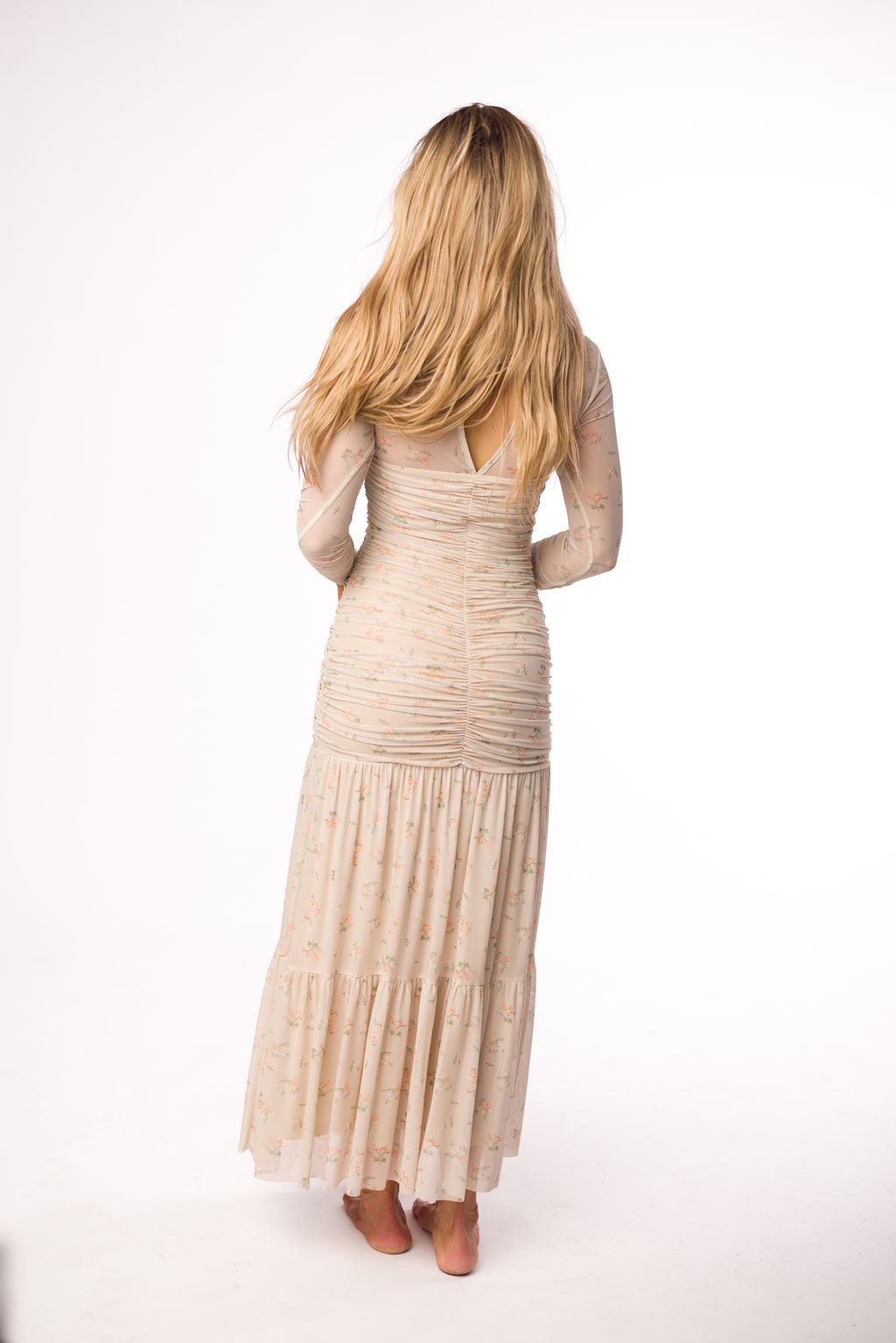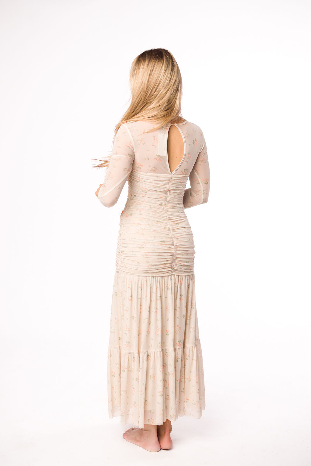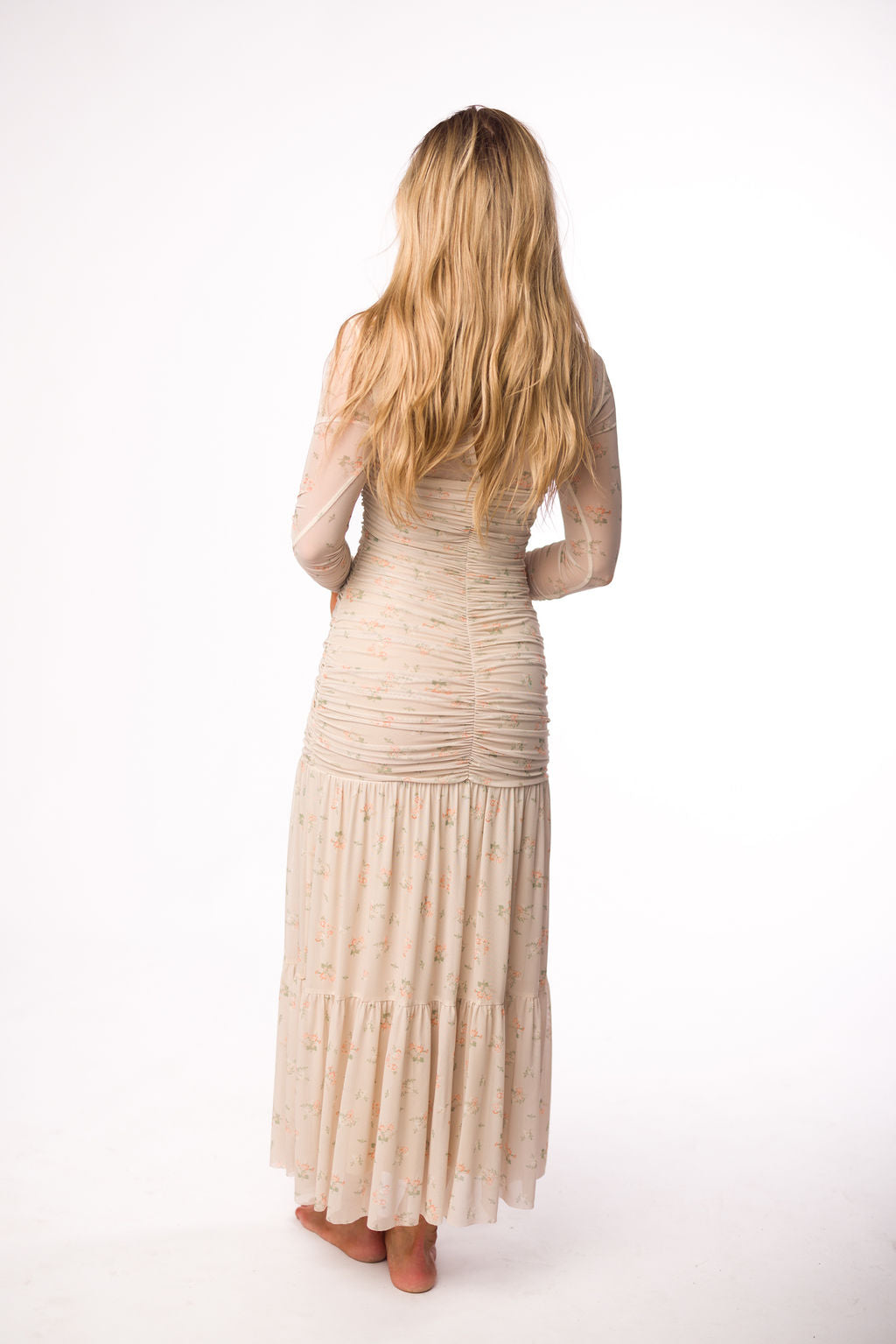 Camille Mesh Gathered Side Seam Maxi Dress in Nude Multi Floral - Bump Friendly