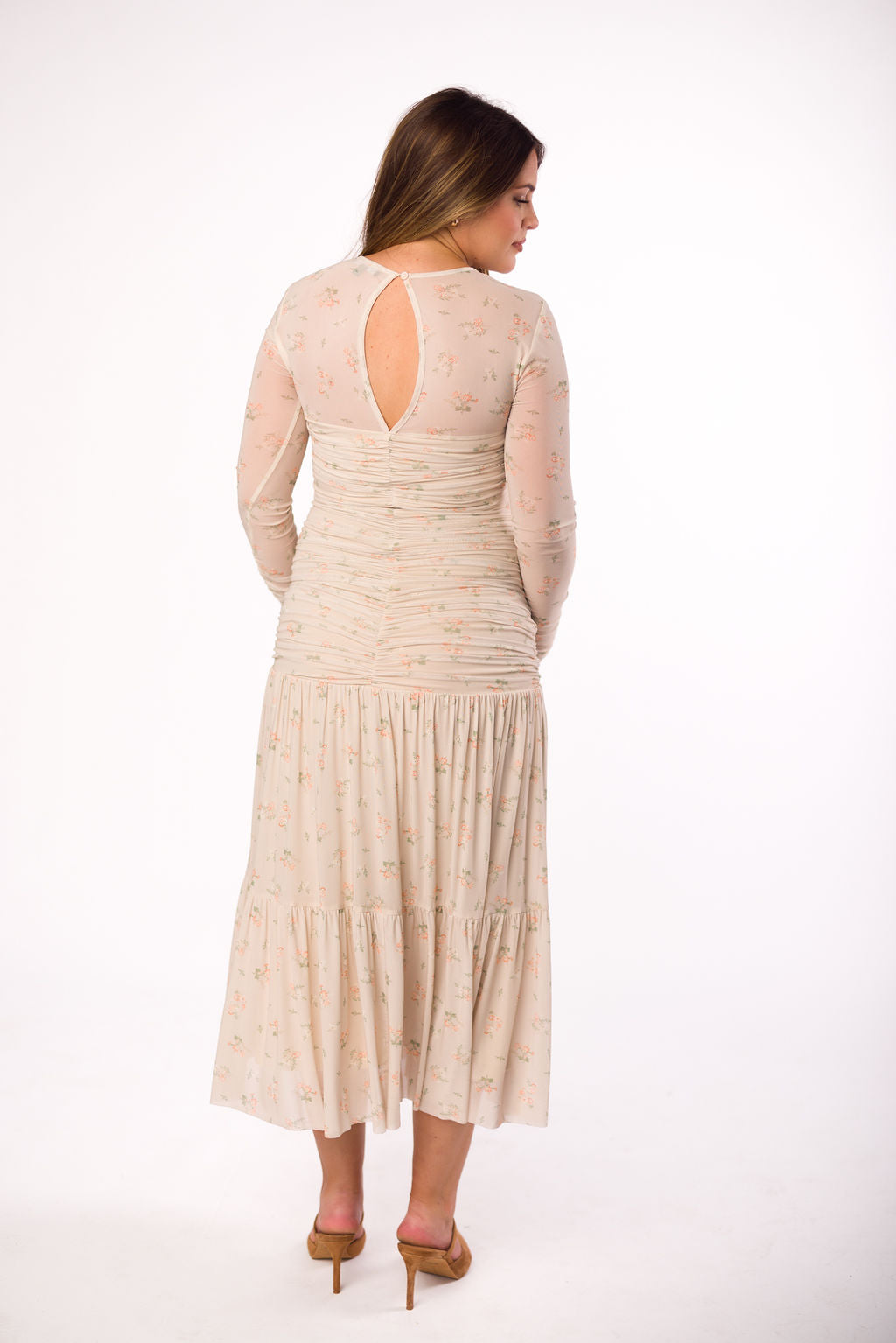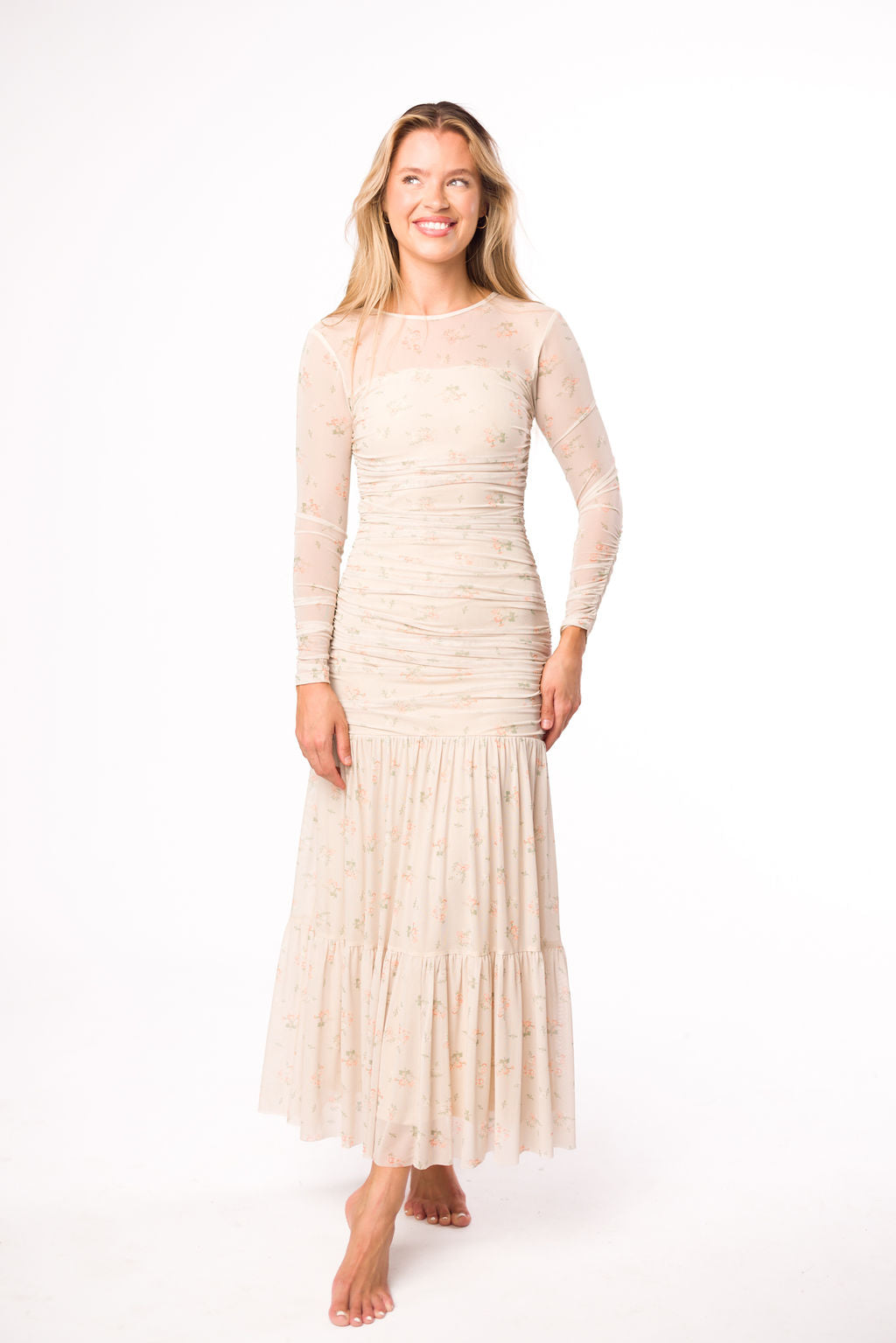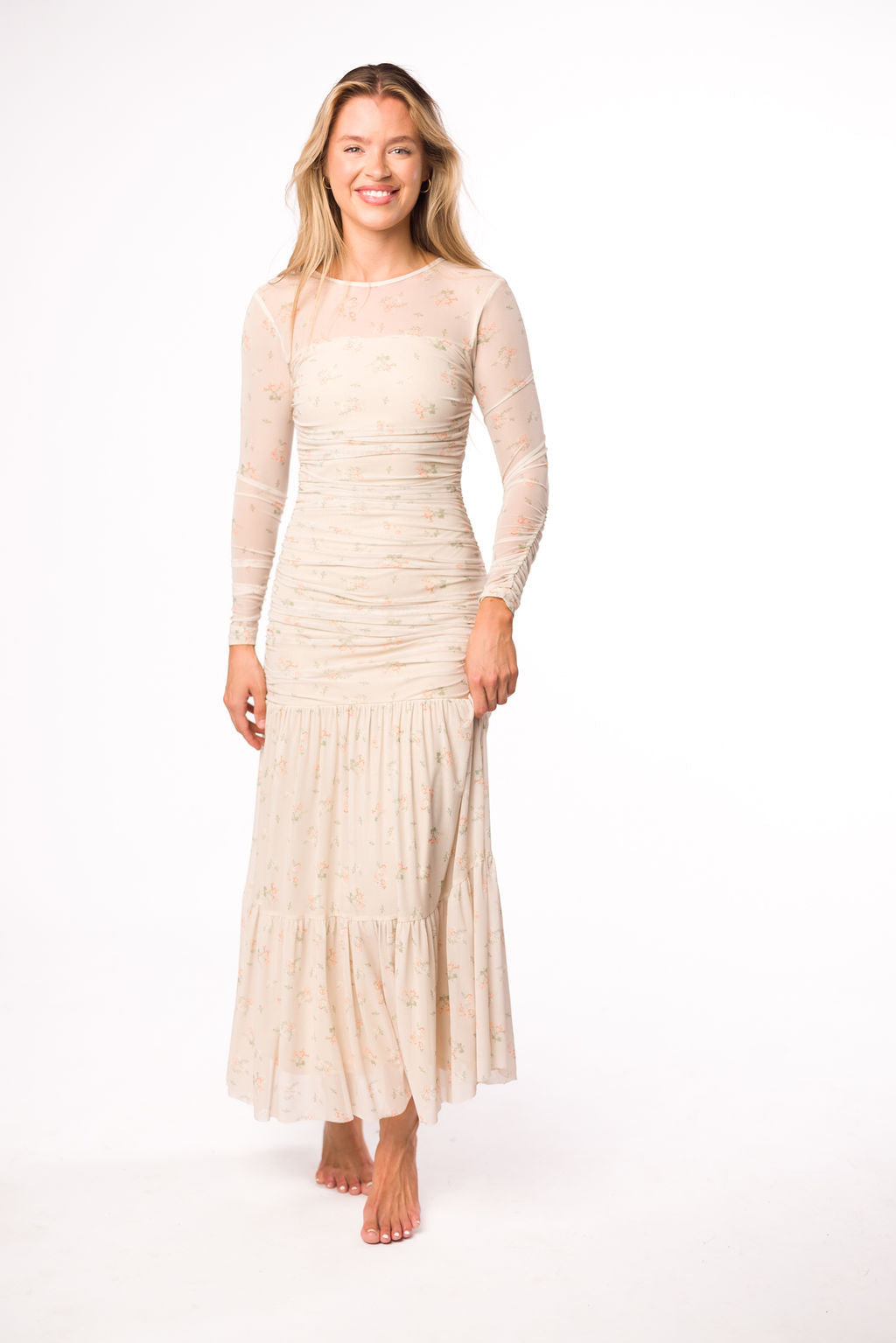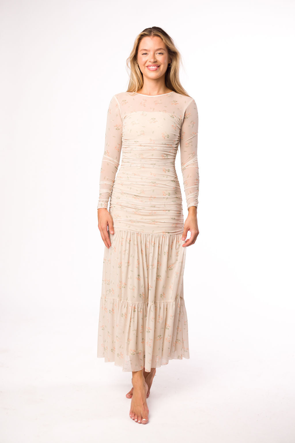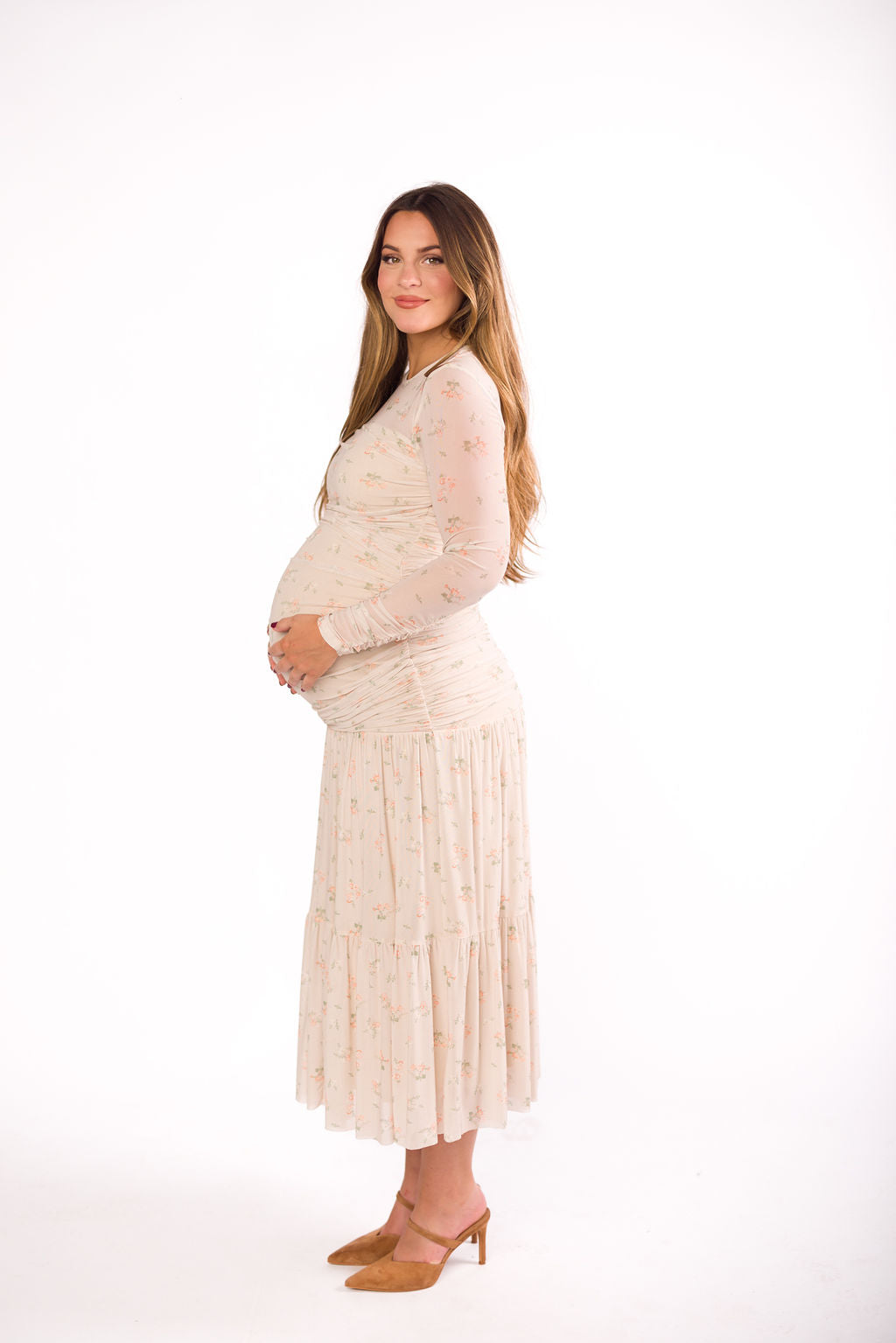Camille Mesh Gathered Side Seam Maxi Dress in Nude Multi Floral - Bump Friendly