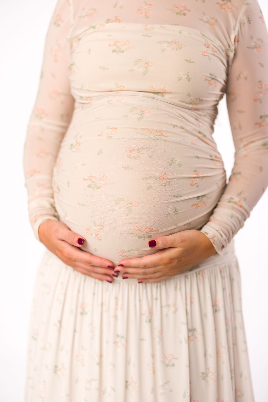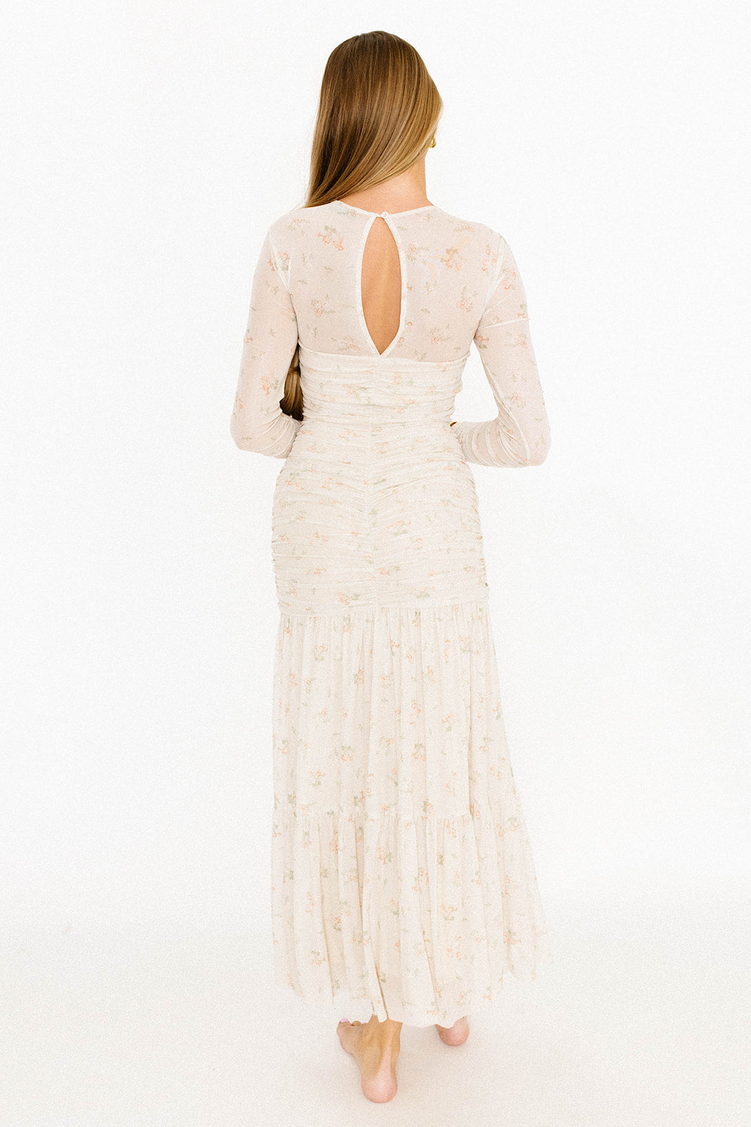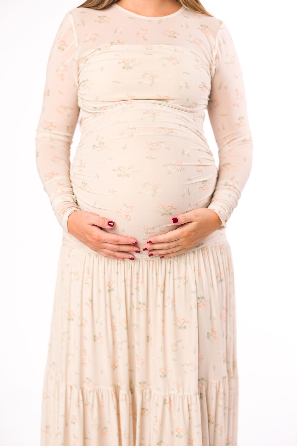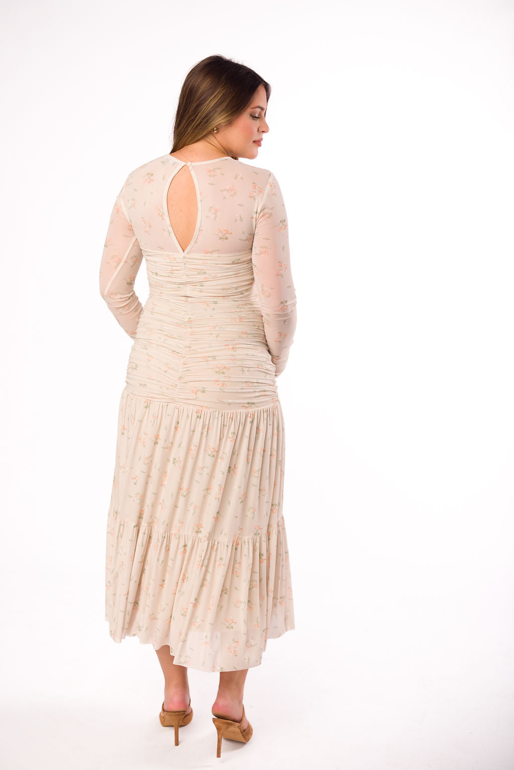 Camille Mesh Gathered Side Seam Maxi Dress in Nude Multi Floral - Bump Friendly