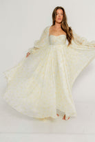 GARMENT DETAILS: Premium floral maxi dress in a lightweight, shirred chiffon. Features a soft bustier-style bodice (no boning), sweetheart neckline, smocked back panel, and sheer long sleeves with elastic cuffs and ruffles. Sleeves can be worn on or off the shoulder. Finished with a sweeping maxi-length skirt and dramatic train. Lined.