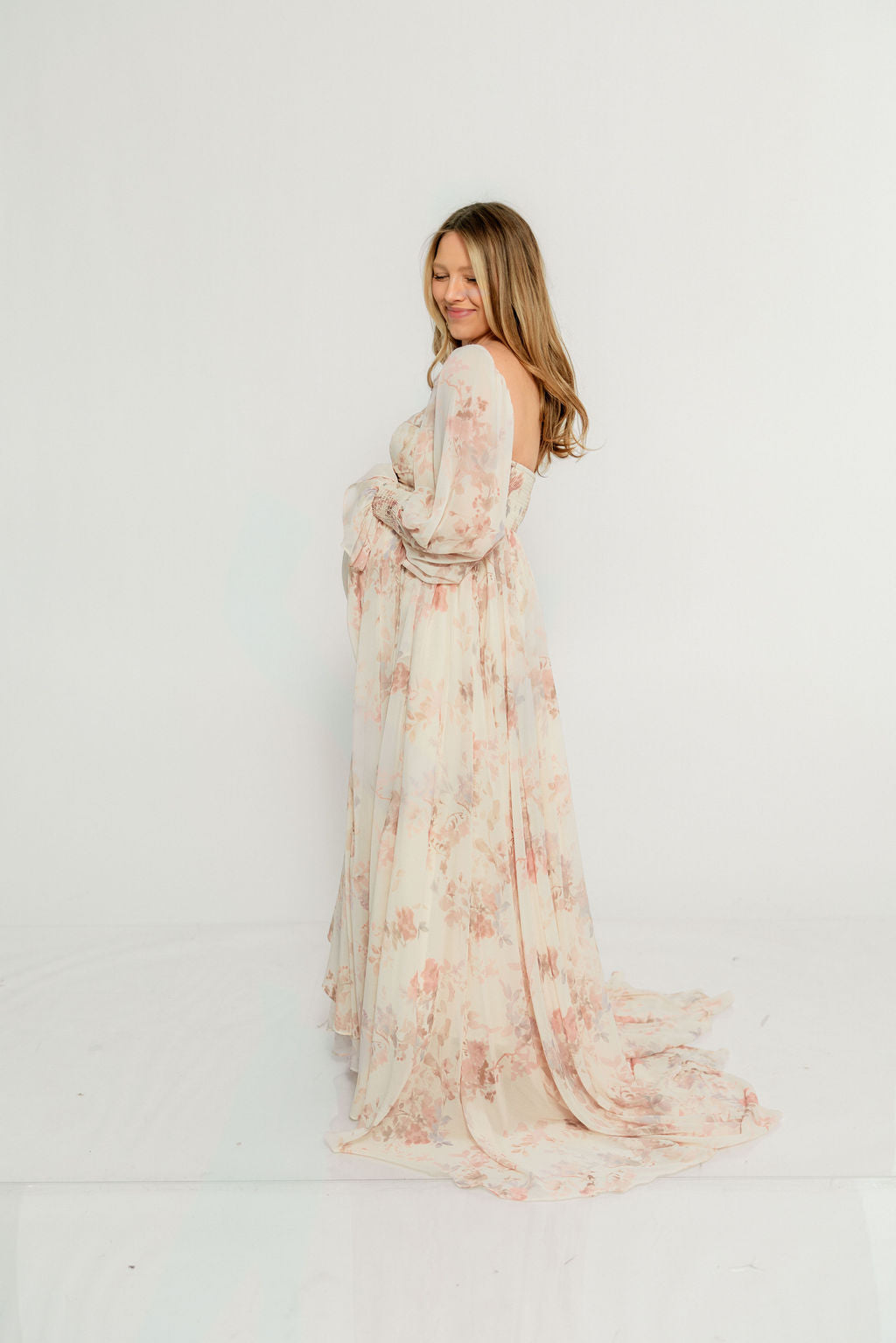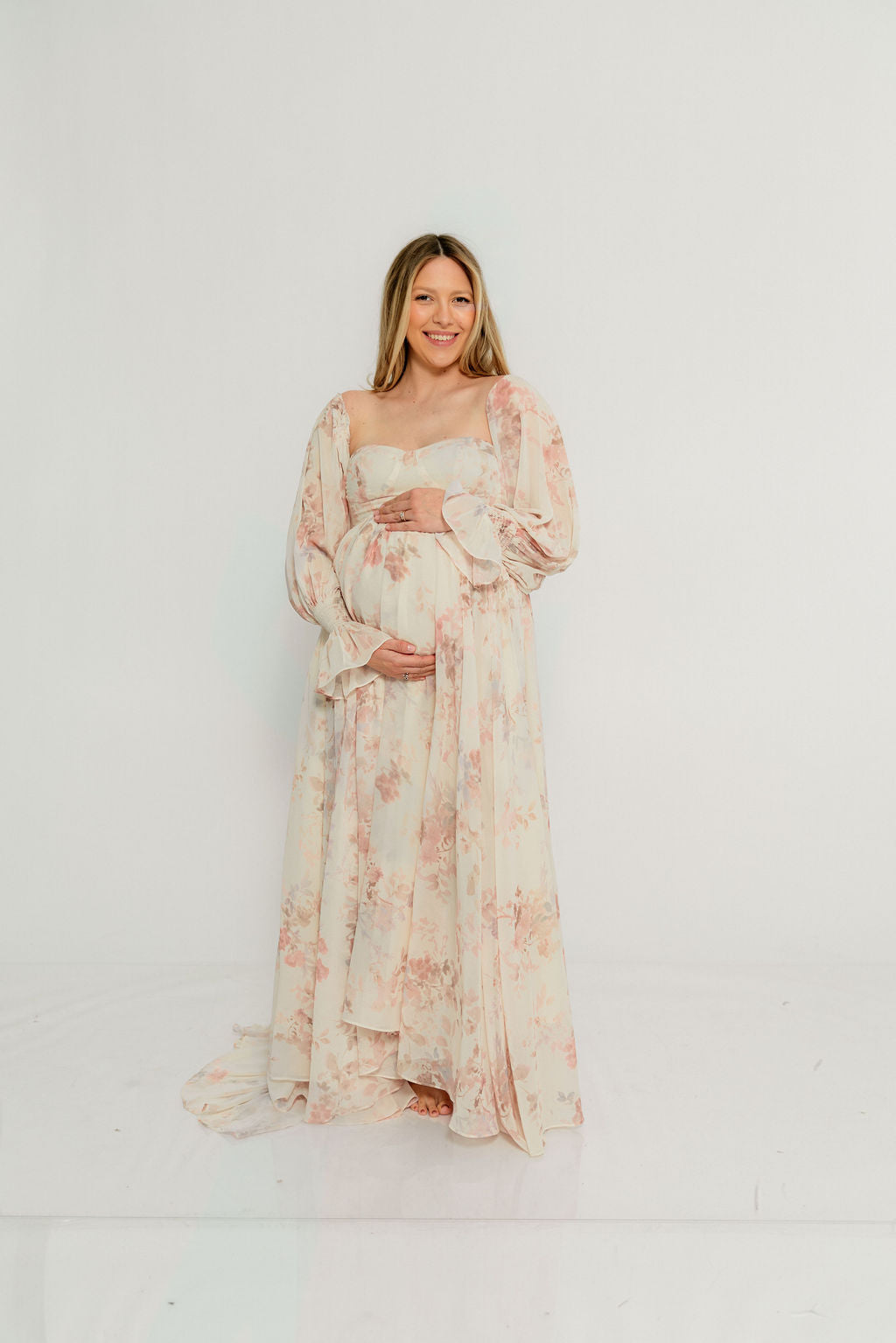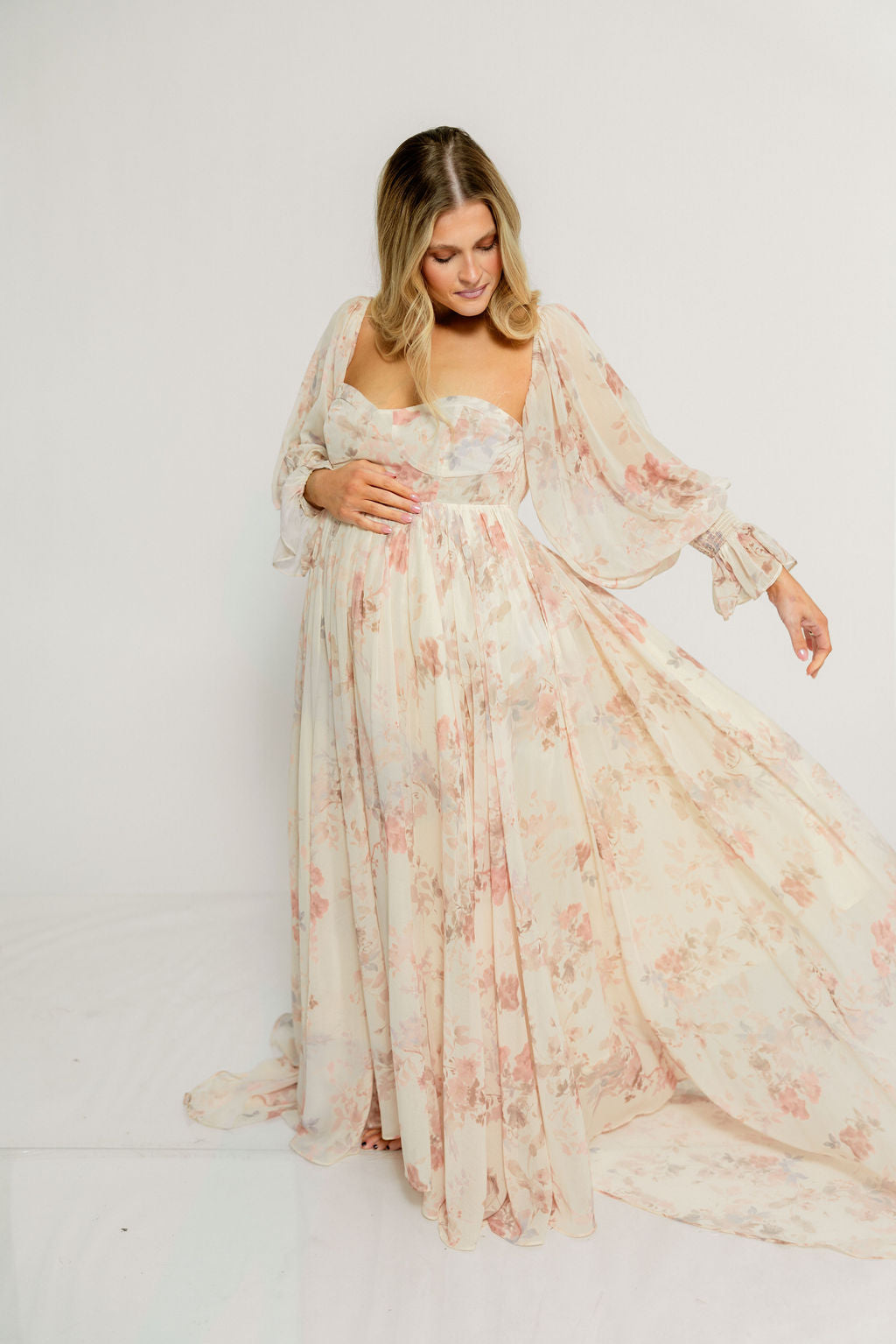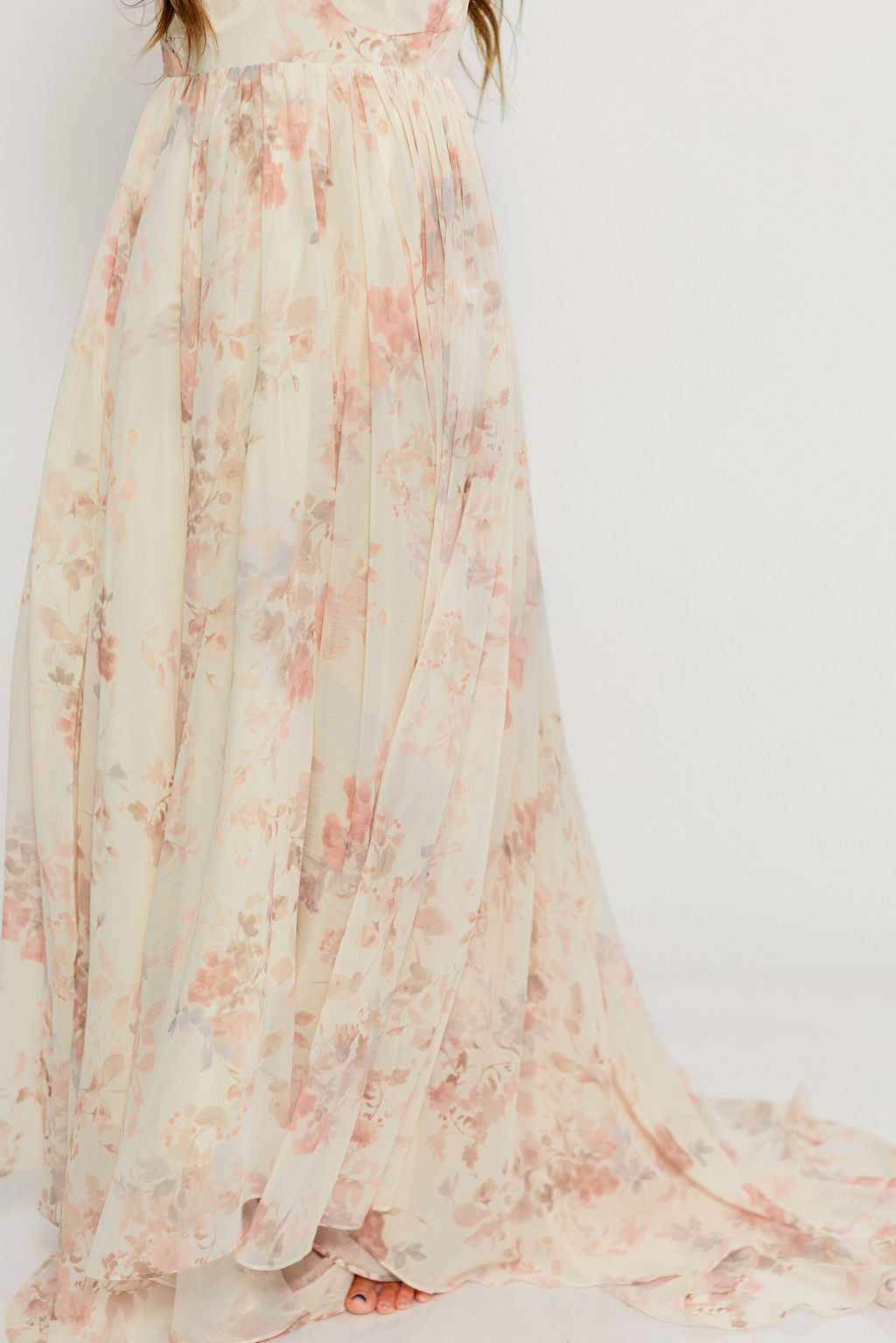This gown deserves the word breathtaking. Meet the Delilah Maxi, an absolutely stunning statement dress that is both whimsical and romantic. This premium gown is crafted from eight yards of lightweight floral material, with a bustier-style bodice, swoon-worthy skirt and train, and sheer sleeves that can be worn on or off the shoulder depending on your mood! The Delilah Dress is a centerpiece of a dress and perfect for every body type, including expecting mamas. (P.S. it makes an incredible client closet dress for photographers!)