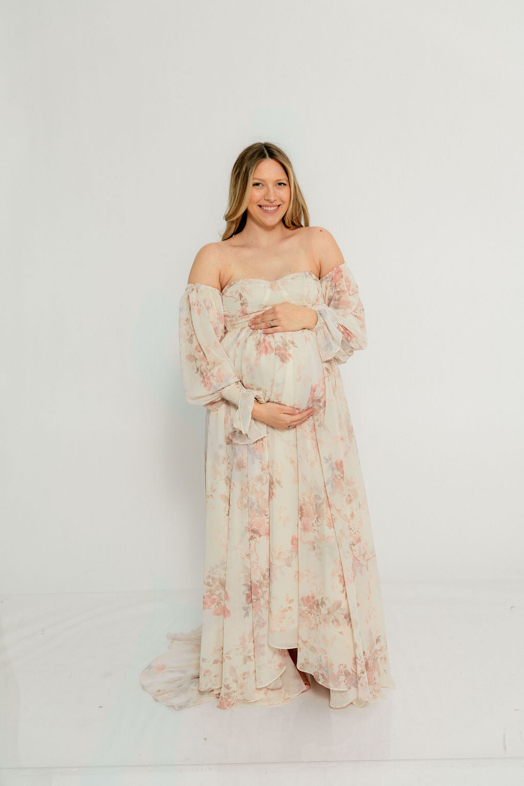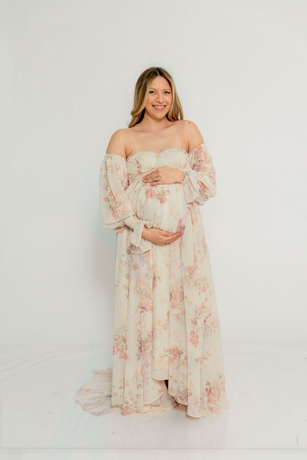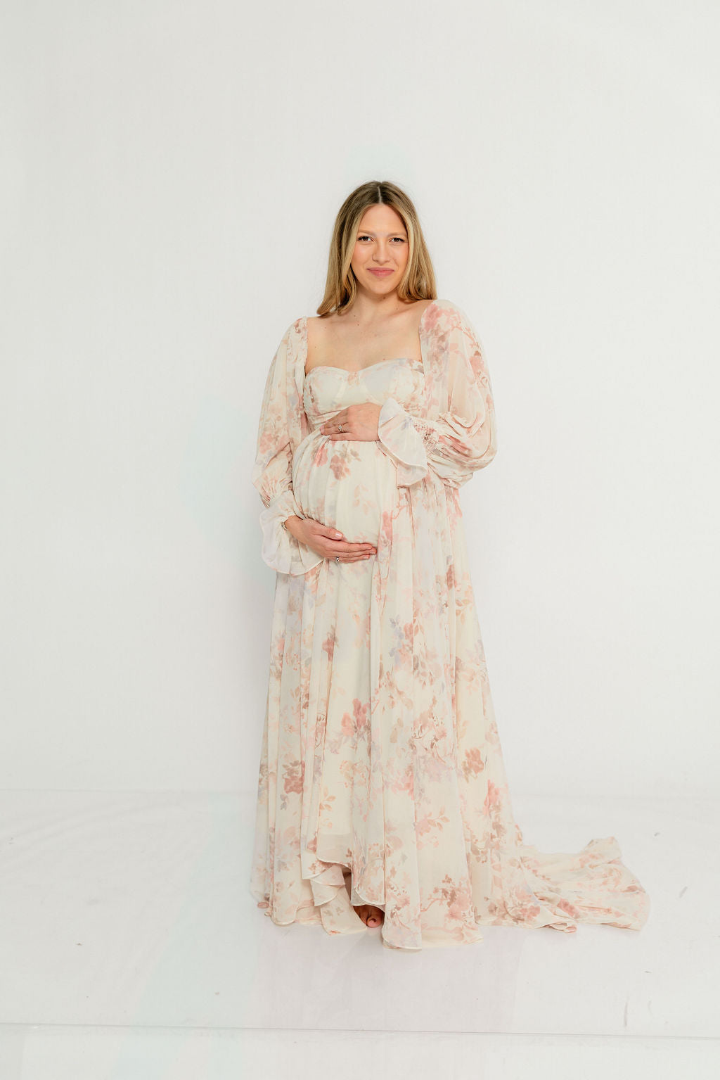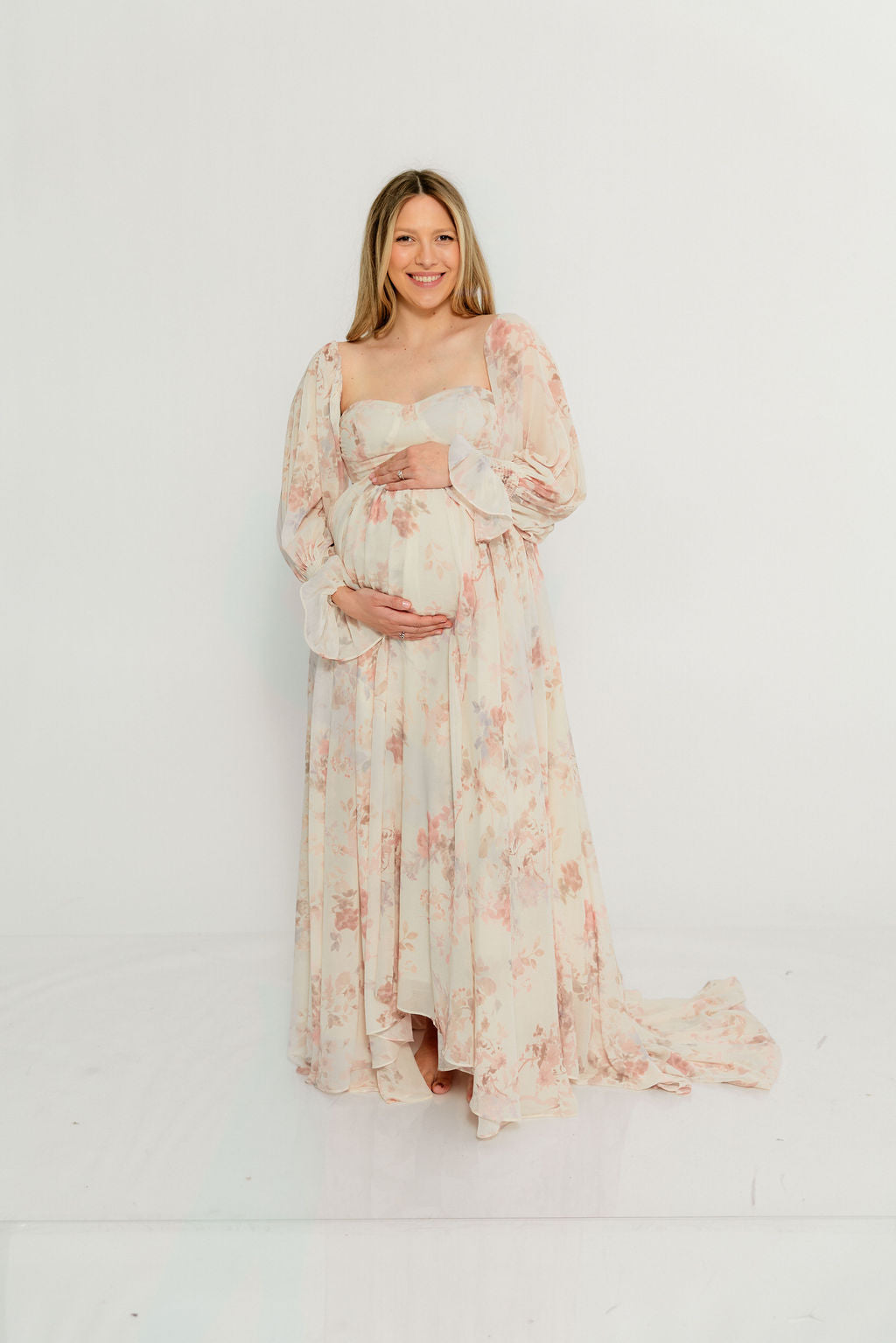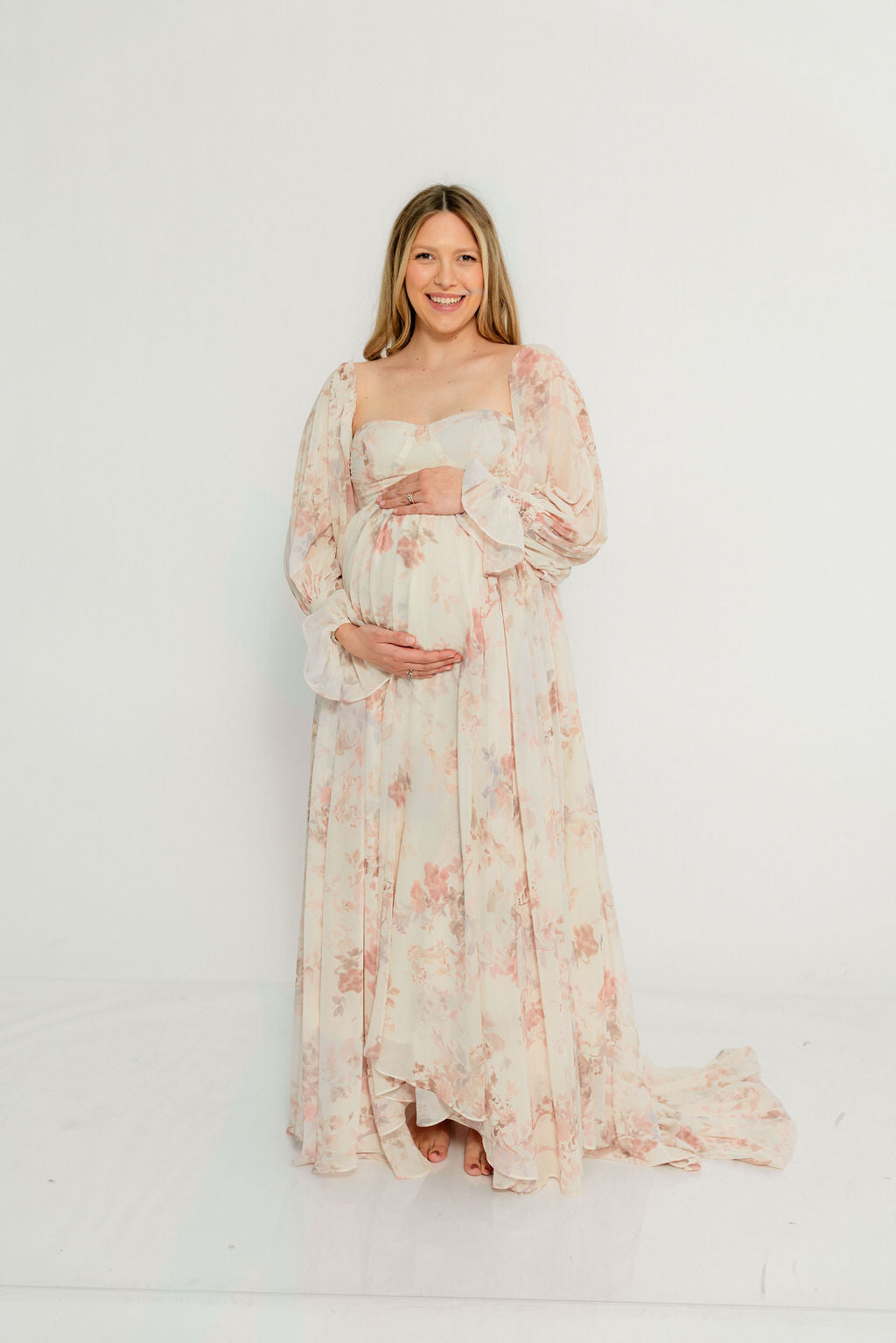 This gown deserves the word breathtaking. Meet the Delilah Maxi, an absolutely stunning statement dress that is both whimsical and romantic. This premium gown is crafted from eight yards of lightweight floral material, with a bustier-style bodice, swoon-worthy skirt and train, and sheer sleeves that can be worn on or off the shoulder depending on your mood! The Delilah Dress is a centerpiece of a dress and perfect for every body type, including expecting mamas. (P.S. it makes an incredible client closet dress for photographers!)