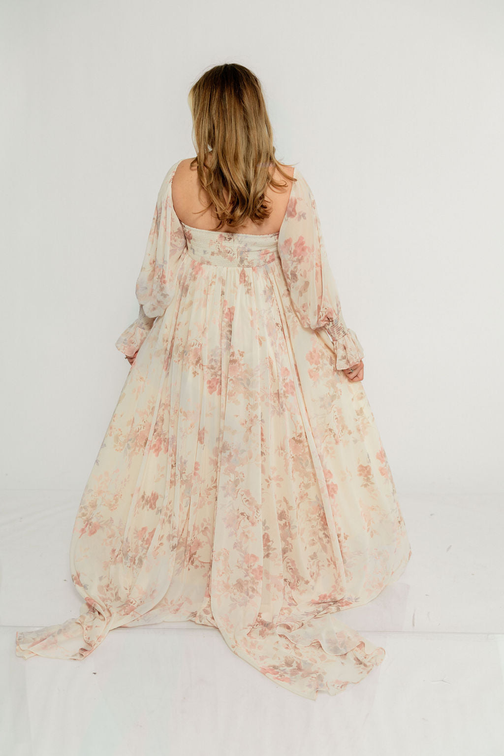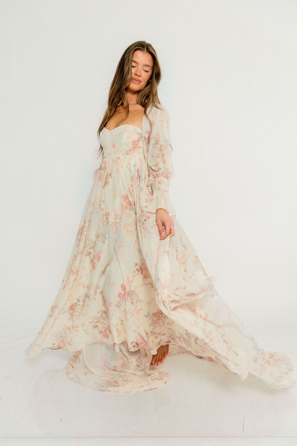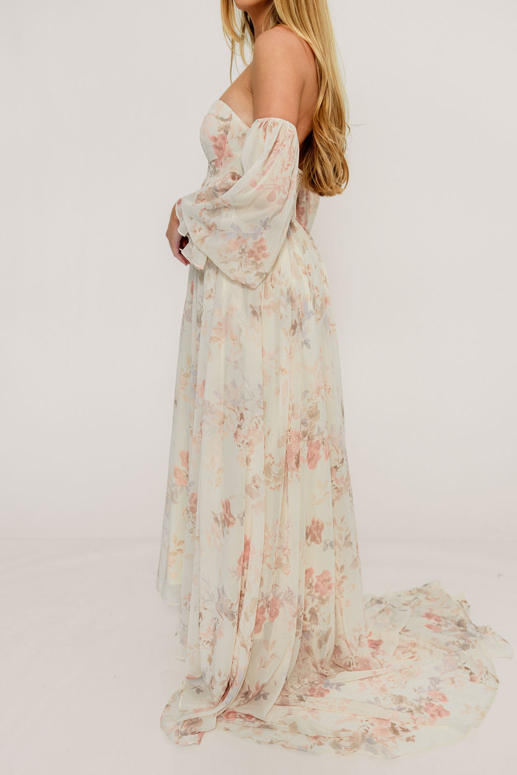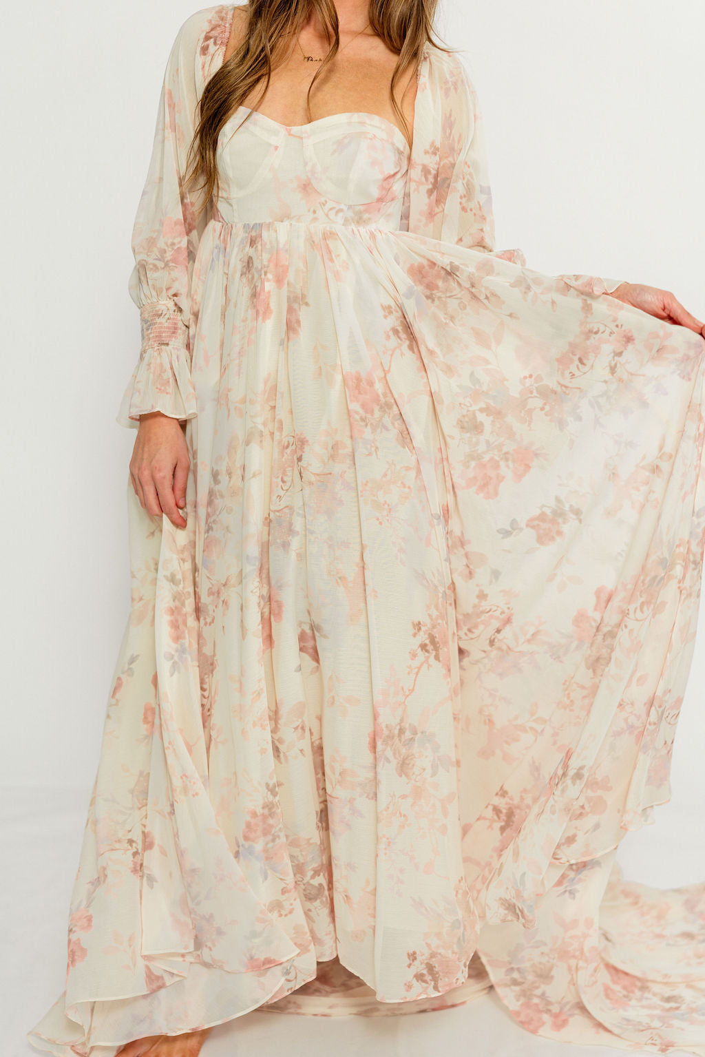 GARMENT DETAILS: Premium floral maxi dress in a lightweight, shirred chiffon. Features a soft bustier-style bodice (no boning), sweetheart neckline, smocked back panel, and sheer long sleeves with elastic cuffs and ruffles. Sleeves can be worn on or off the shoulder. Finished with a sweeping maxi-length skirt and dramatic train. Lined.