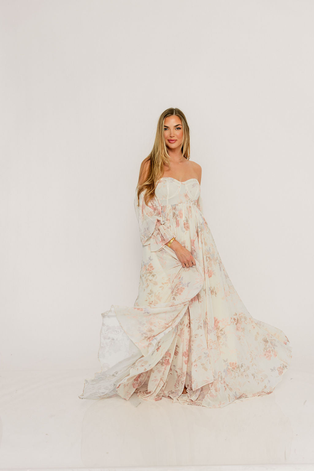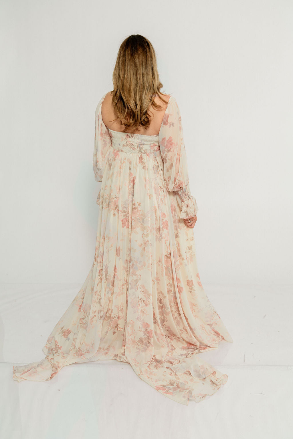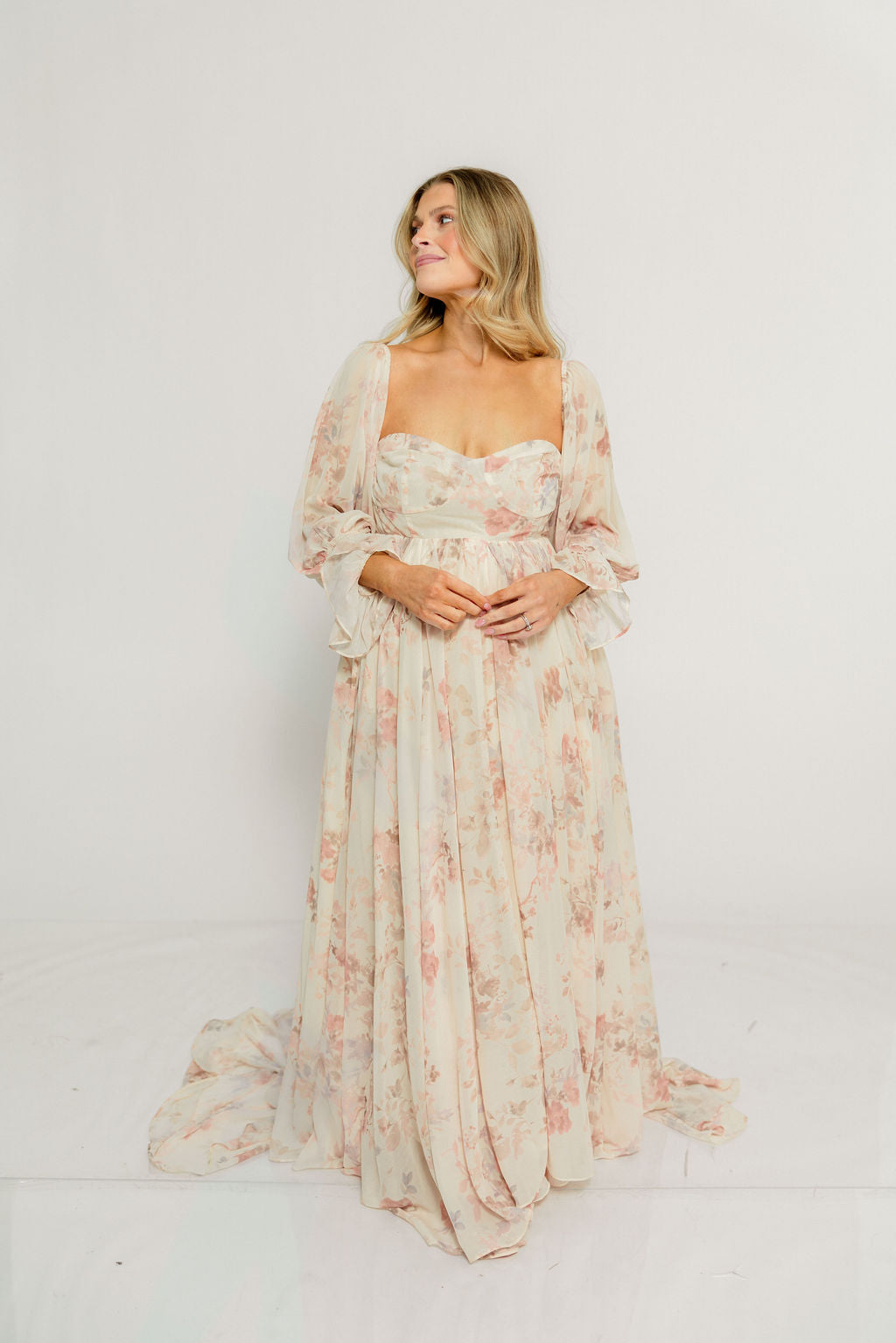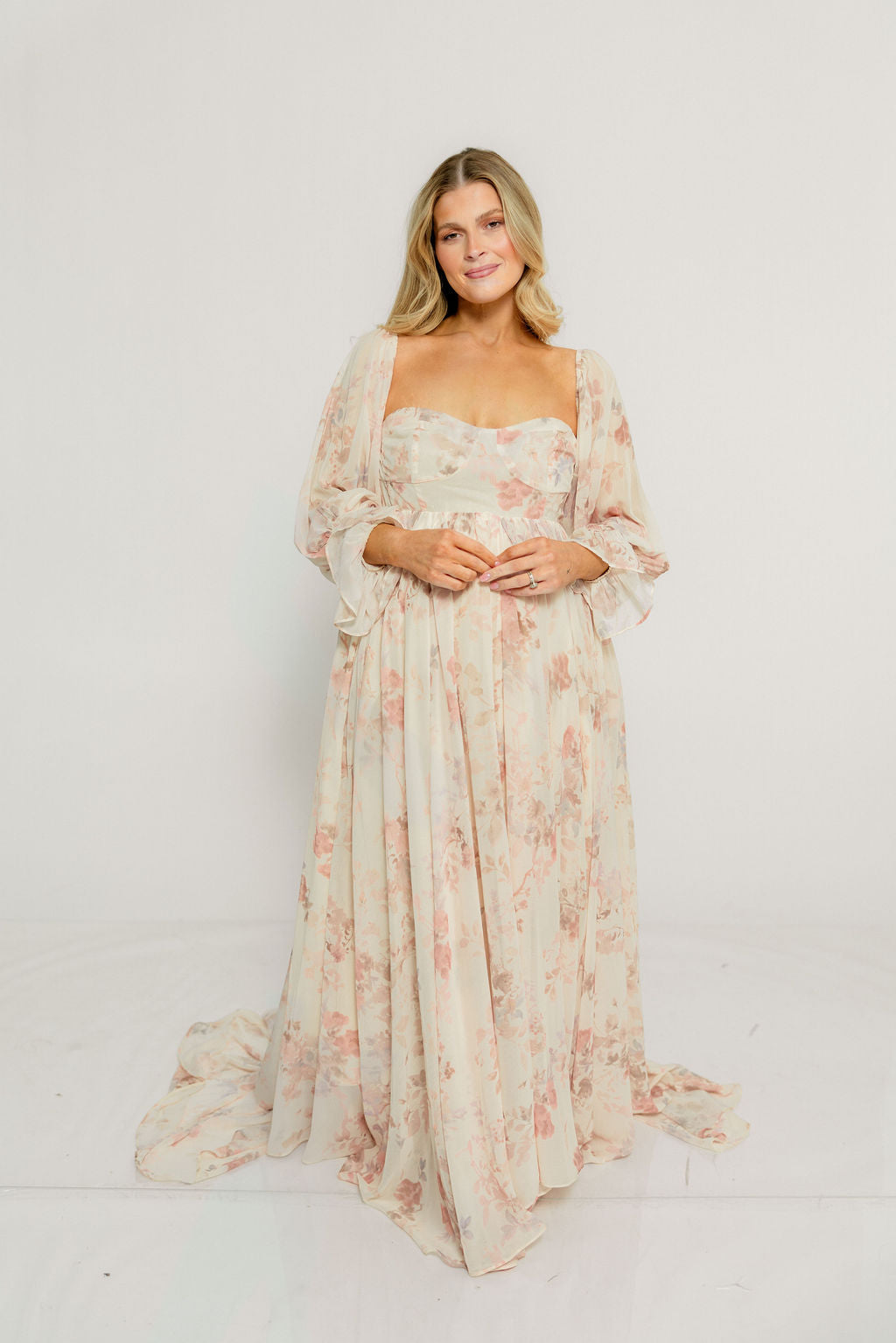 GARMENT DETAILS: Premium floral maxi dress in a lightweight, shirred chiffon. Features a soft bustier-style bodice (no boning), sweetheart neckline, smocked back panel, and sheer long sleeves with elastic cuffs and ruffles. Sleeves can be worn on or off the shoulder. Finished with a sweeping maxi-length skirt and dramatic train. Lined.