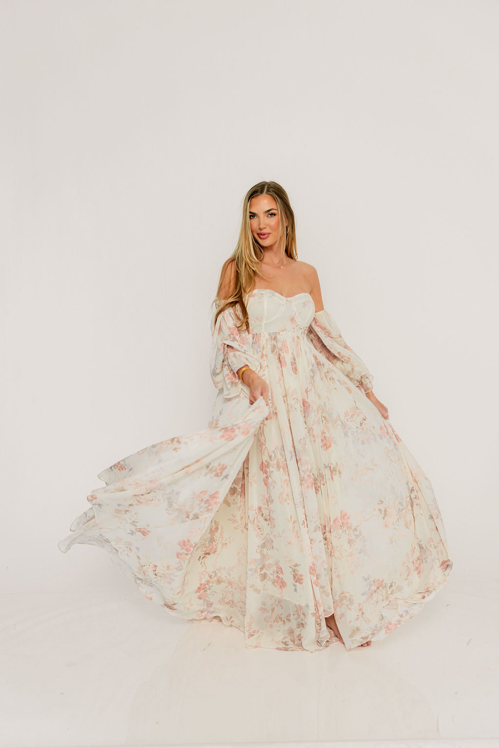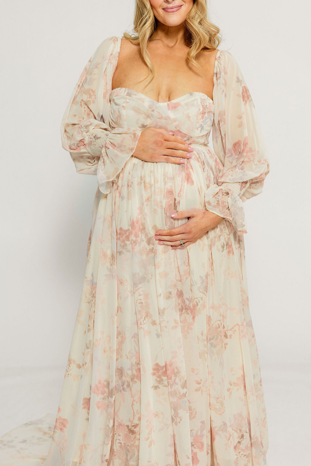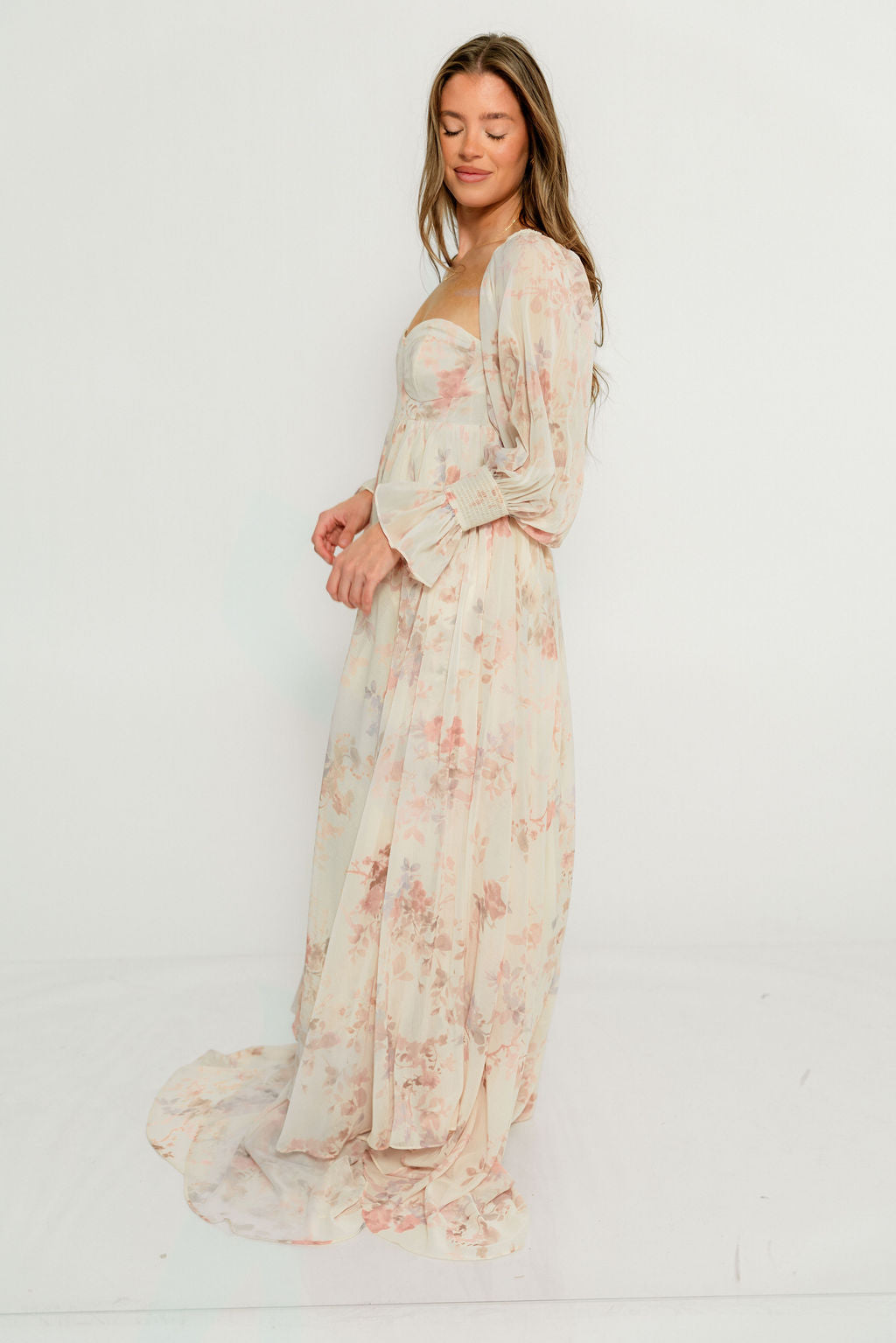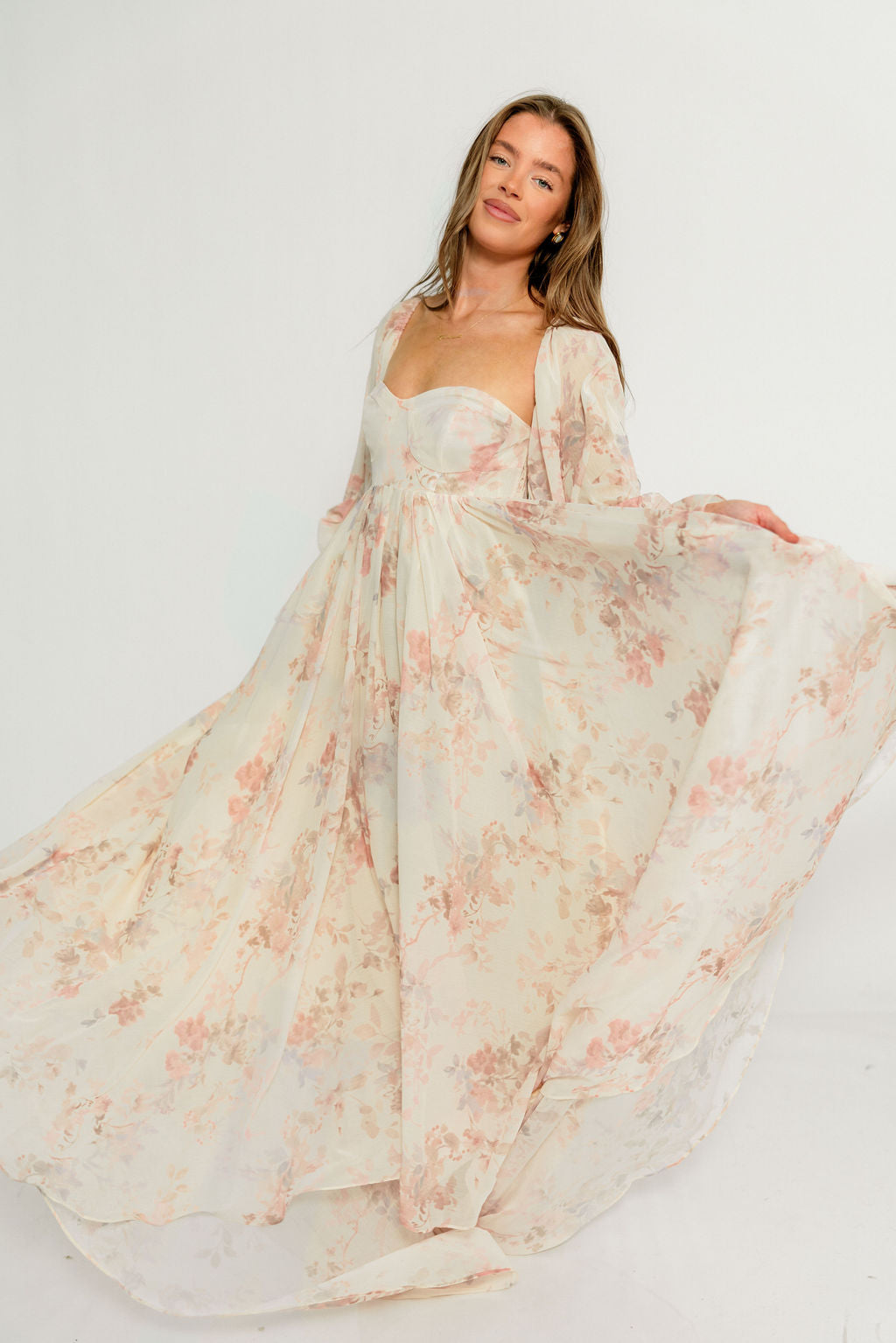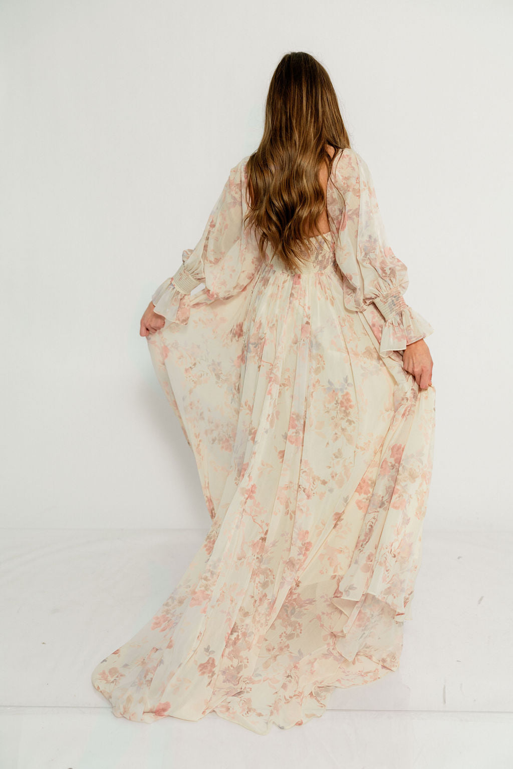GARMENT DETAILS: Premium floral maxi dress in a lightweight, shirred chiffon. Features a soft bustier-style bodice (no boning), sweetheart neckline, smocked back panel, and sheer long sleeves with elastic cuffs and ruffles. Sleeves can be worn on or off the shoulder. Finished with a sweeping maxi-length skirt and dramatic train. Lined.