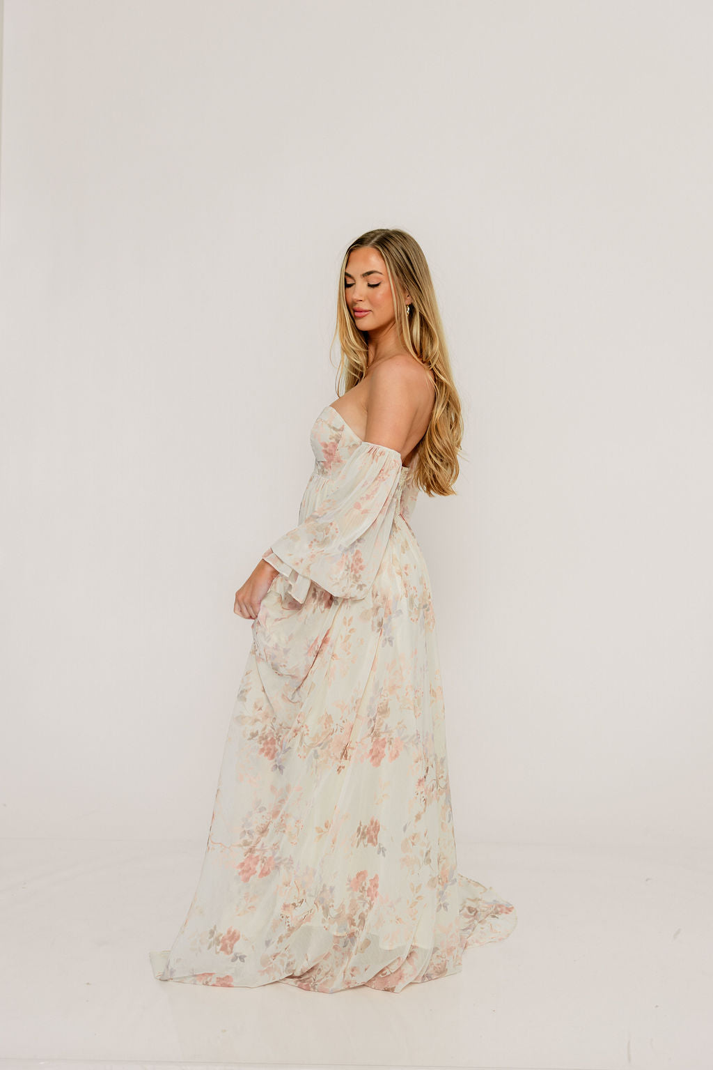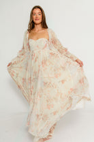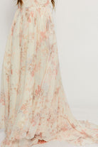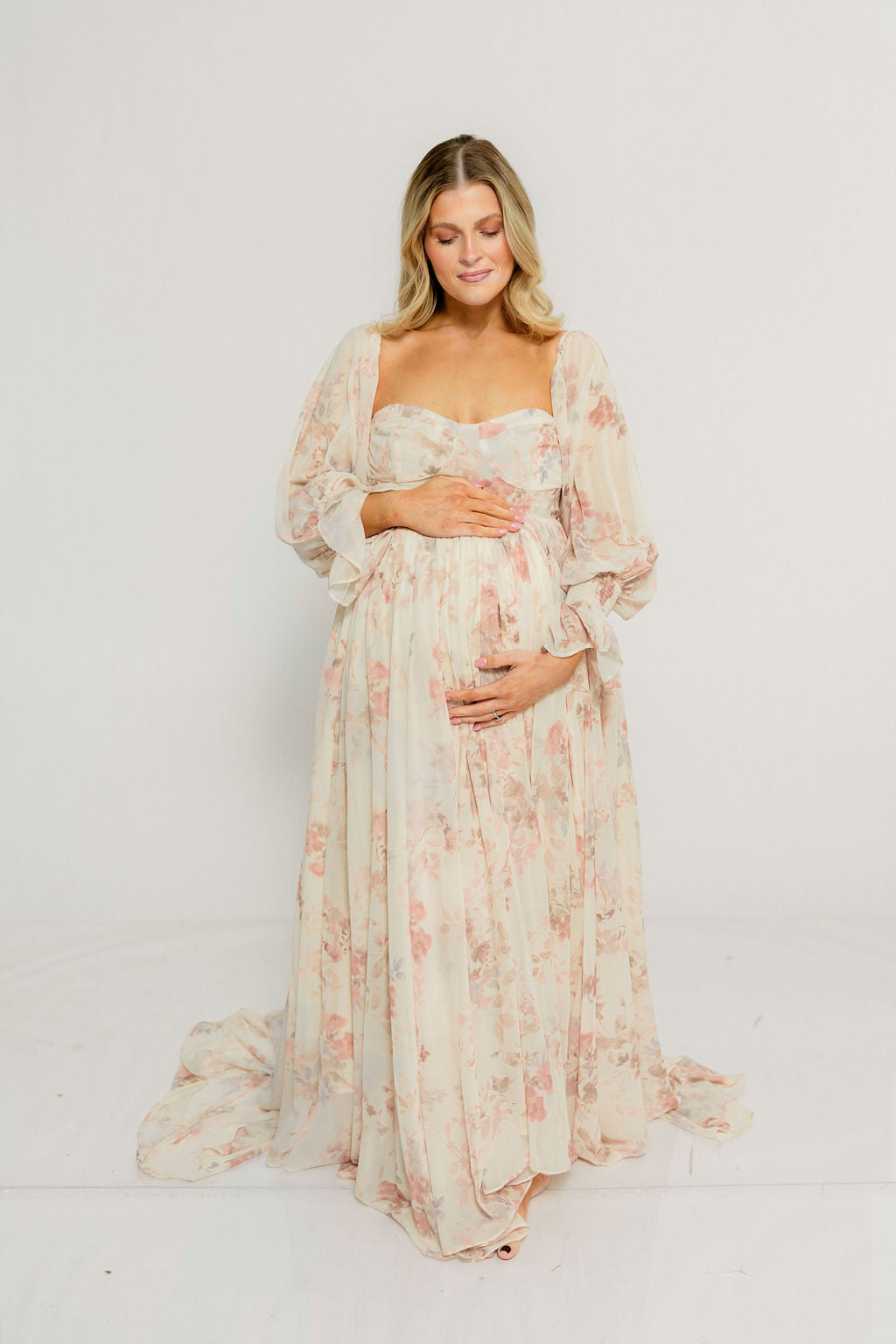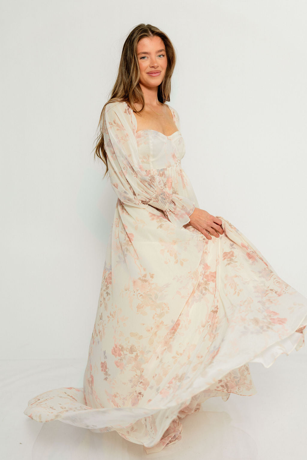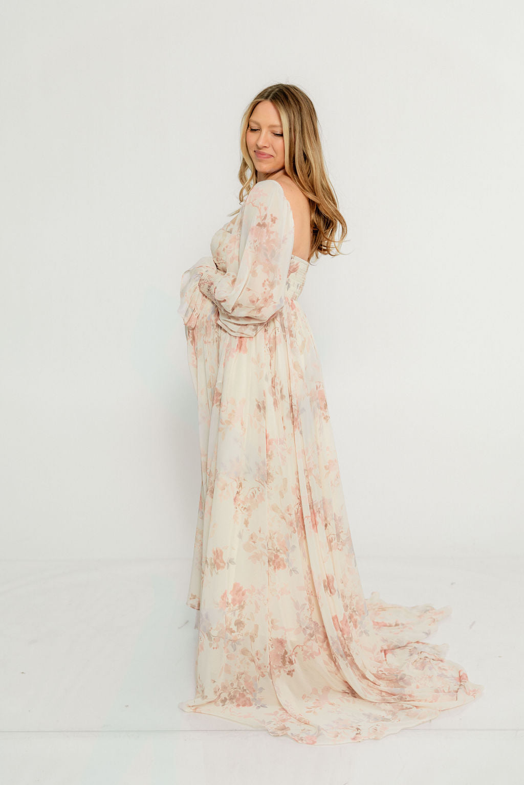 GARMENT DETAILS: Premium floral maxi dress in a lightweight, shirred chiffon. Features a soft bustier-style bodice (no boning), sweetheart neckline, smocked back panel, and sheer long sleeves with elastic cuffs and ruffles. Sleeves can be worn on or off the shoulder. Finished with a sweeping maxi-length skirt and dramatic train. Lined.
